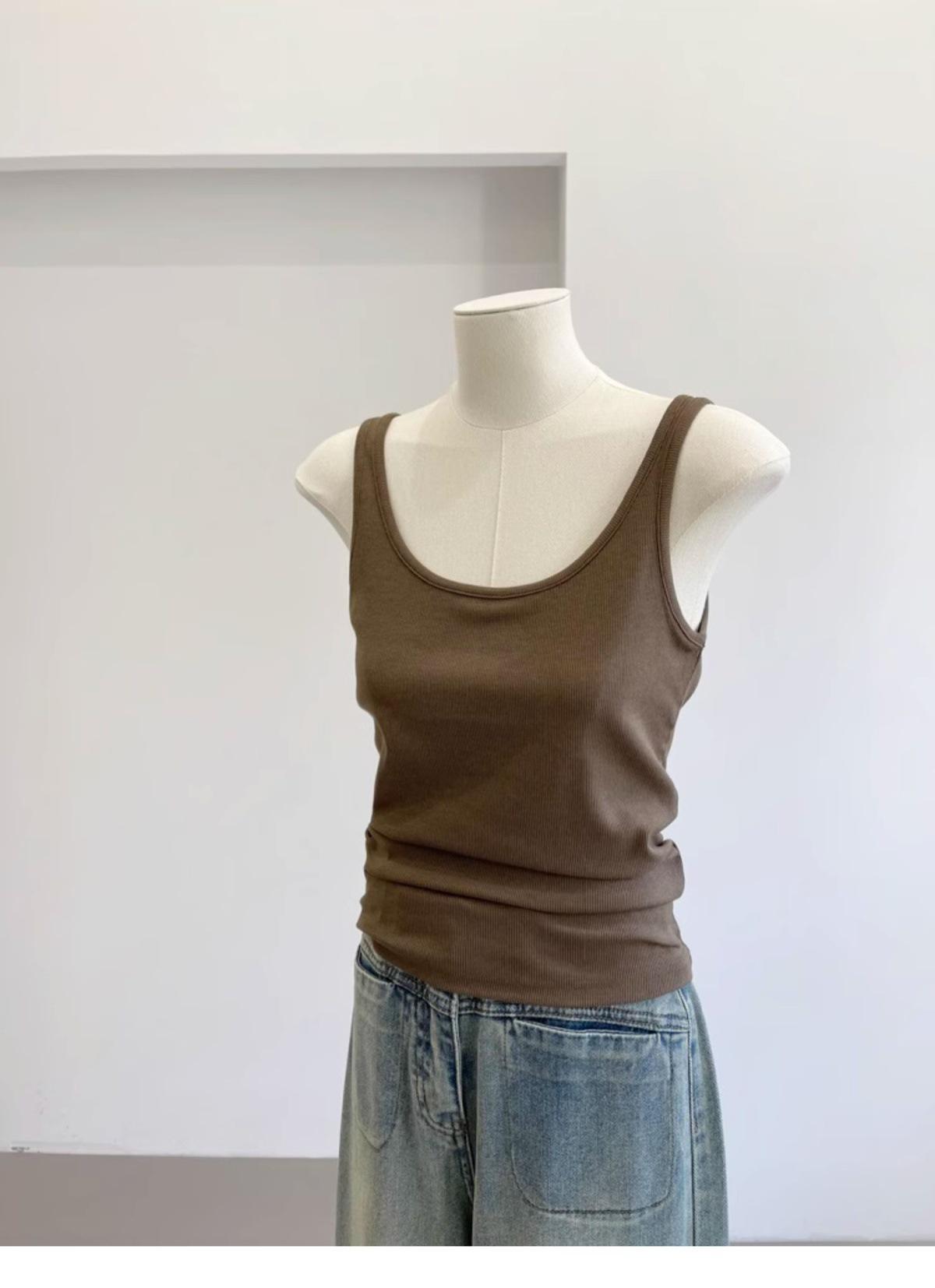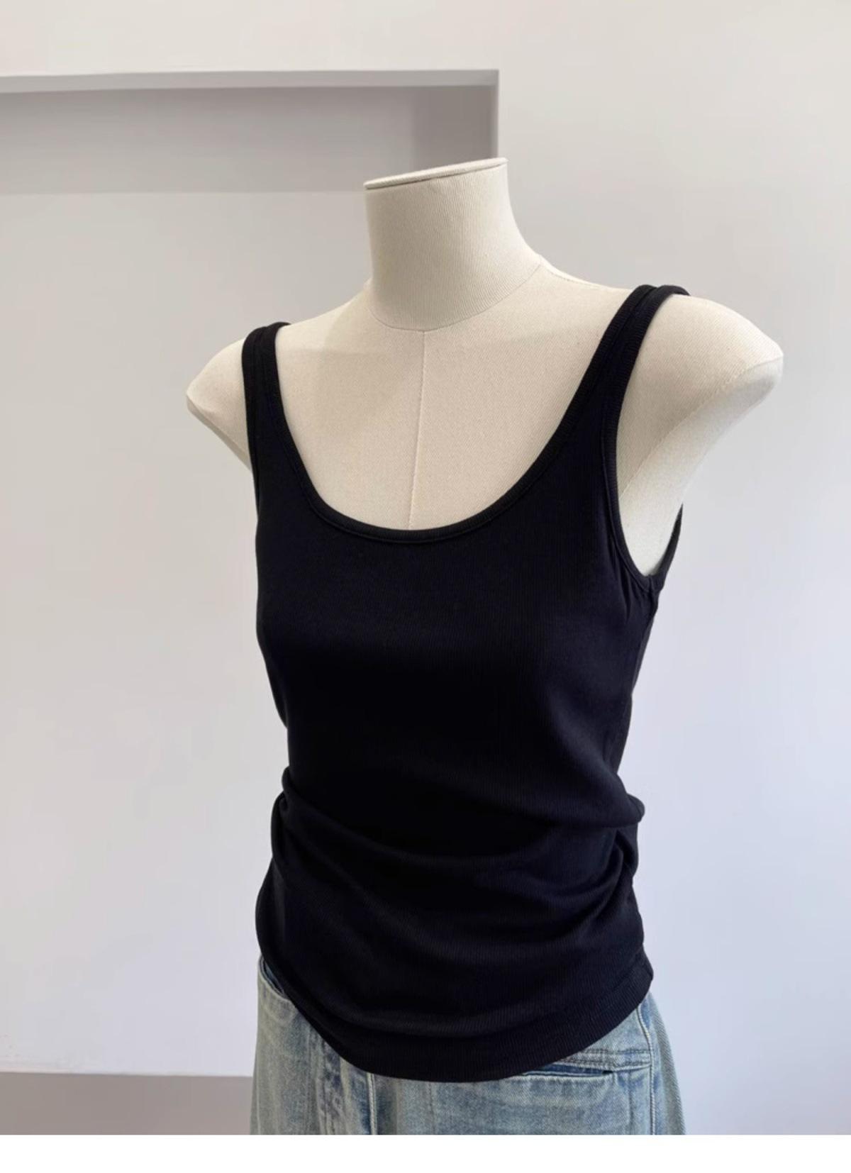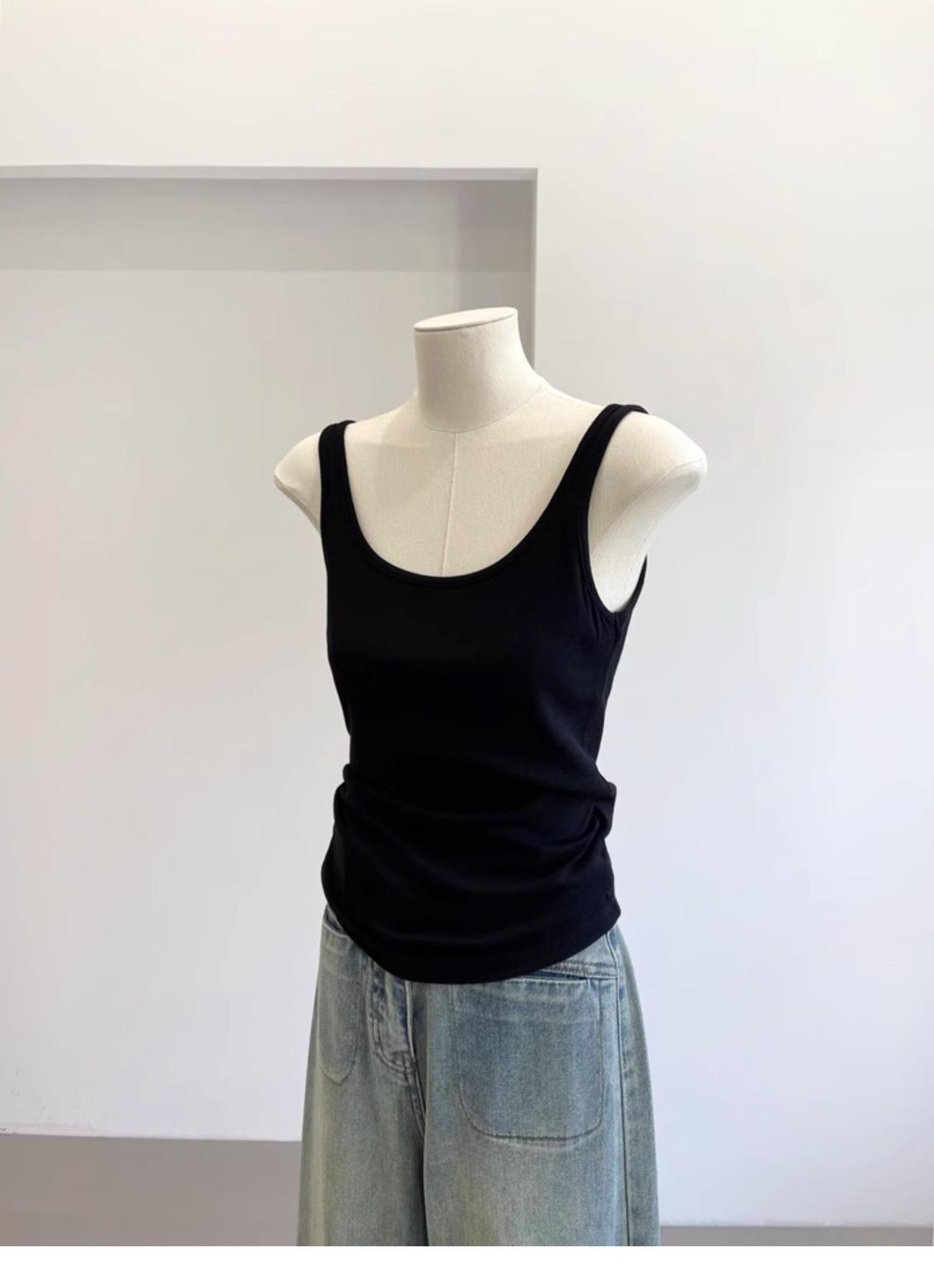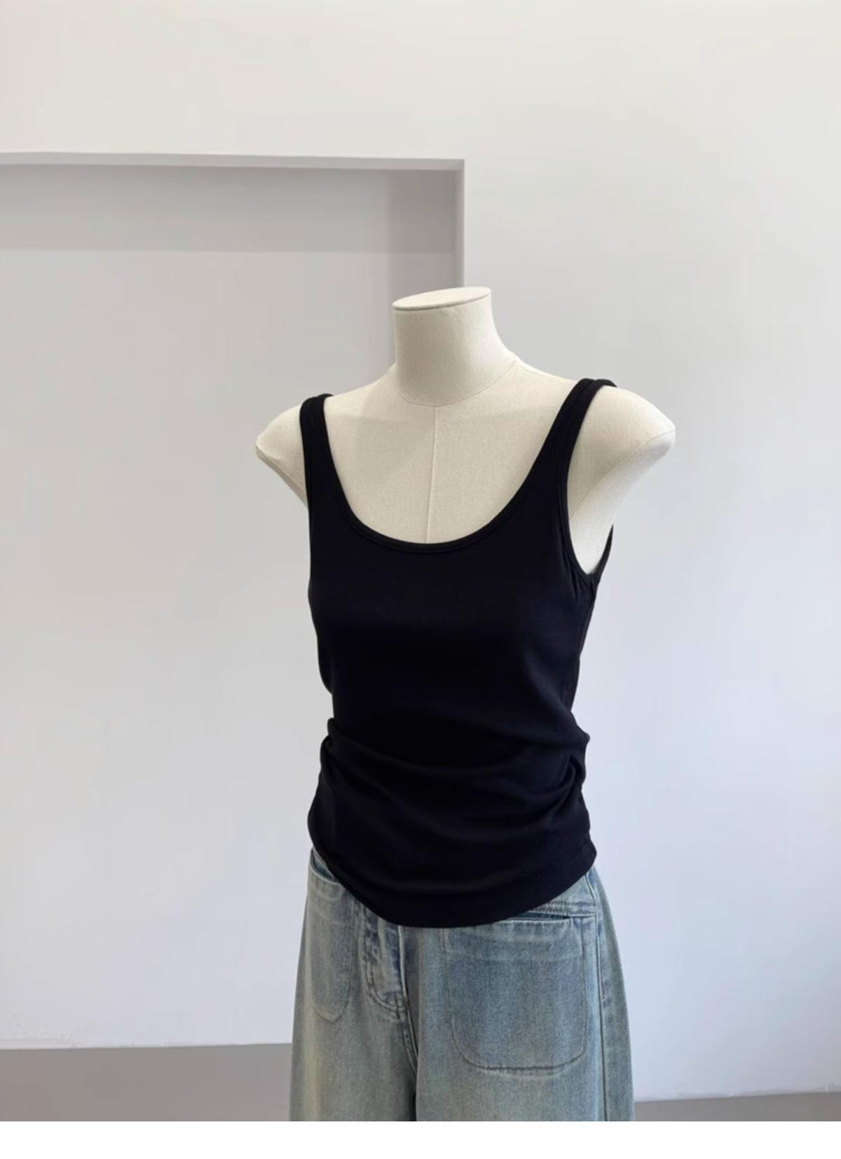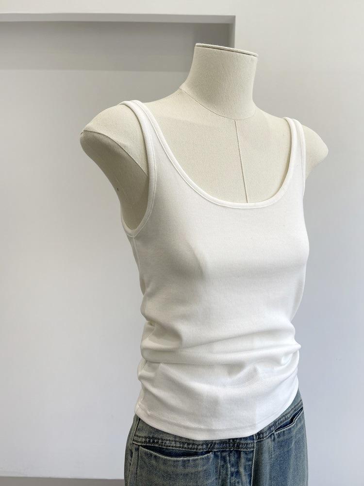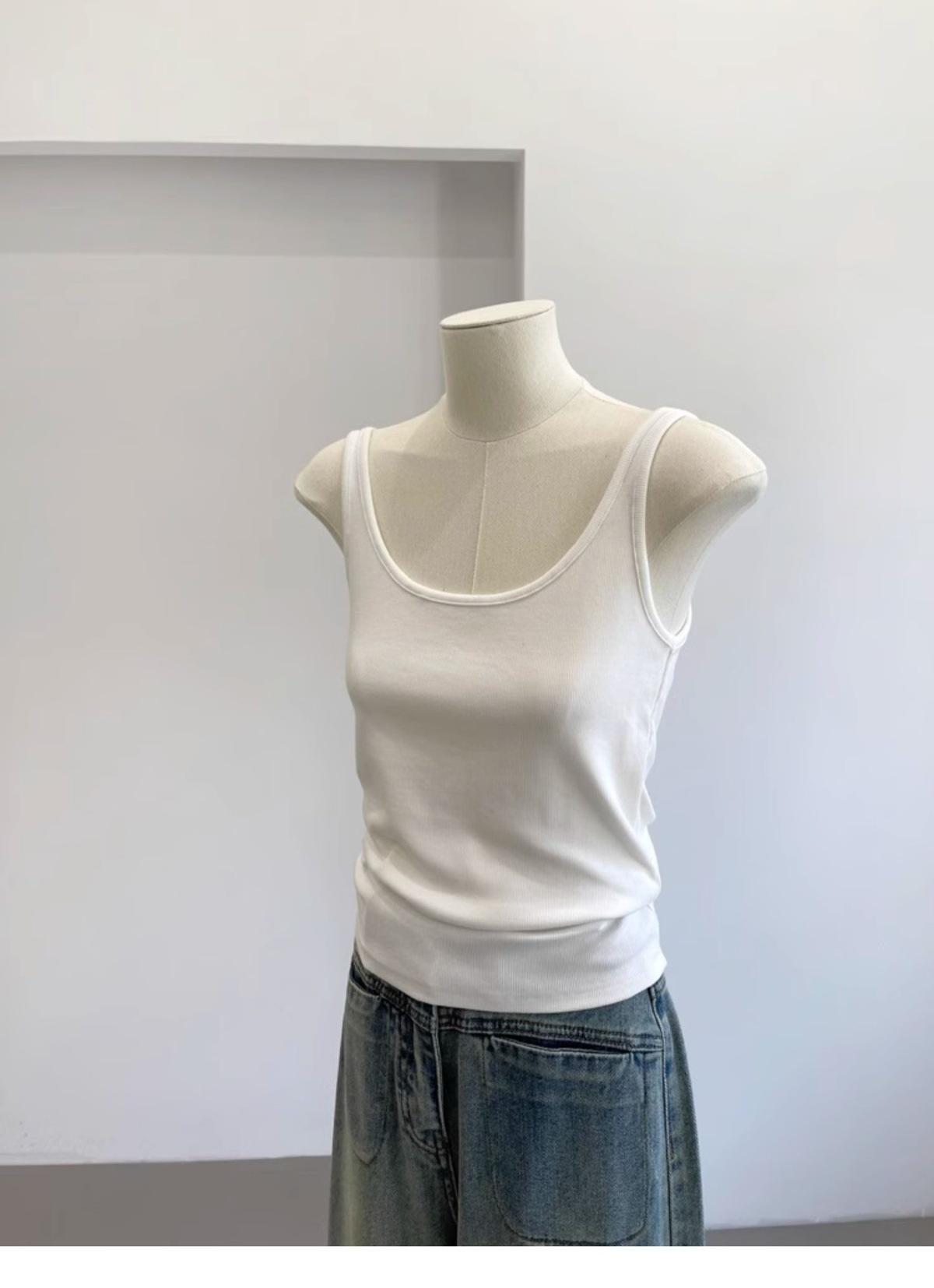 Camisola de Algodón Acanalado con Cuello en U Gris para Mujer, Verano Versión Coreana, Top Básico Blanco Adelgazante Versátil Sencillo sin Mangas