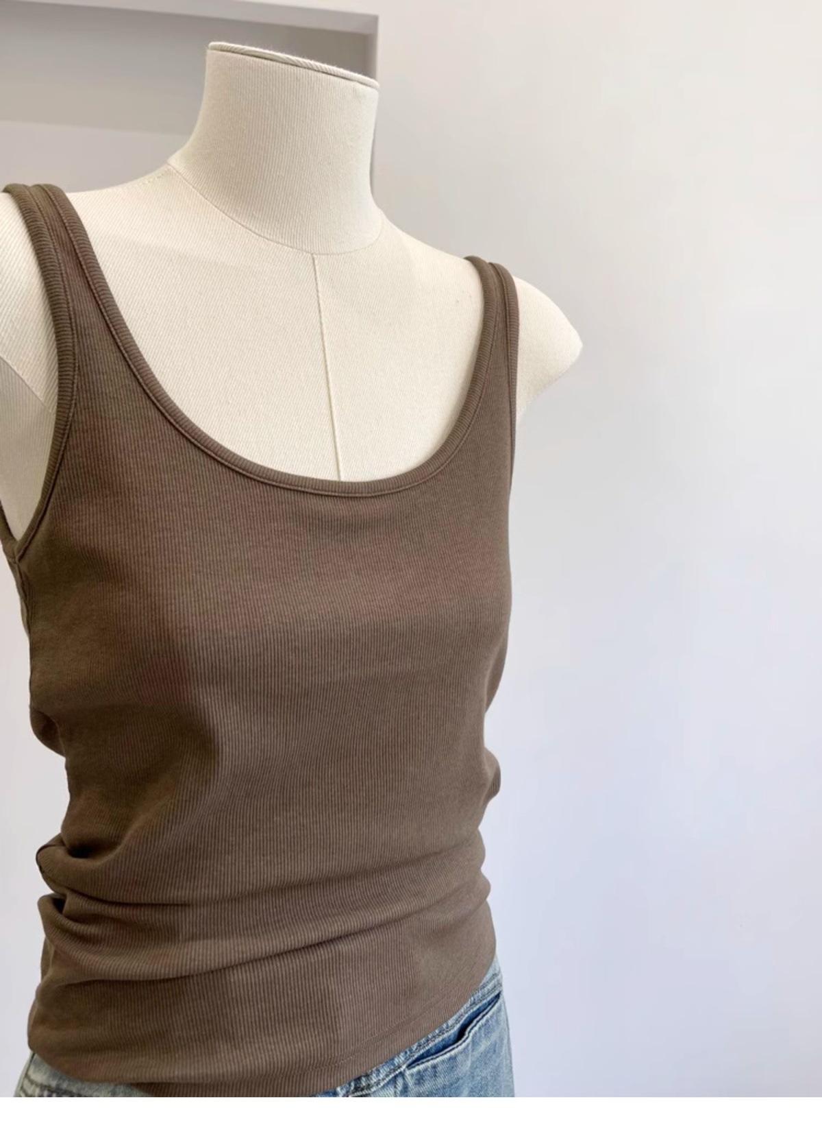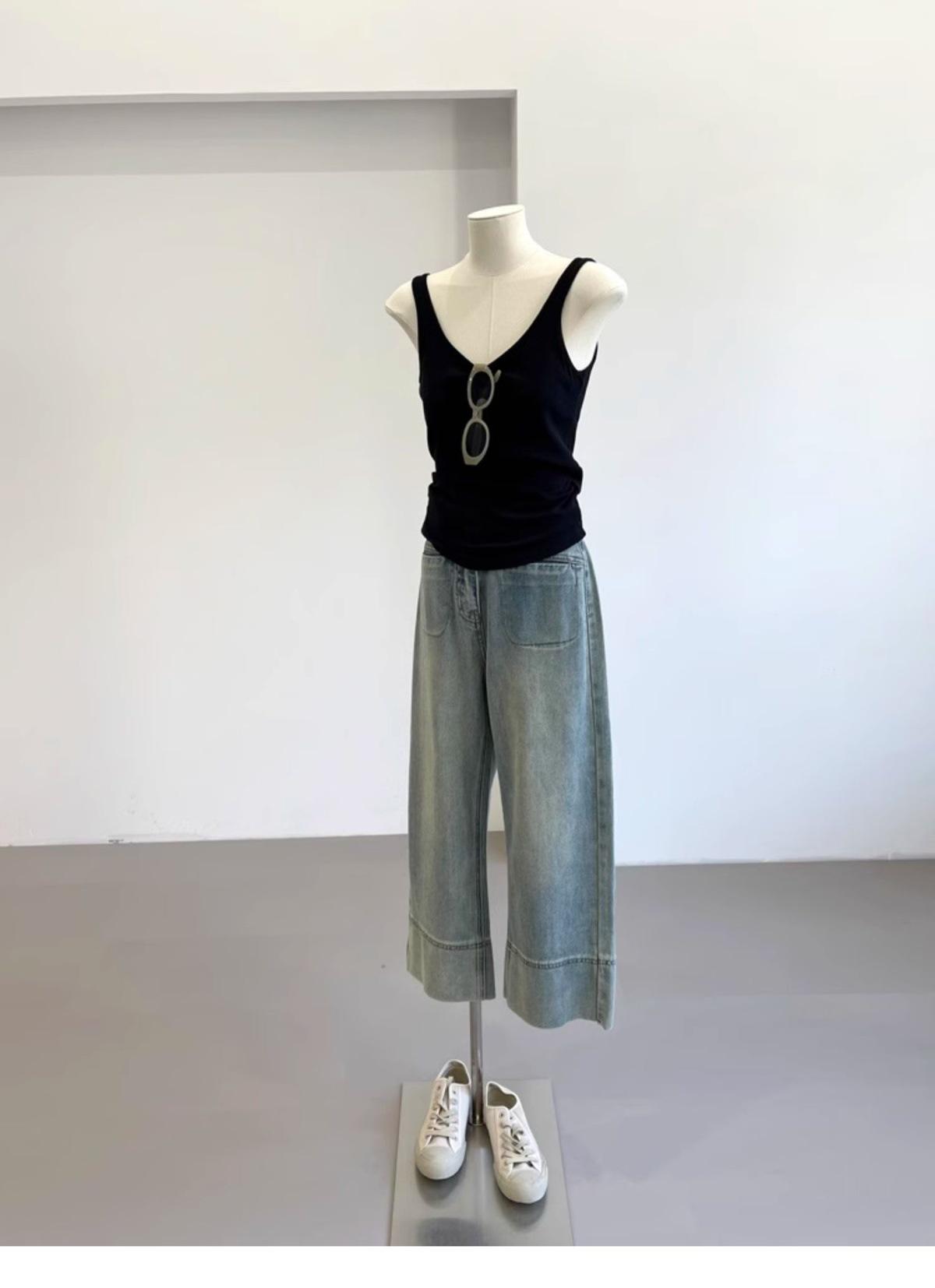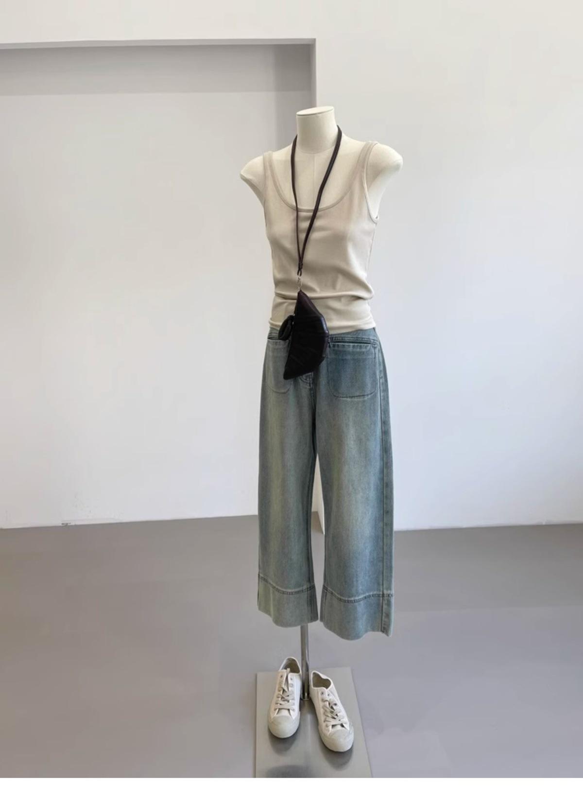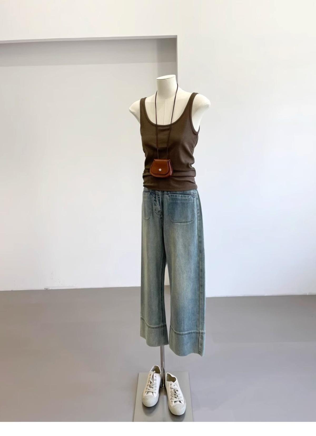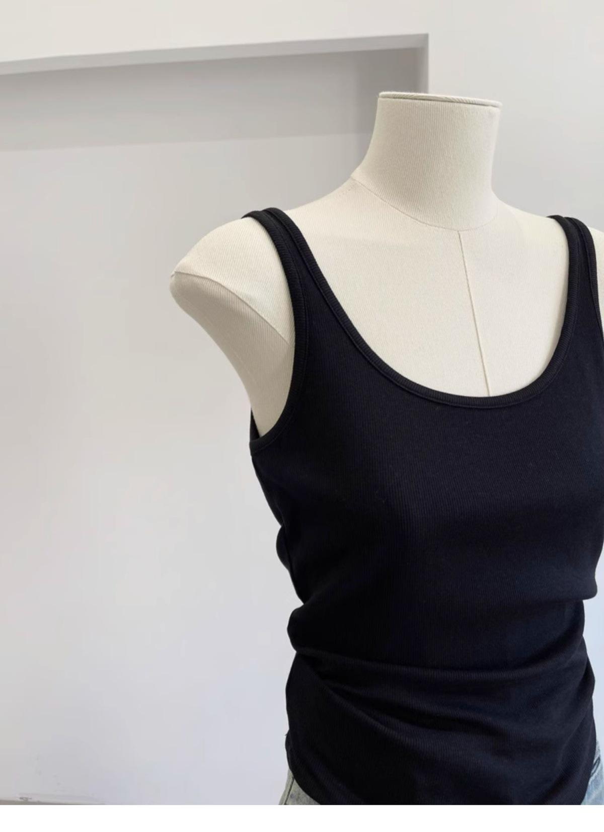 Camisola de Algodón Acanalado con Cuello en U Gris para Mujer, Verano Versión Coreana, Top Básico Blanco Adelgazante Versátil Sencillo sin Mangas
