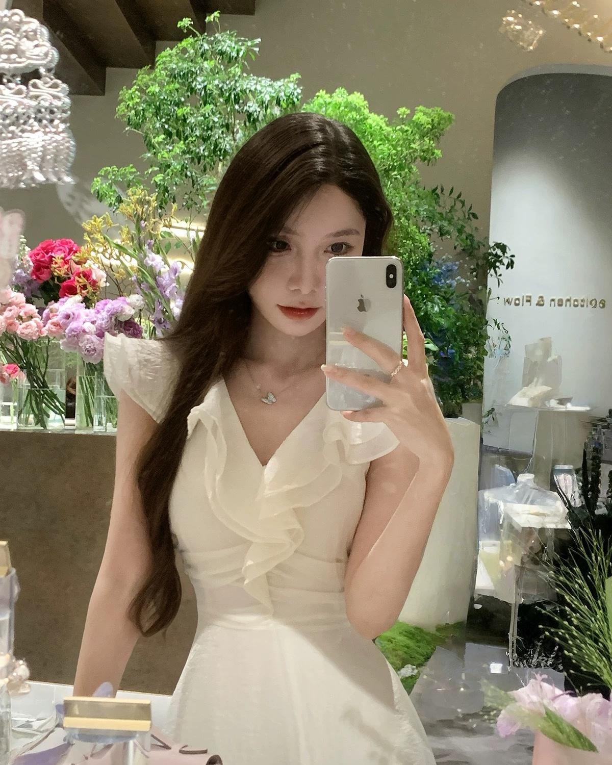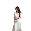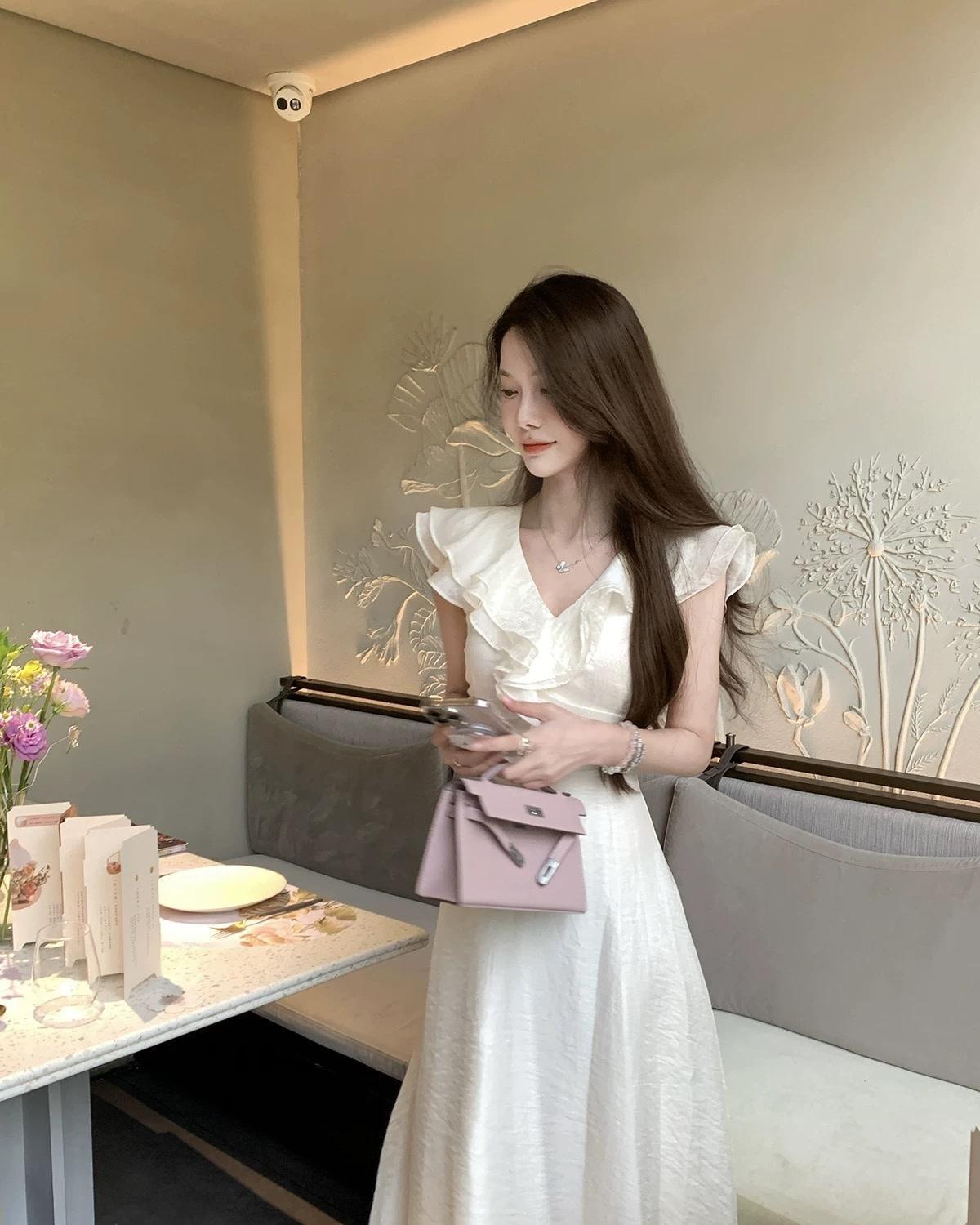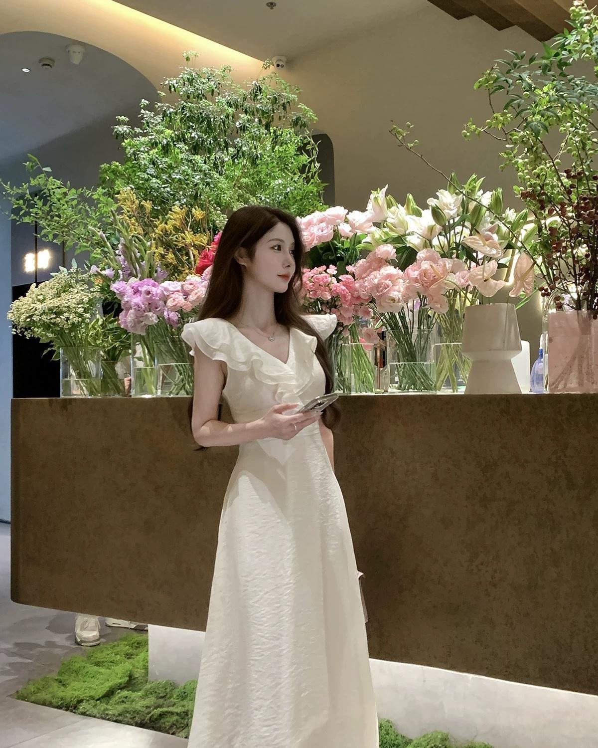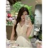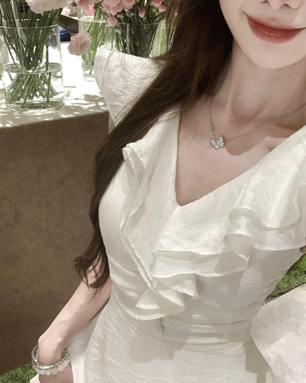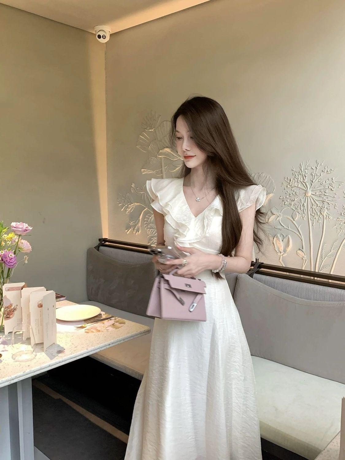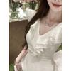 Diseño Francés Nicho Cuello en V Cintura Adelgazante Look Vestido para Mujer 2025 Verano Nuevo Falda Larga Blanca con Volantes