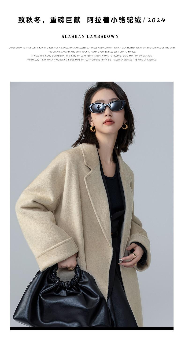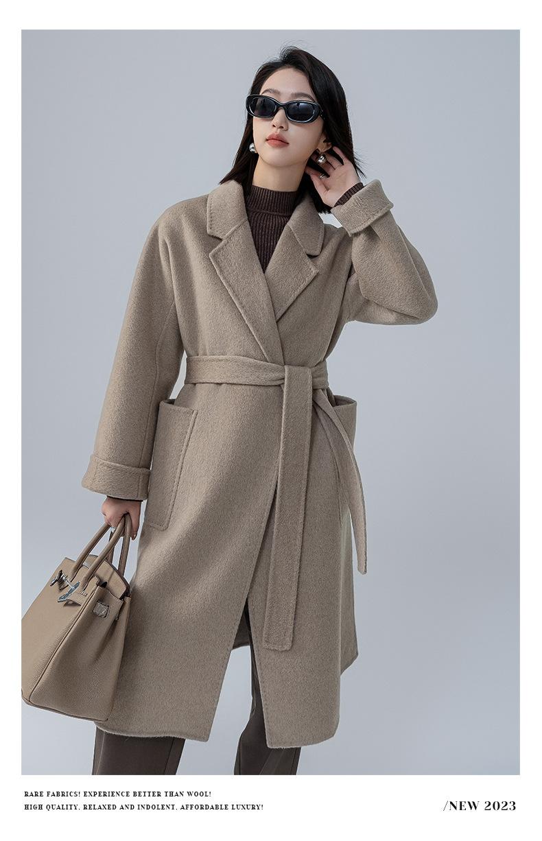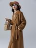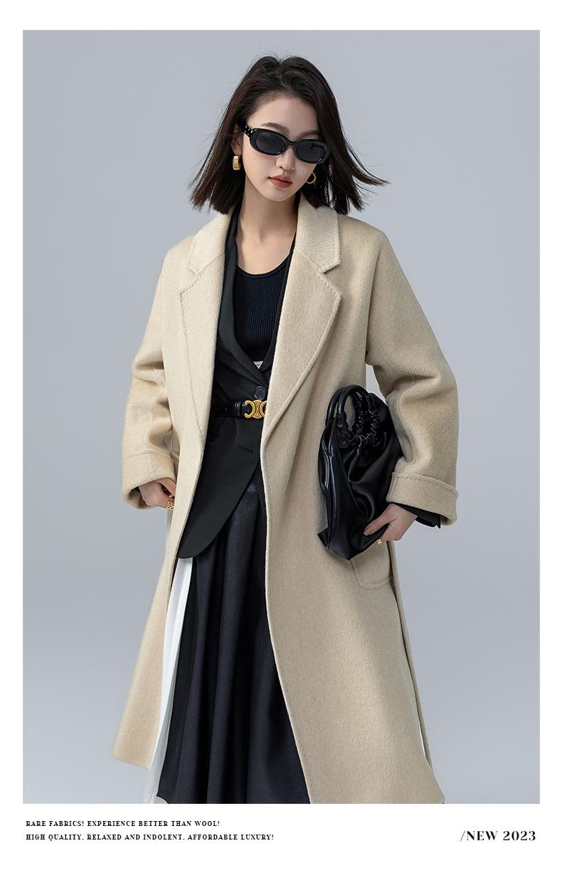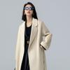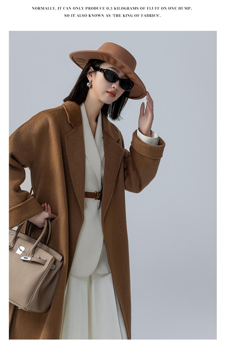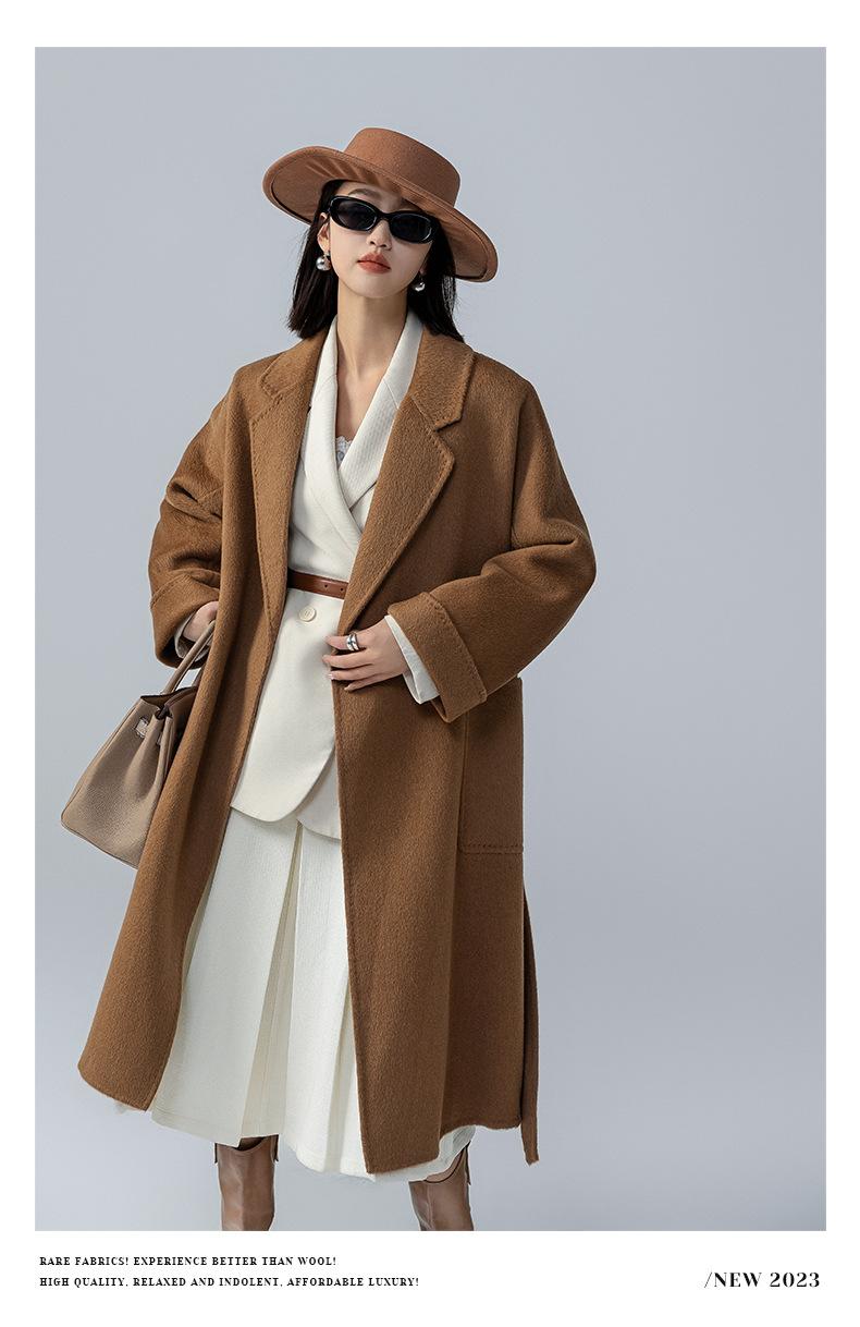 Otoño e invierno 2024 nuevo traje de terciopelo camel con cuello de solapa, paño de lana de doble cara, holgado, color sólido con bolsillo, abrigo largo de encaje para mujer