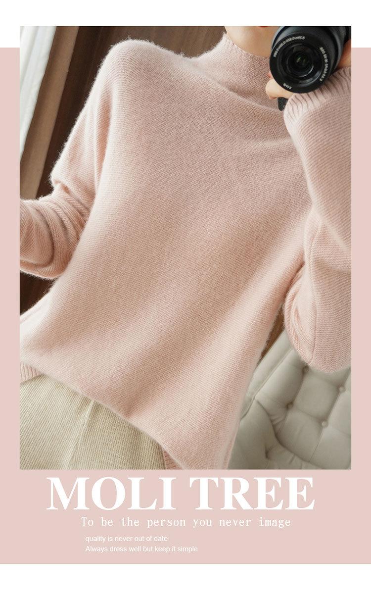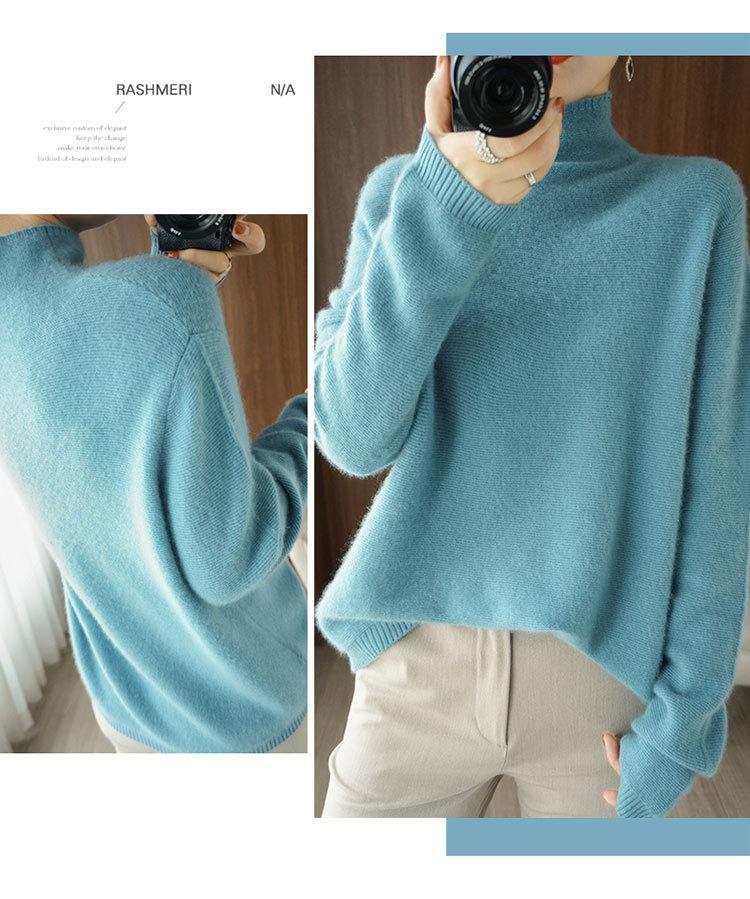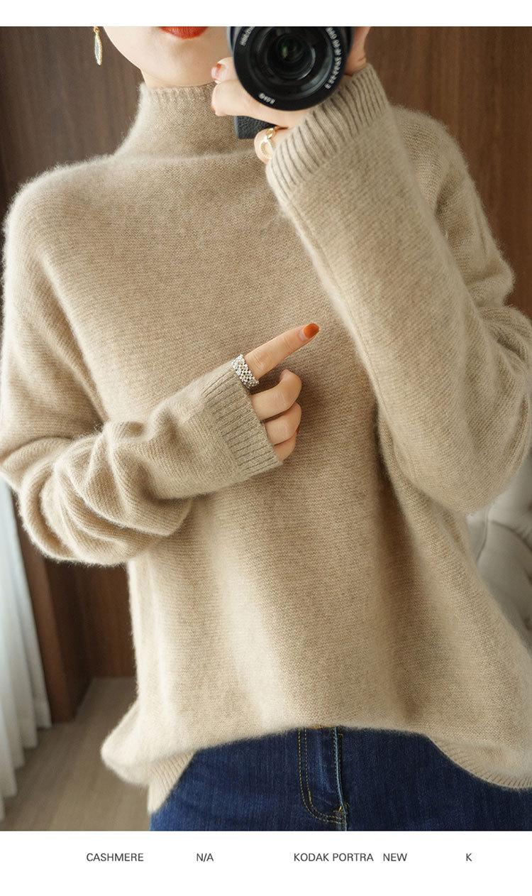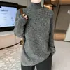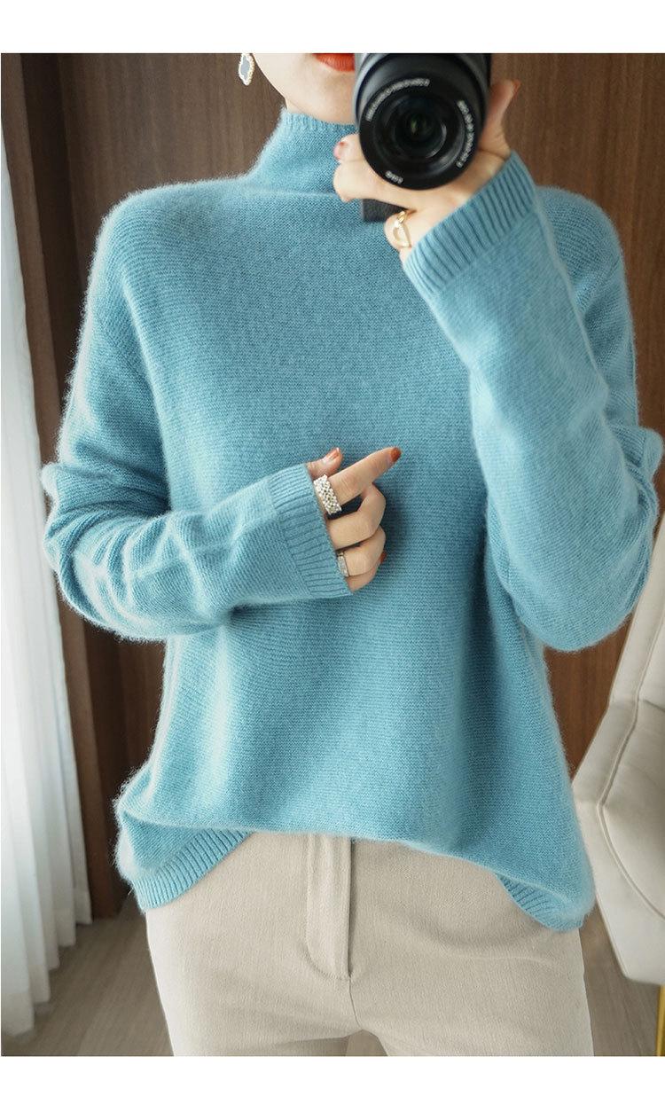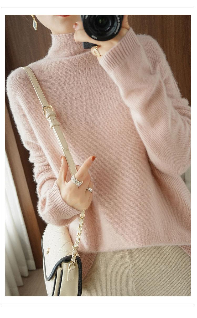 Otoño e Invierno 2024 Nuevo Estilo Holgazán Lana Pura Cuello Semialto Tejido Hombro Manga Larga Color Sólido Camisa Base para Mujer