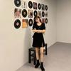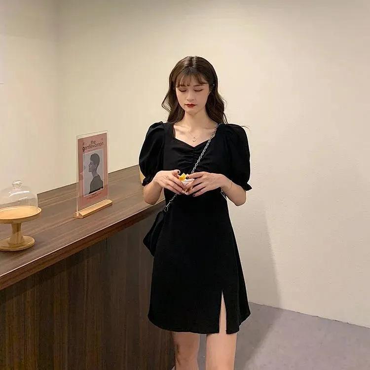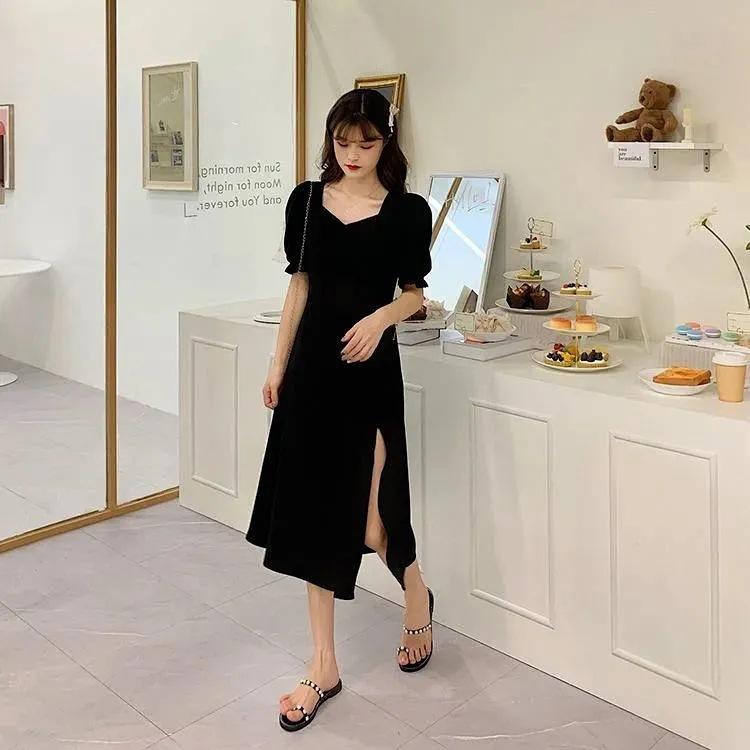 Vestido adelgazante de talla grande para hermana gordita, elegante, con cuello cuadrado, cintura ajustada, abertura, estilo francés, negro, estilo Hepburn, corte A