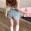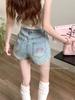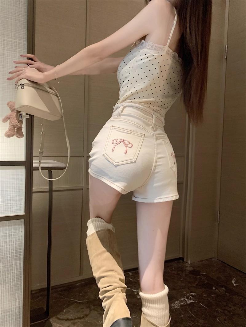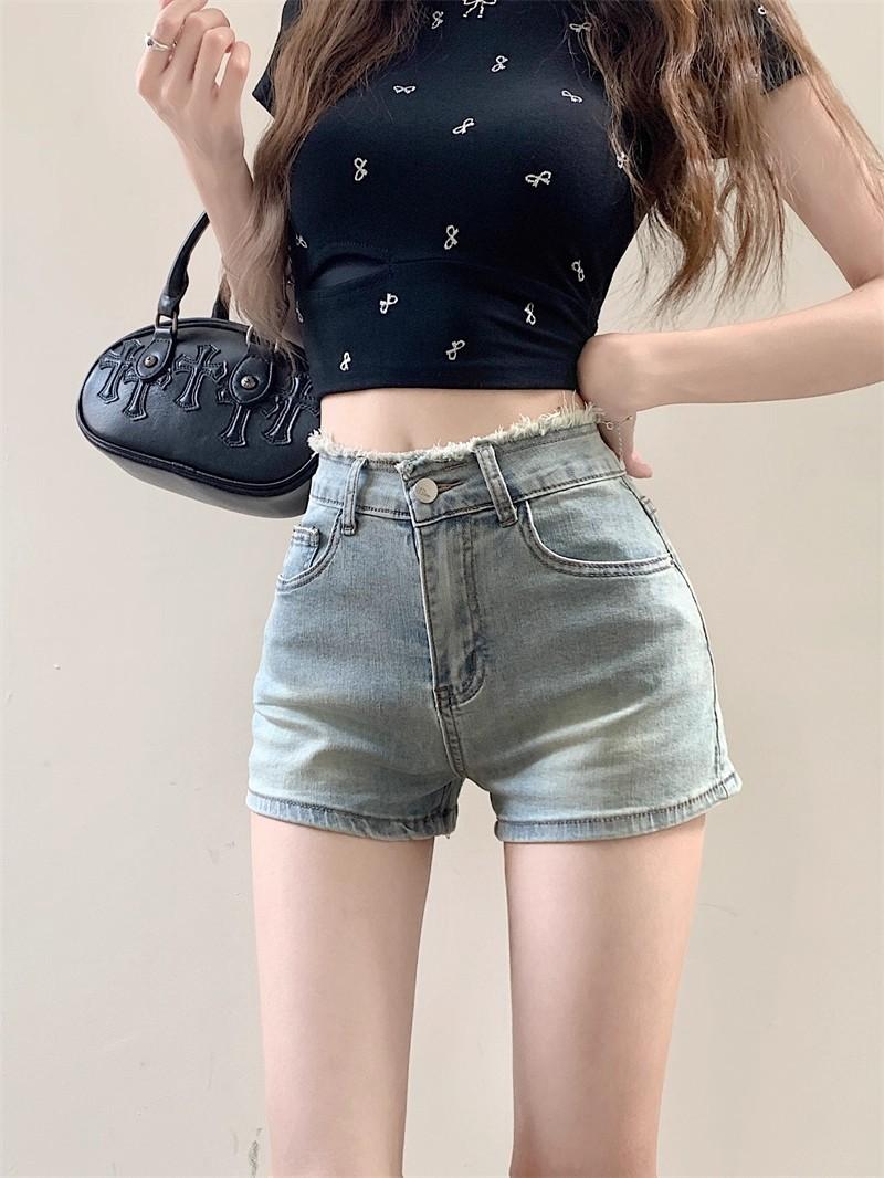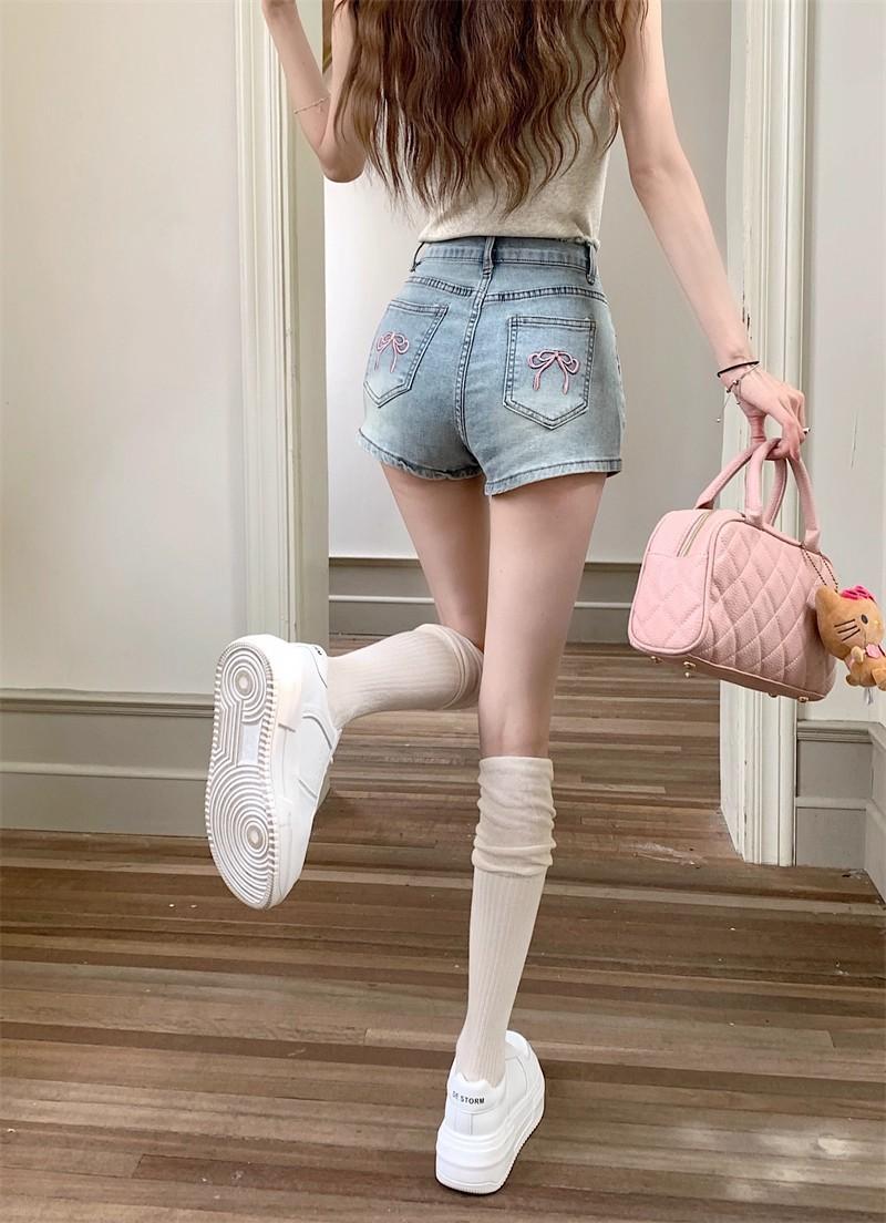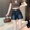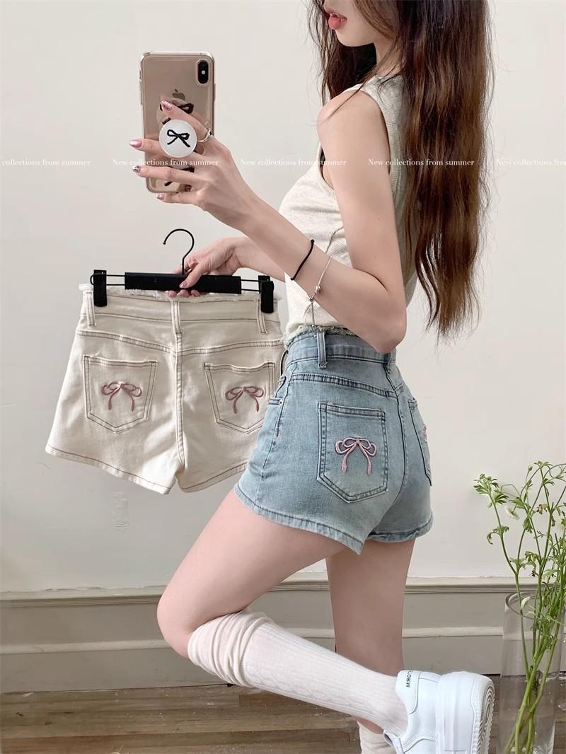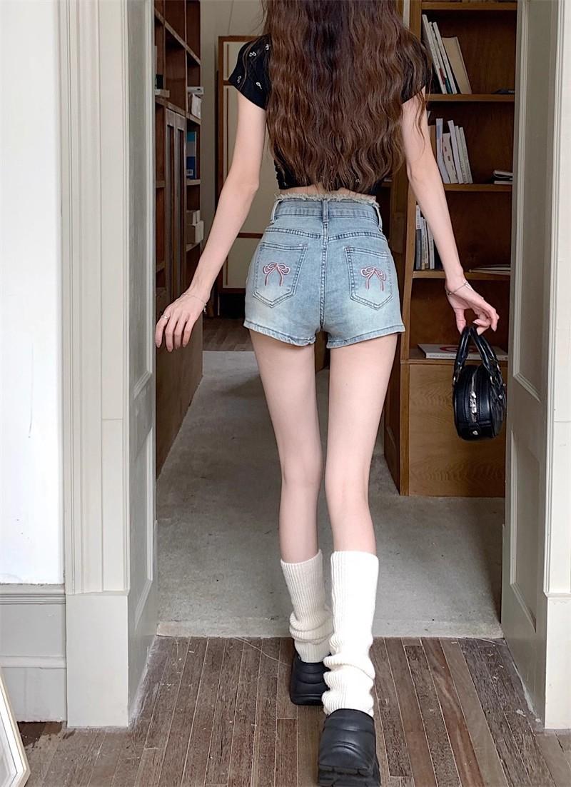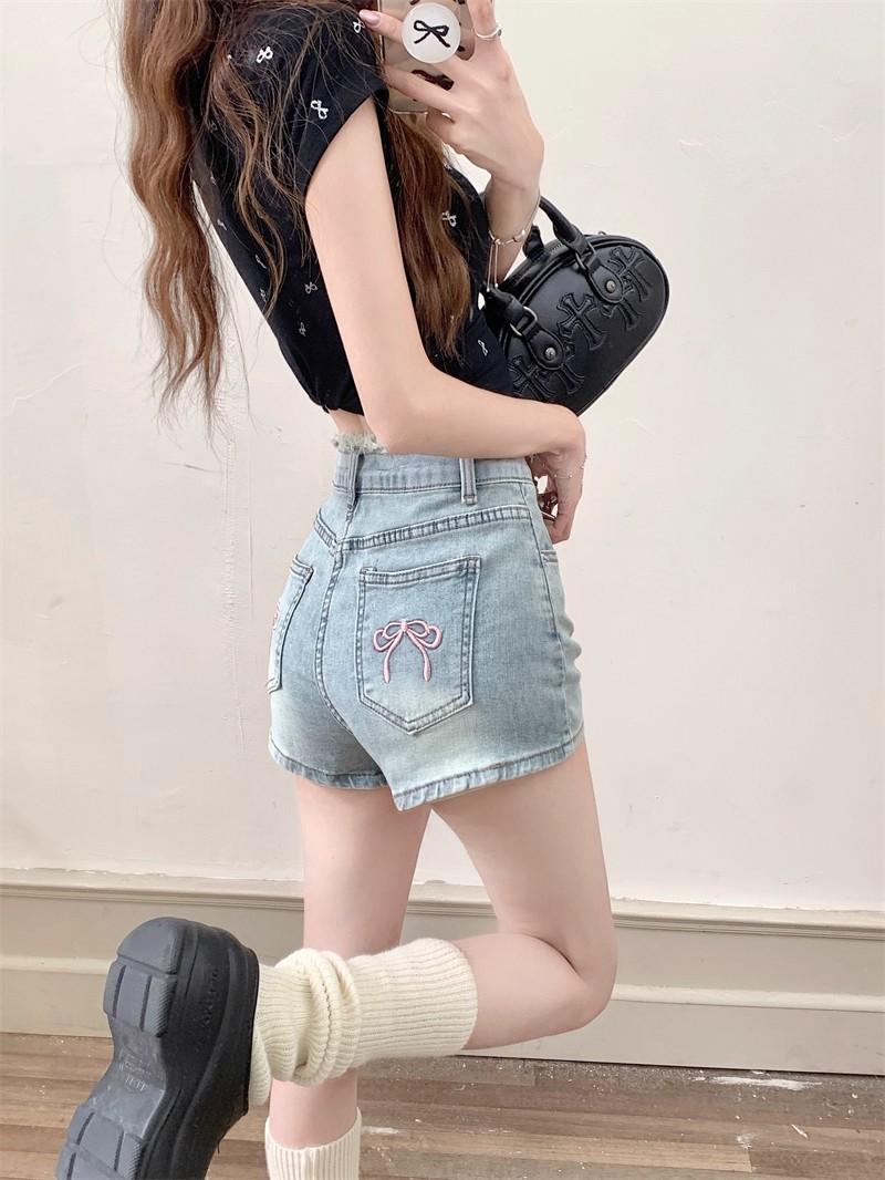 Shorts de mezclilla picantes americanos para mujer, verano nuevo, cintura alta, talla grande, bolsillo, bordado, línea A, pantalones supercortos ajustados