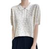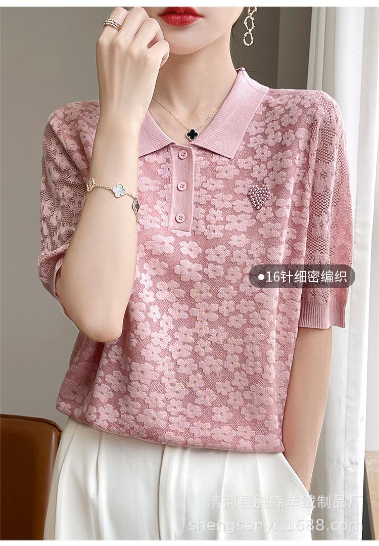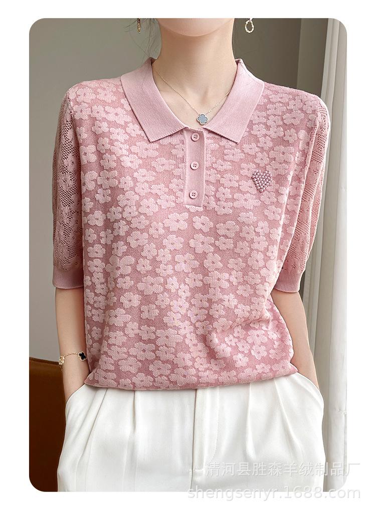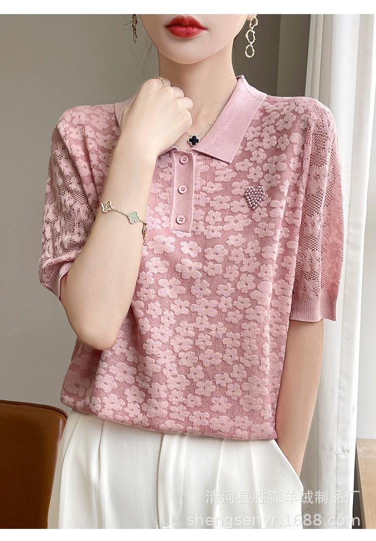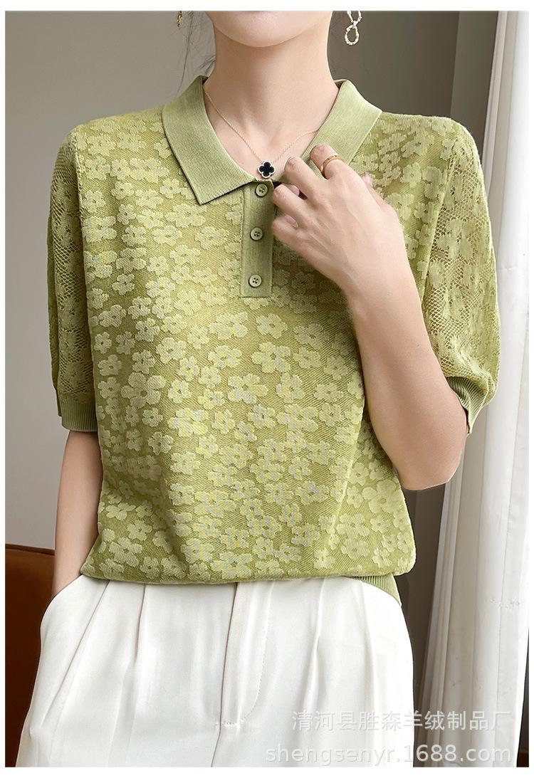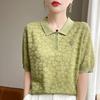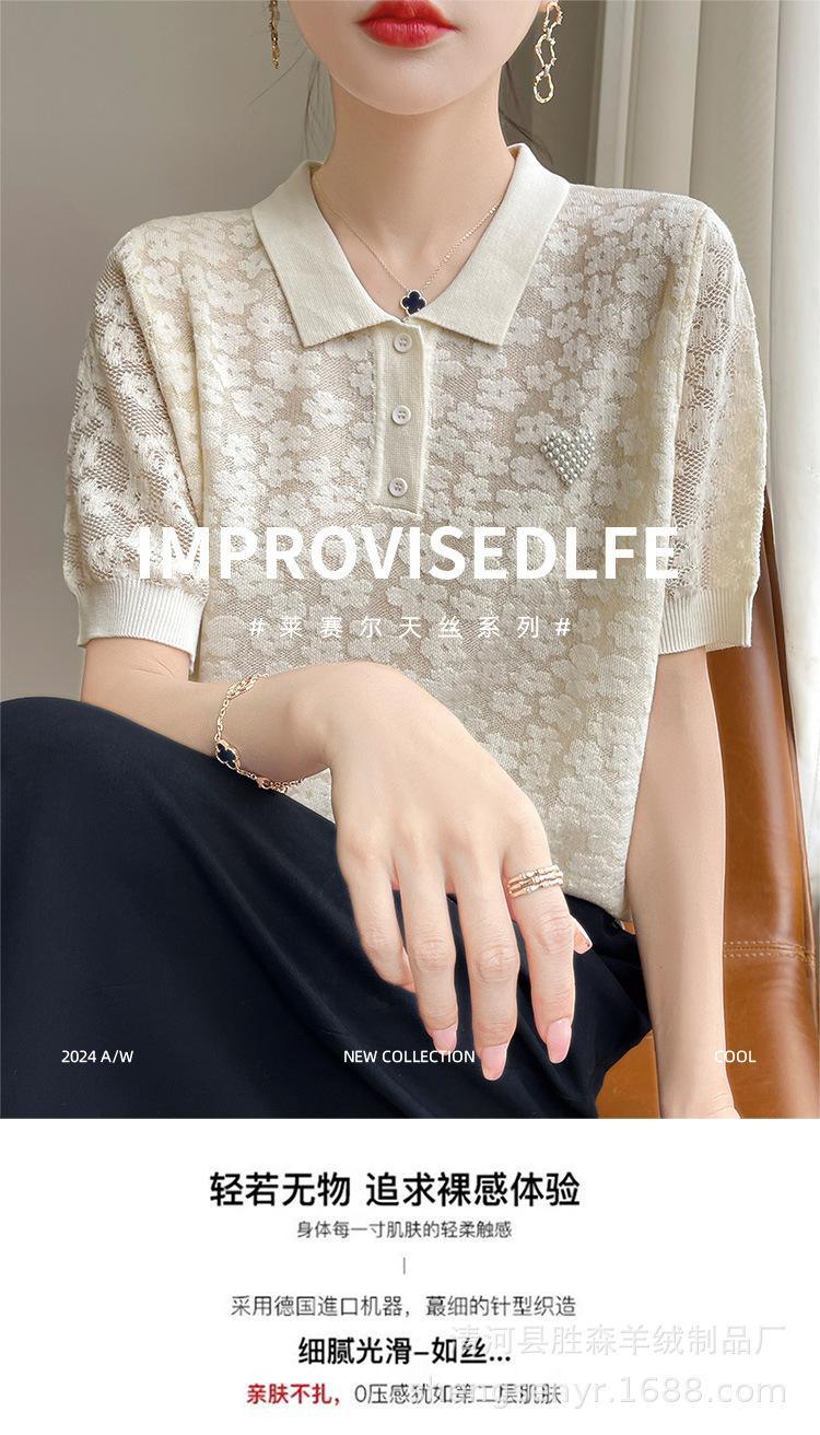 Suéter de cuello polo de tencel lyocell para mujer, manga corta, suelto, jacquard, floral, novedad de verano de 2024