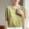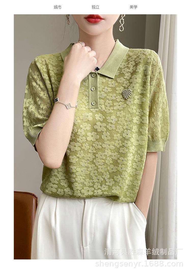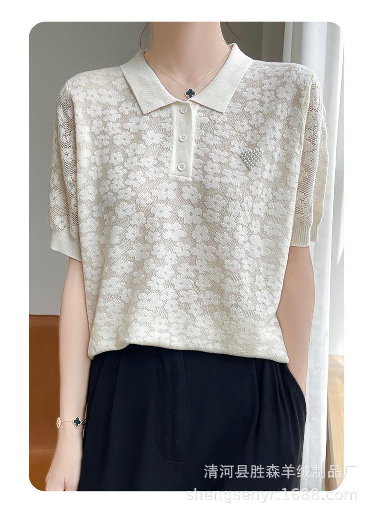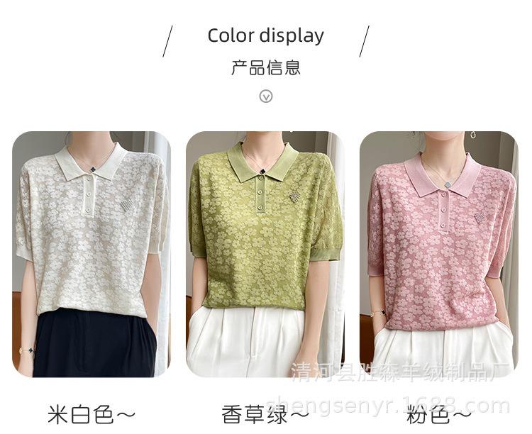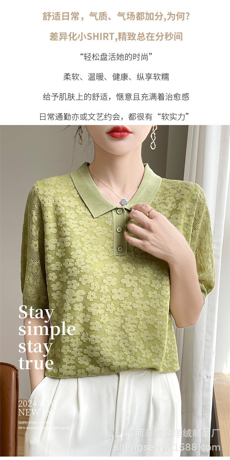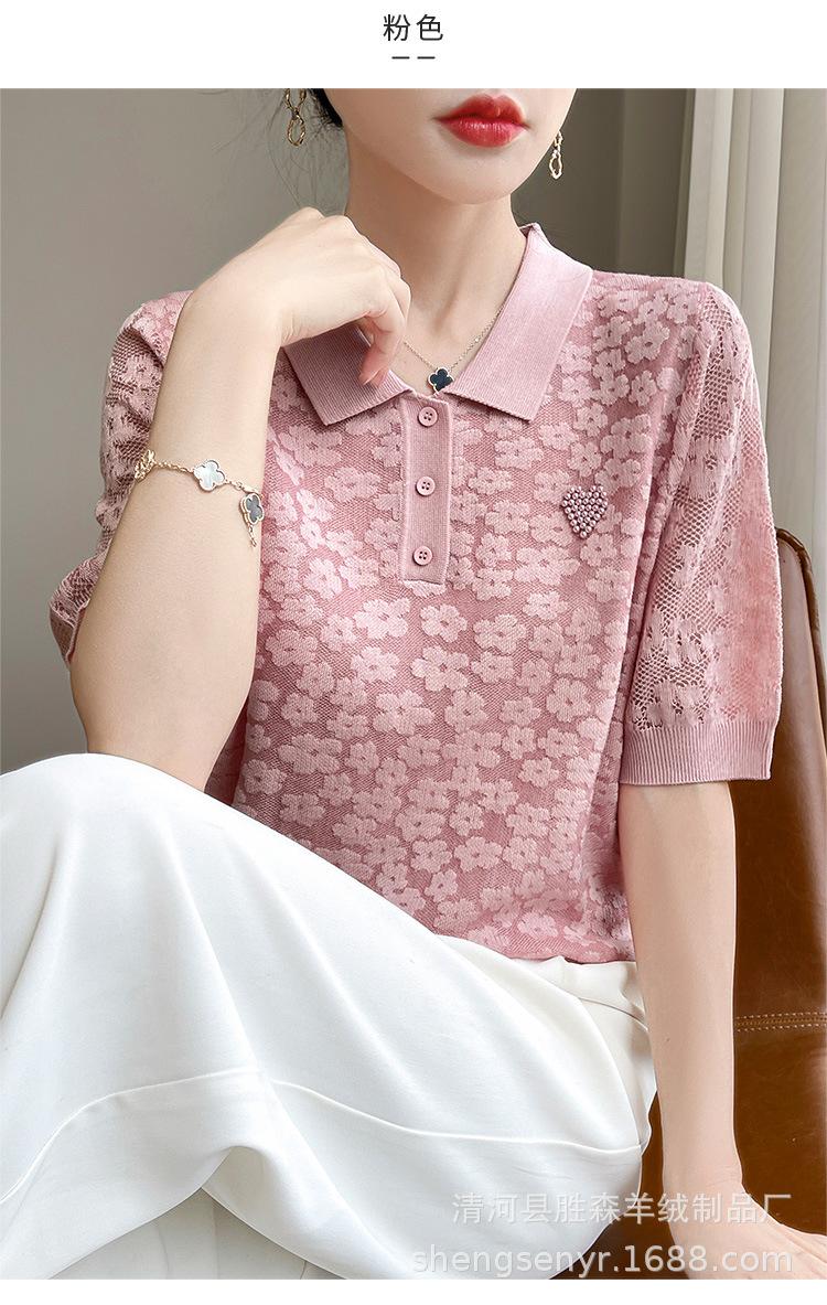 Suéter de cuello polo de tencel lyocell para mujer, manga corta, suelto, jacquard, floral, novedad de verano de 2024