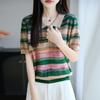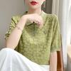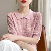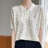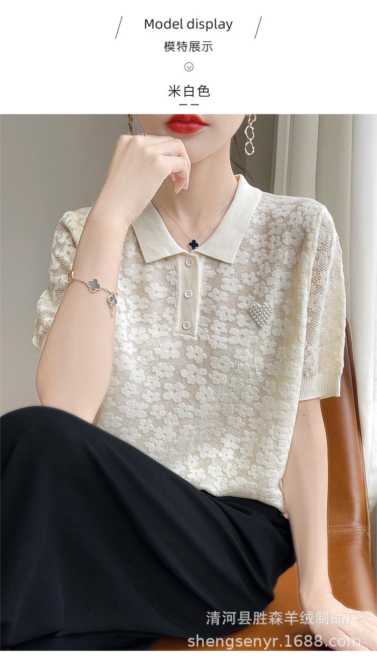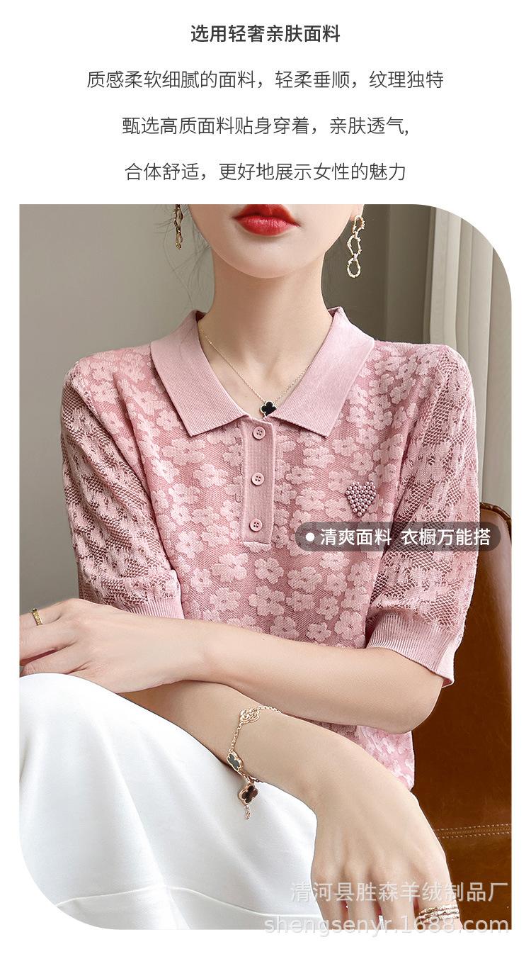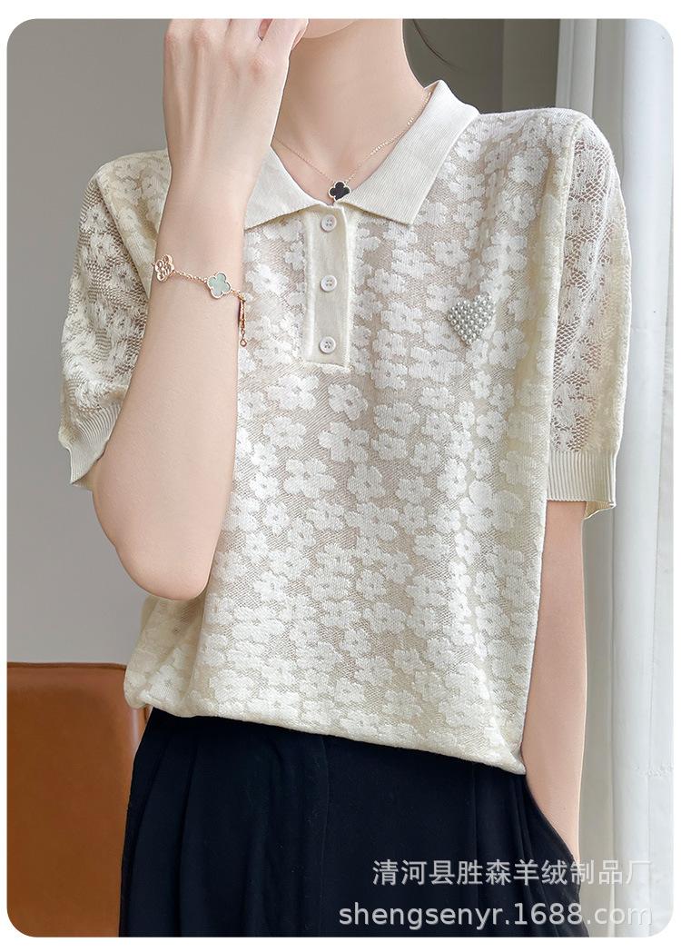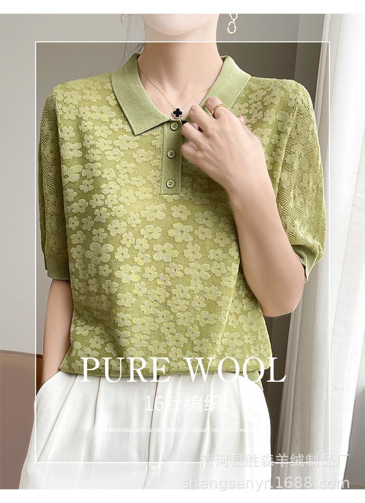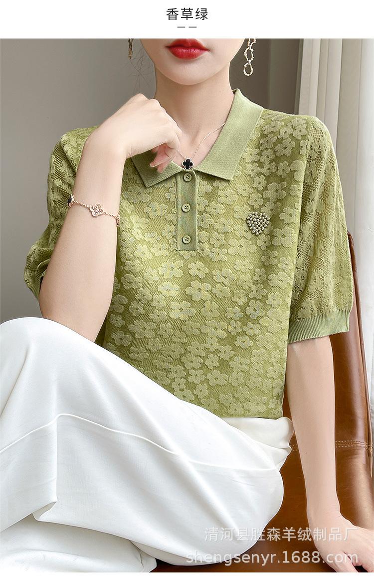 Suéter de cuello polo de tencel lyocell para mujer, manga corta, suelto, jacquard, floral, novedad de verano de 2024