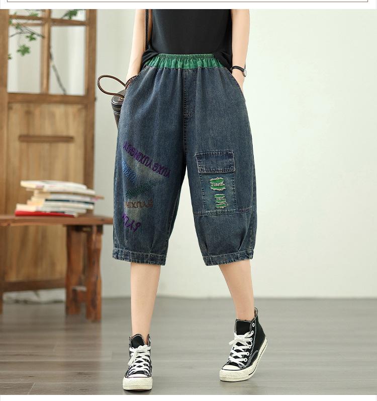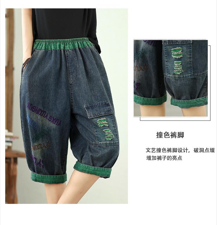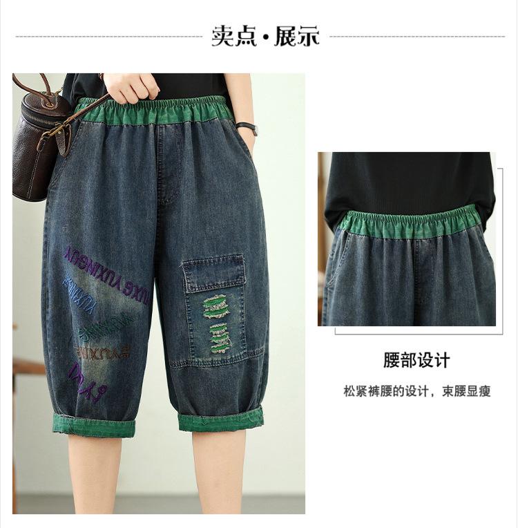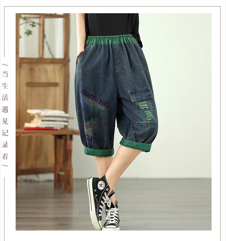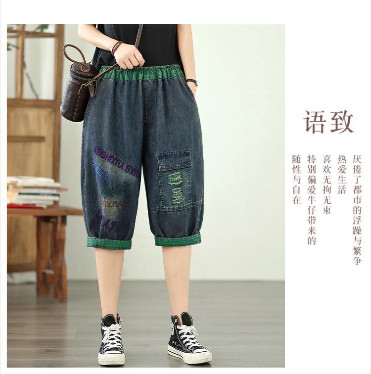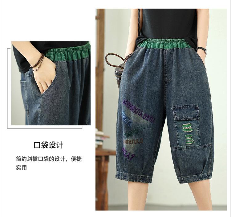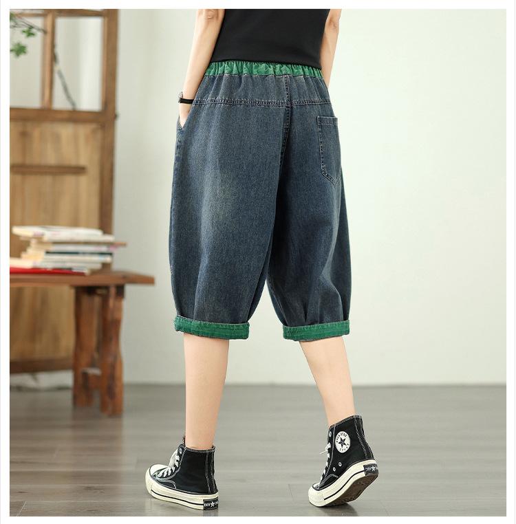 Pantalones de 6 puntos de mezclilla suave delgada bordada, holgados, de cintura alta, versátiles, con aspecto adelgazante, tipo harén, casuales para mujer