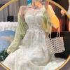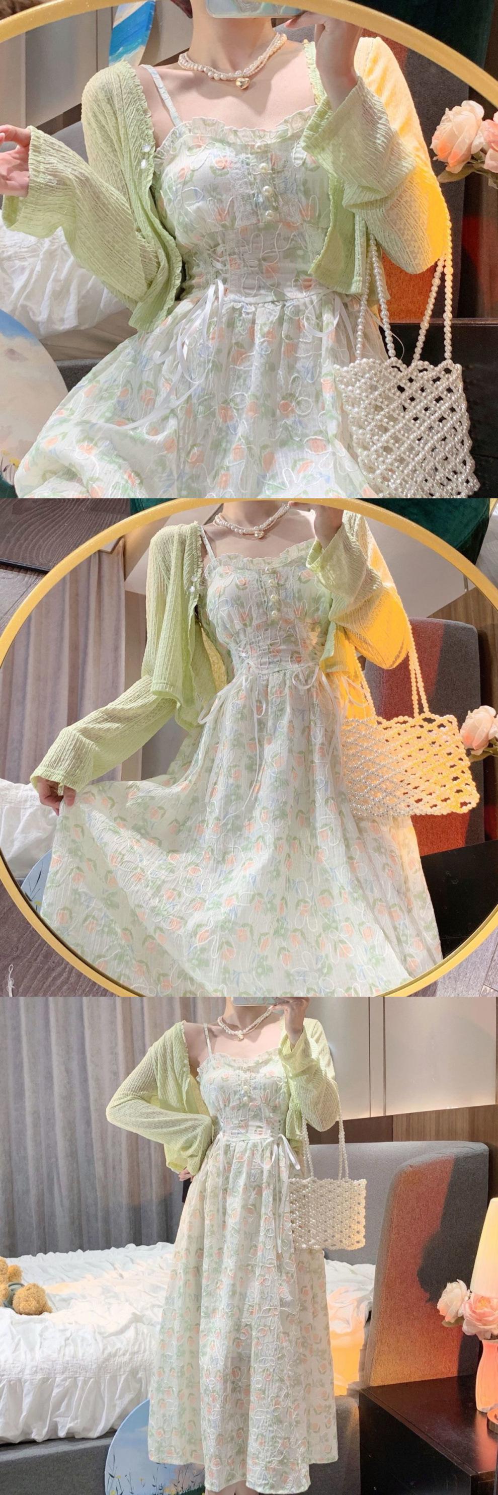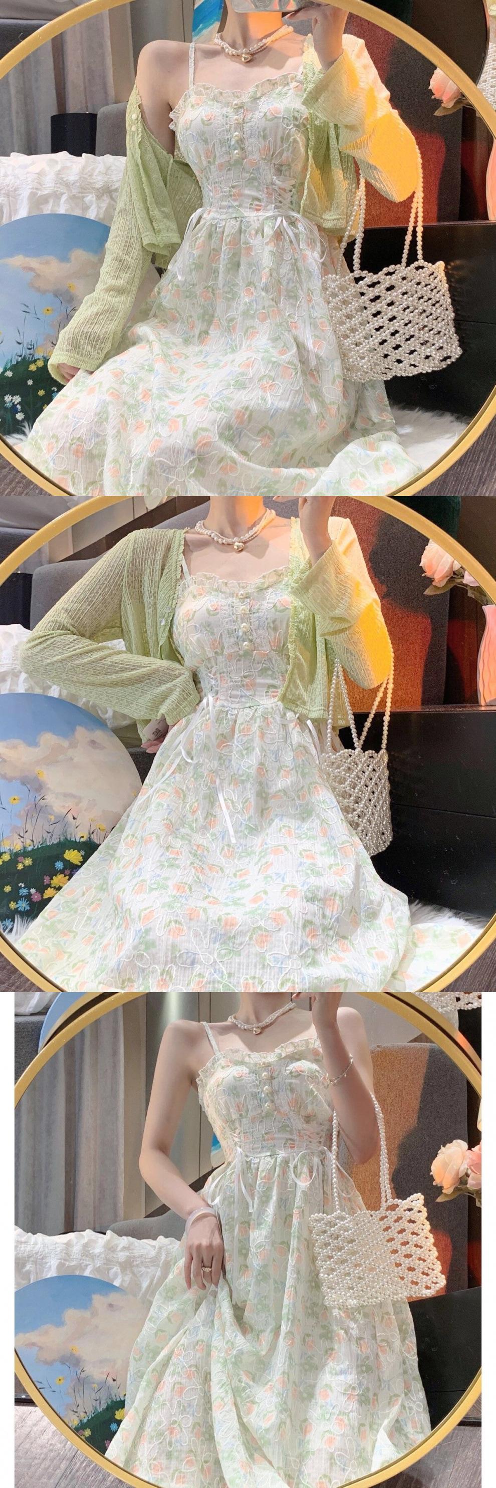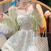 Traje de Vestido con Tirantes Estilo Hermana Real para Mujer Talla Grande Cárdigan Delgado Protección Solar para Mujer Falda Adelgazante de Cintura Conjunto de Dos Piezas