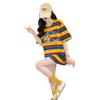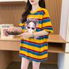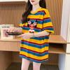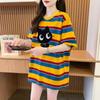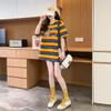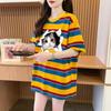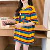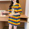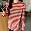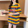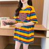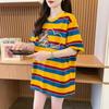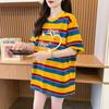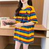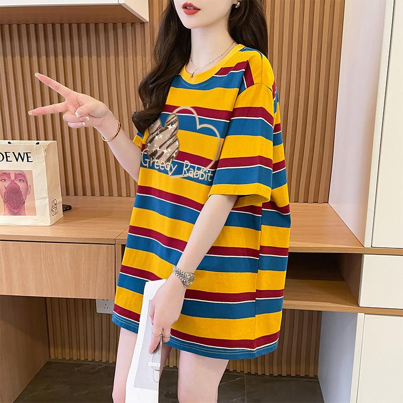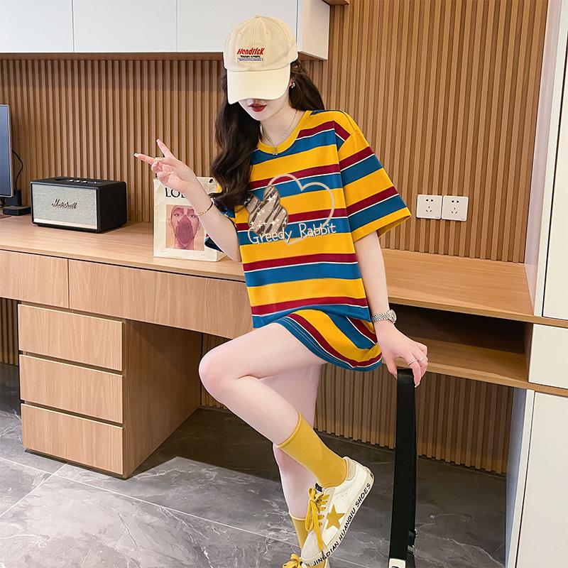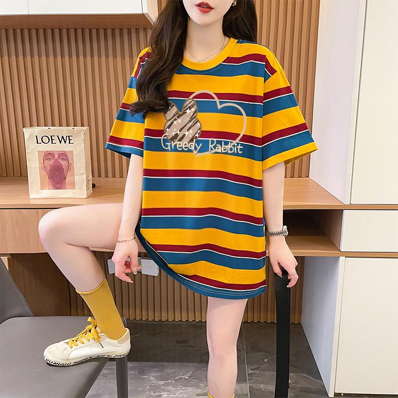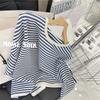 Camiseta de Rayas de Largo Medio Moderna y Elegante para Mujer con Diseño Americano Retro de Bloques de Color, Corte Holgado y Top que Cubre el Abdomen