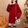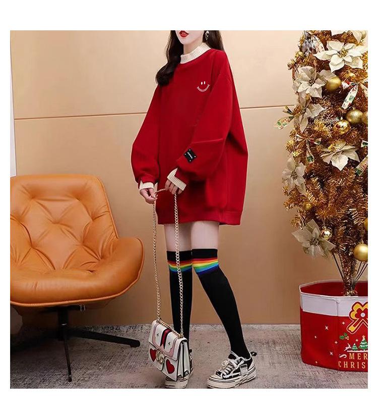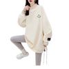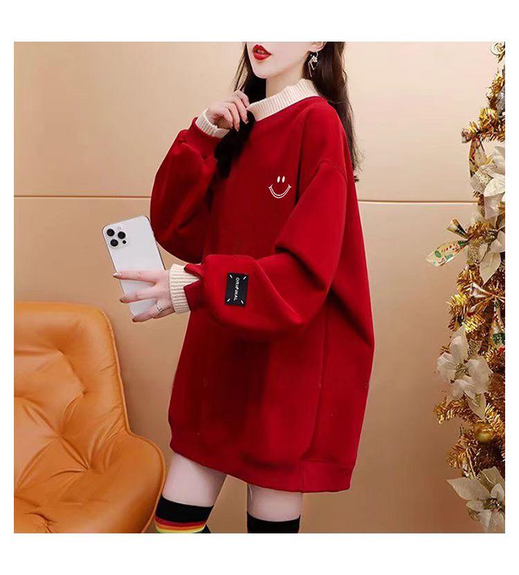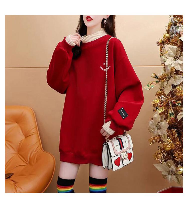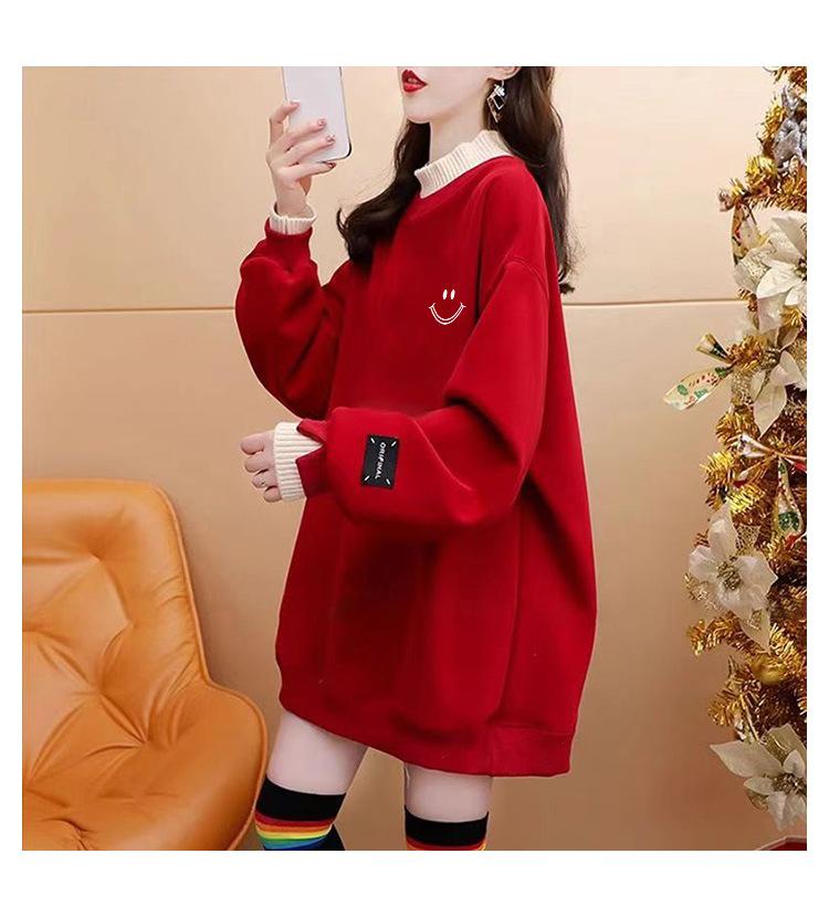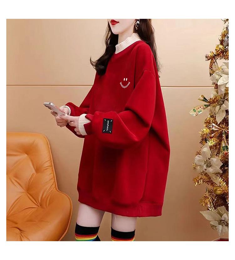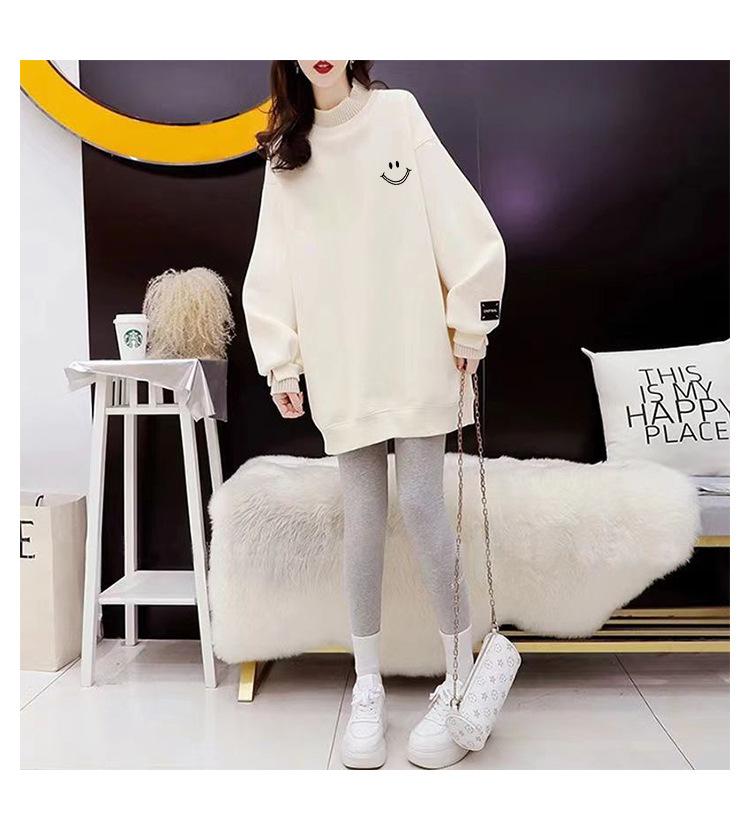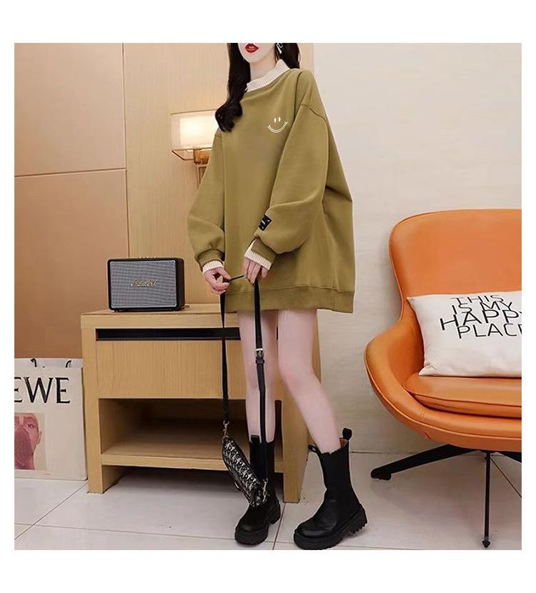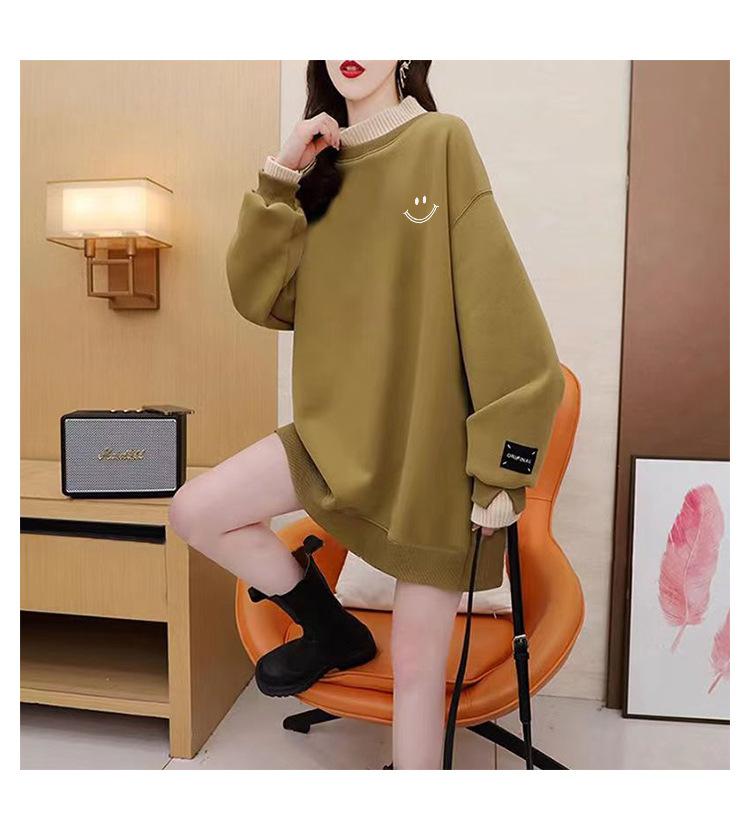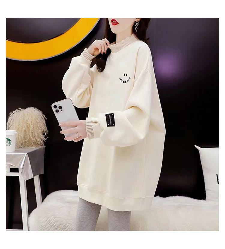 Otoño e Invierno Forrado de vellón Engrosado Cuello medio alto con costuras Suéter holgado para mujer Estilo perezoso Estampado de carita sonriente Top mediano-largo que combina con todo