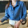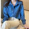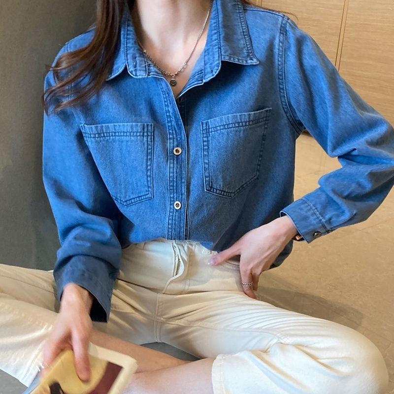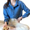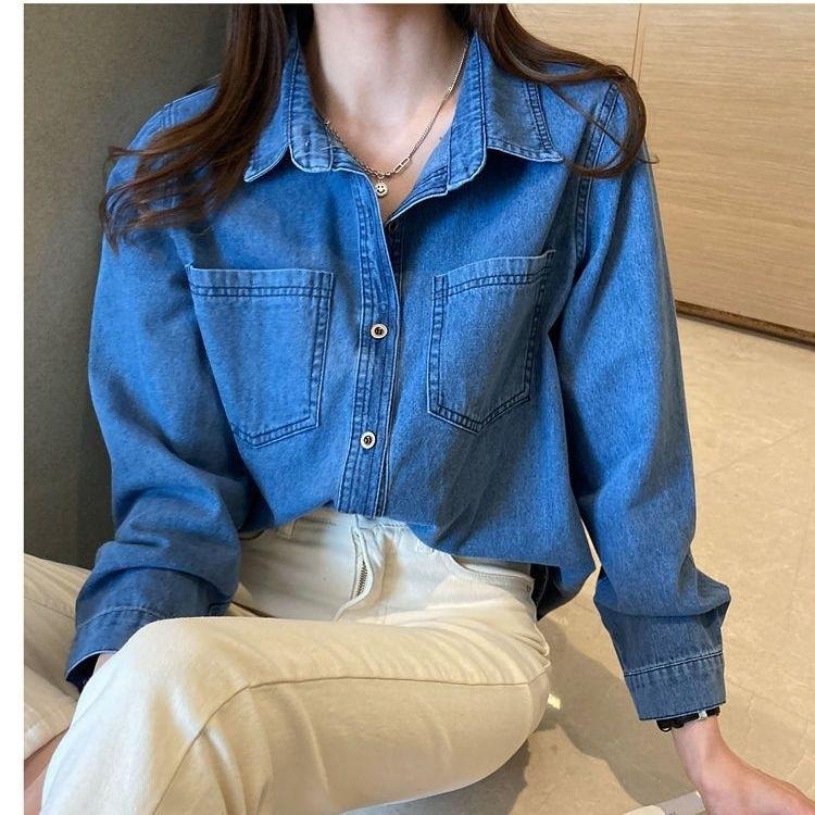 Camisa de Mezclilla Vintage para Mujer 2024 Otoño Suelta Manga Larga Largo Medio Diseño en Capas Camisa Única Versátil