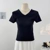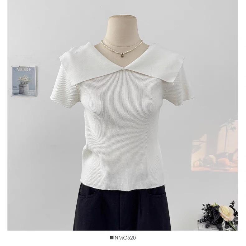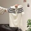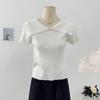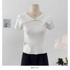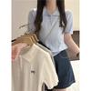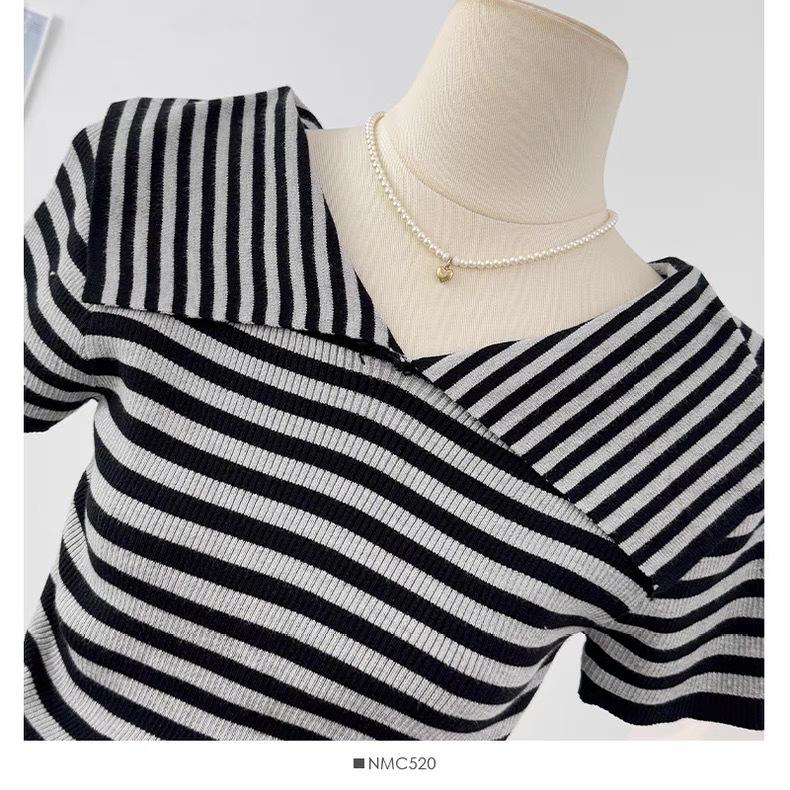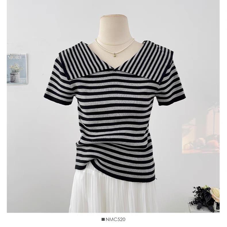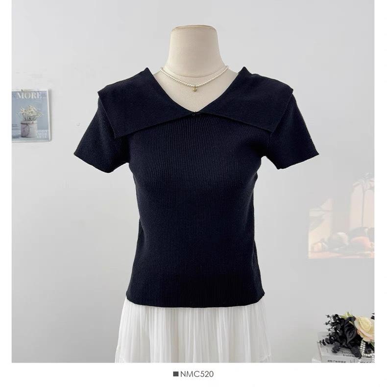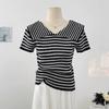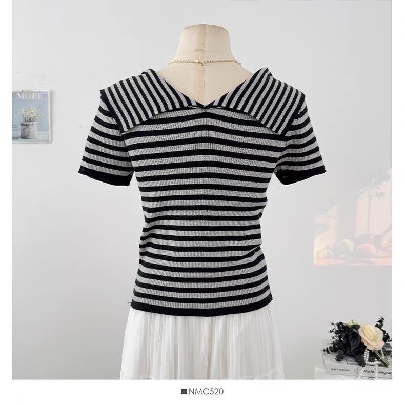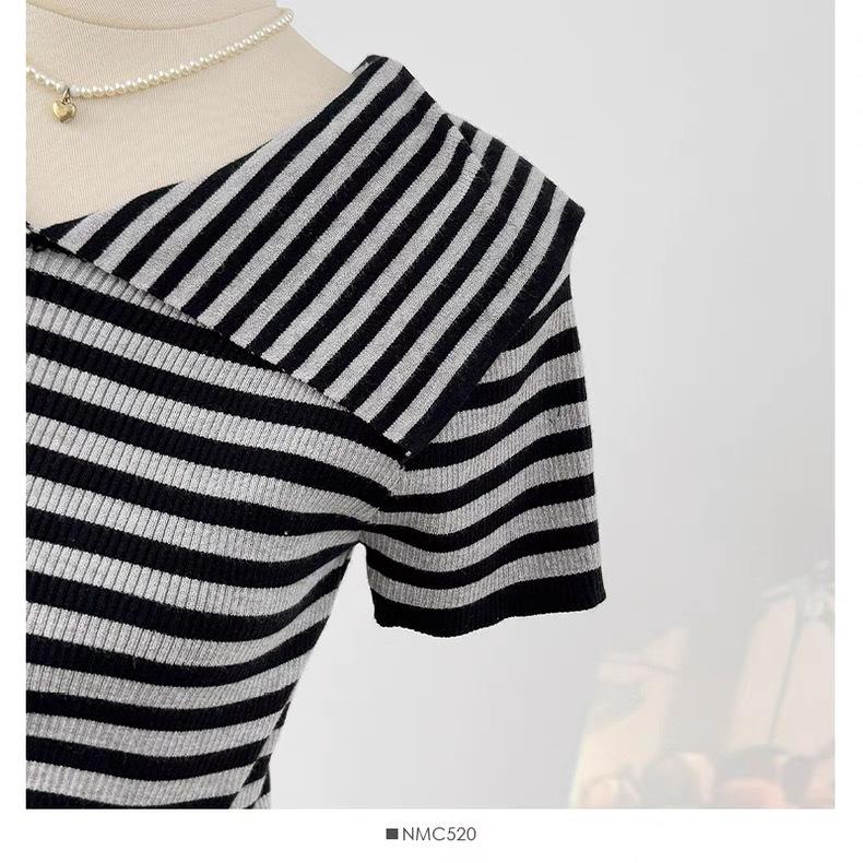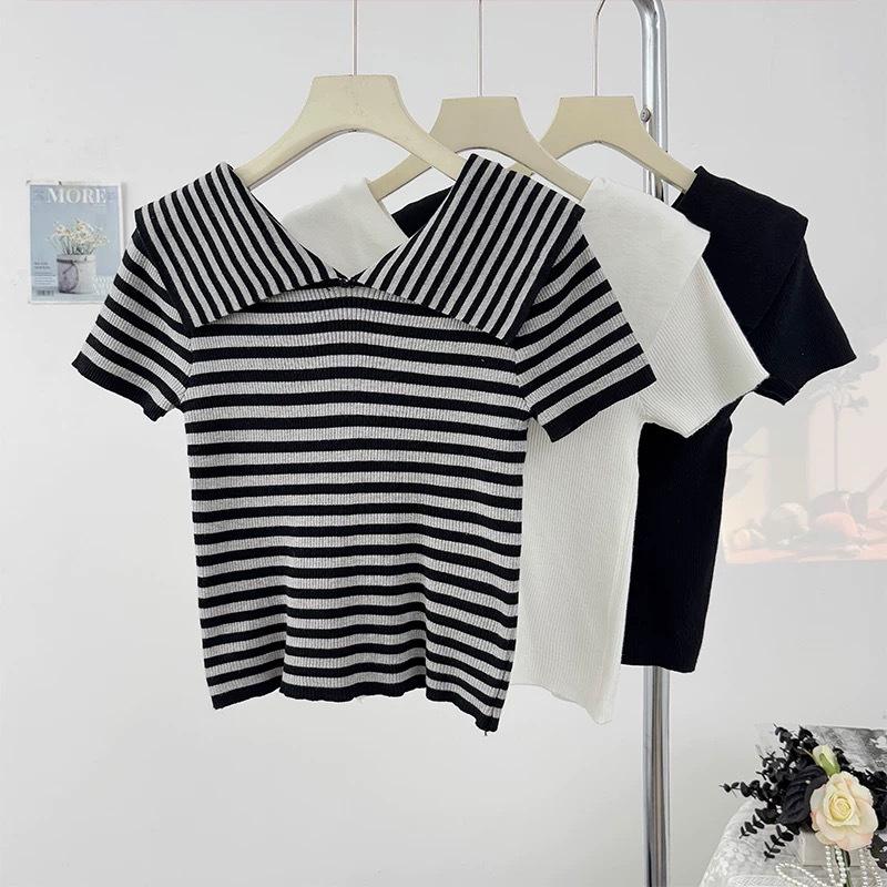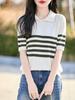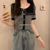 Suéter de Punto de Manga Corta con Cuello Azul Marino de Raya en Contraste para Mujer, Verano, Estilo Coreano, Nuevo, Ajustado, Adelgazante, Top Corto para Mujer