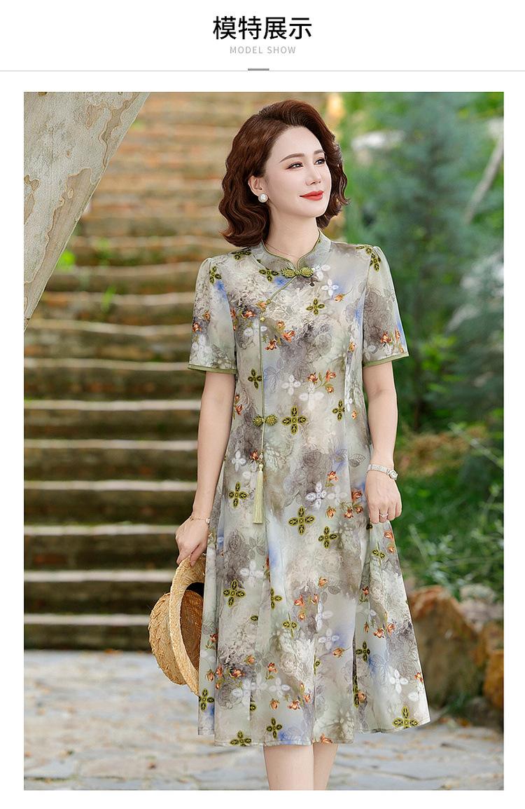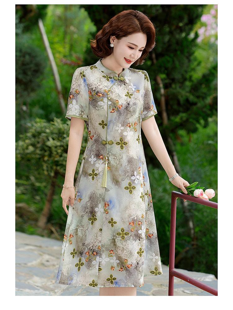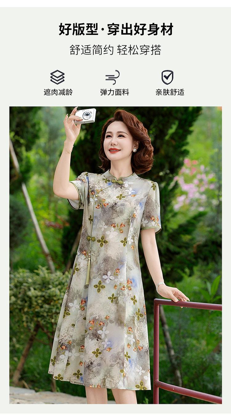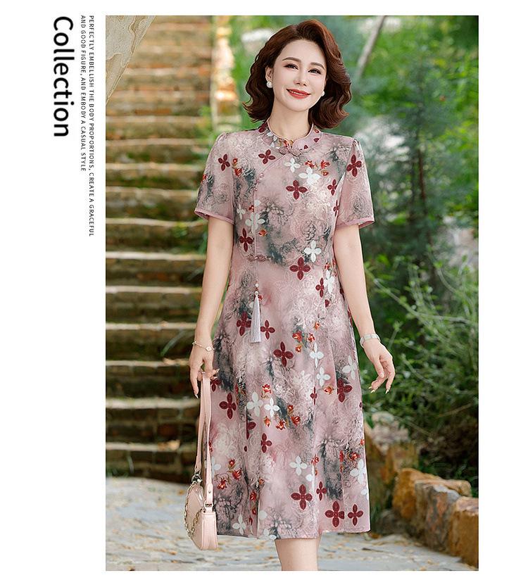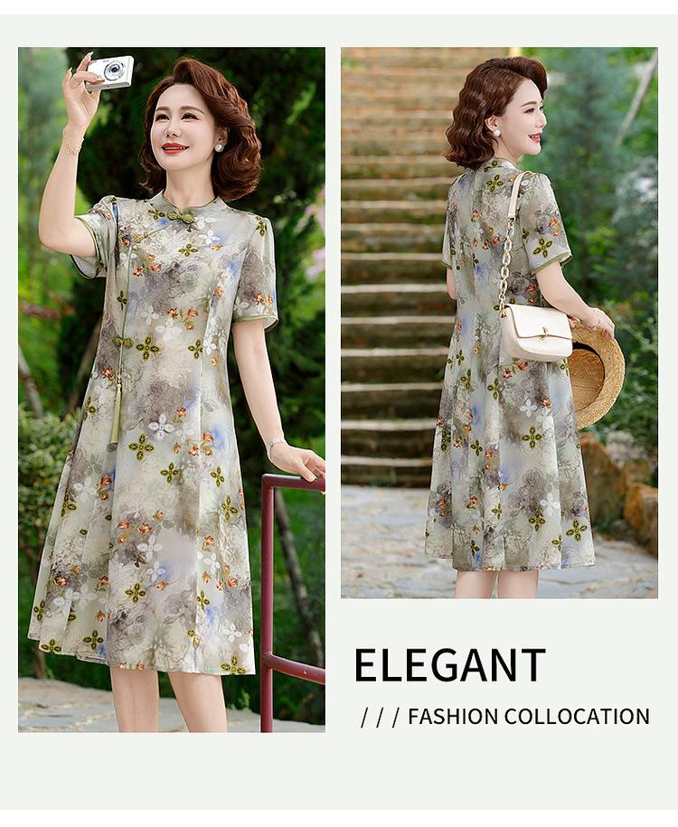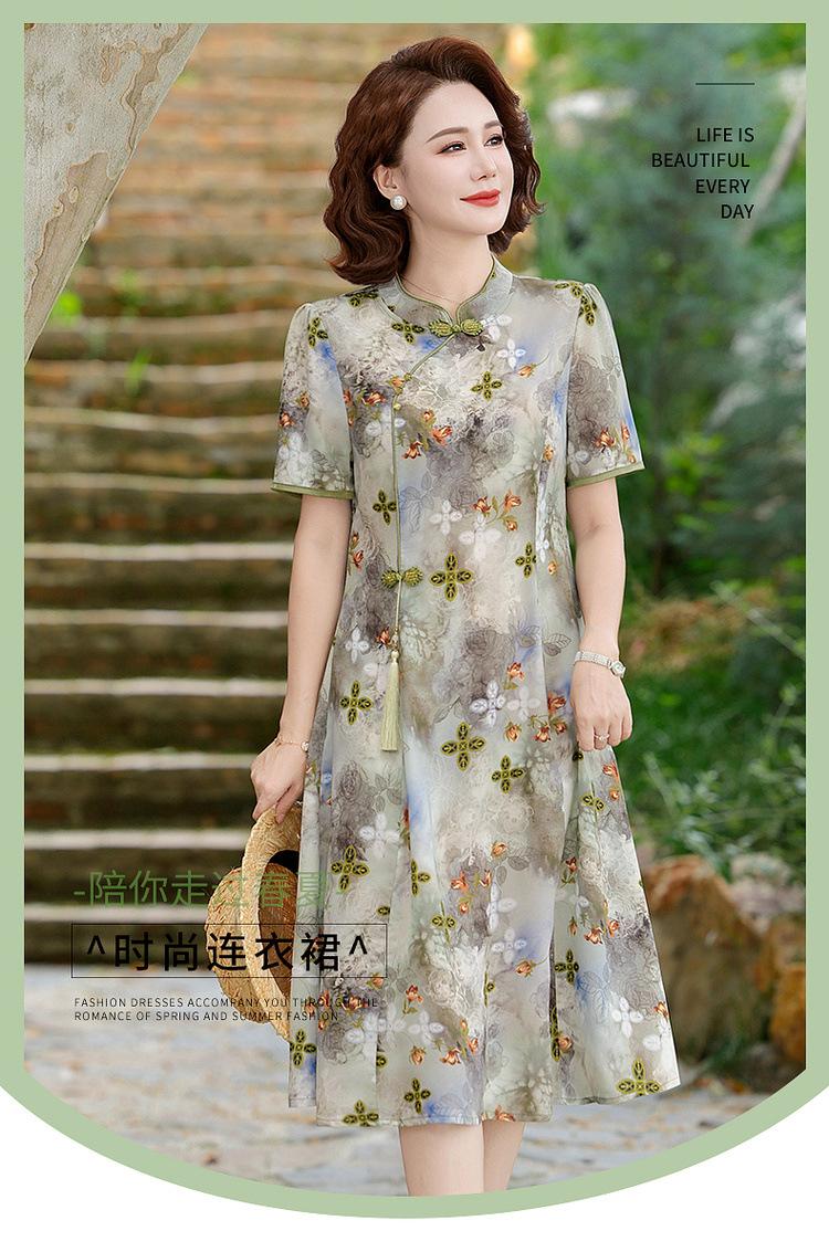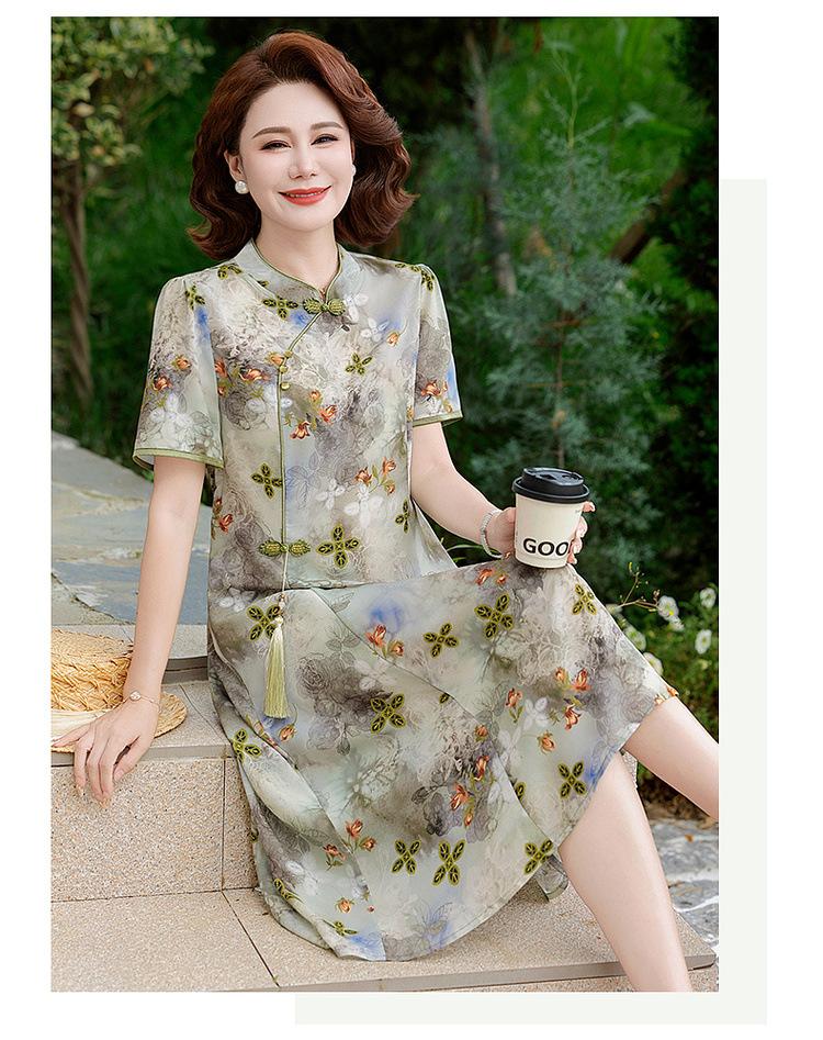 Cheongsam Mejorado de Madres Jóvenes Largo Medio Falda Ancha de Manga Corta Verano Estampado Elegante Vestido para Mujeres de Mediana Edad y Mayores