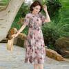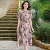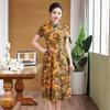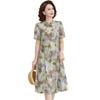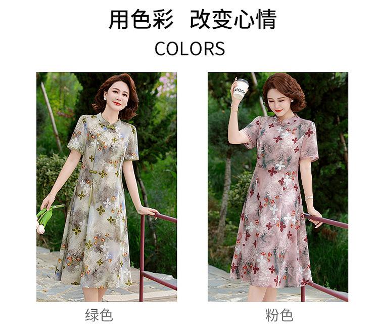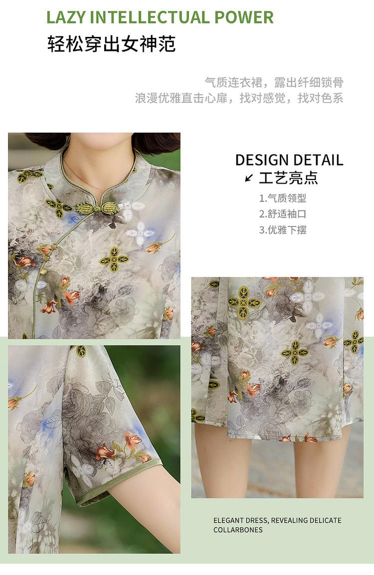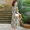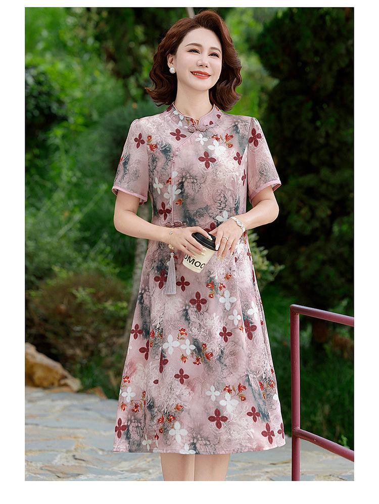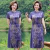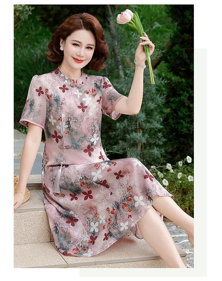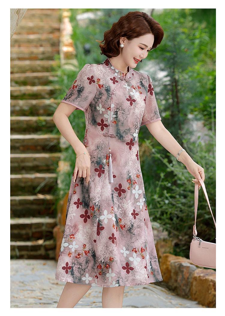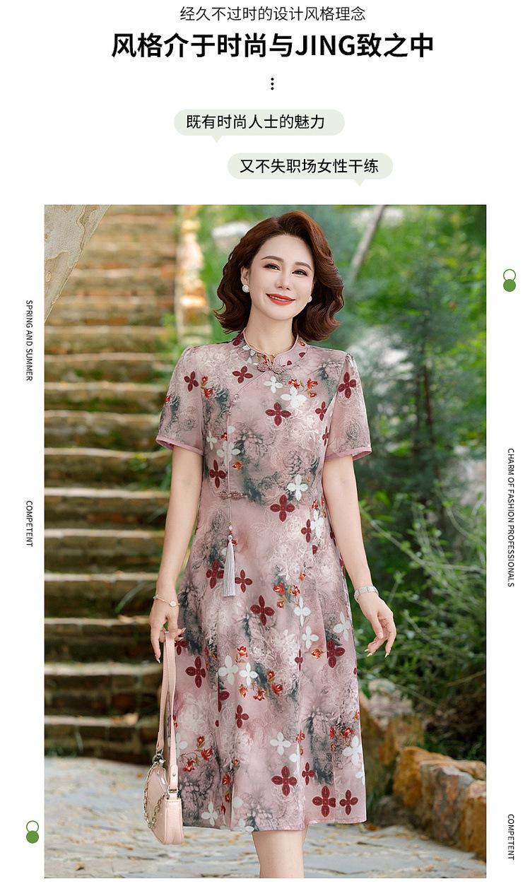 Cheongsam Mejorado de Madres Jóvenes Largo Medio Falda Ancha de Manga Corta Verano Estampado Elegante Vestido para Mujeres de Mediana Edad y Mayores