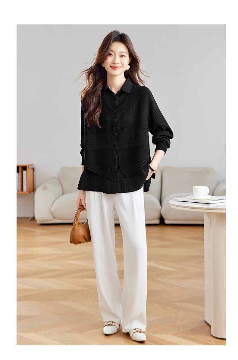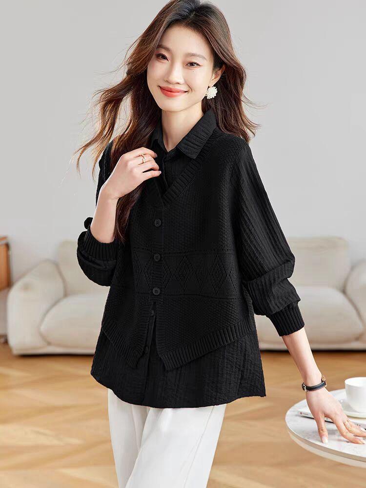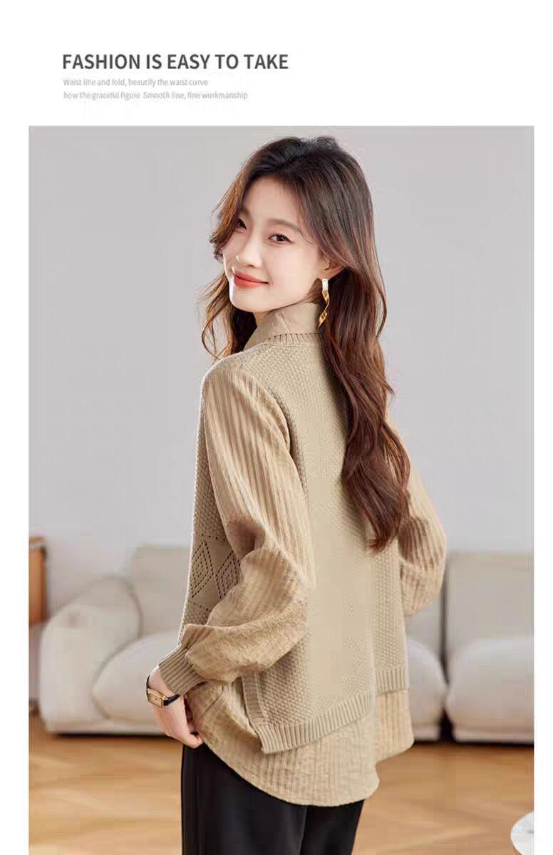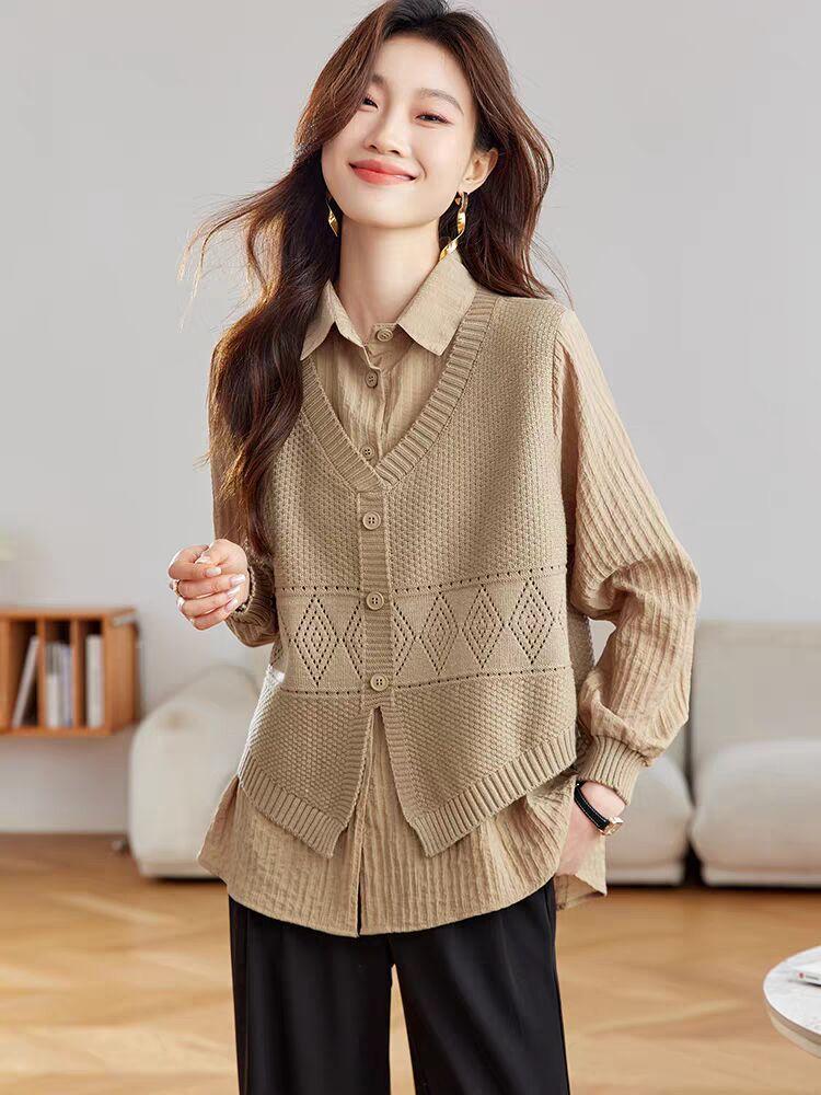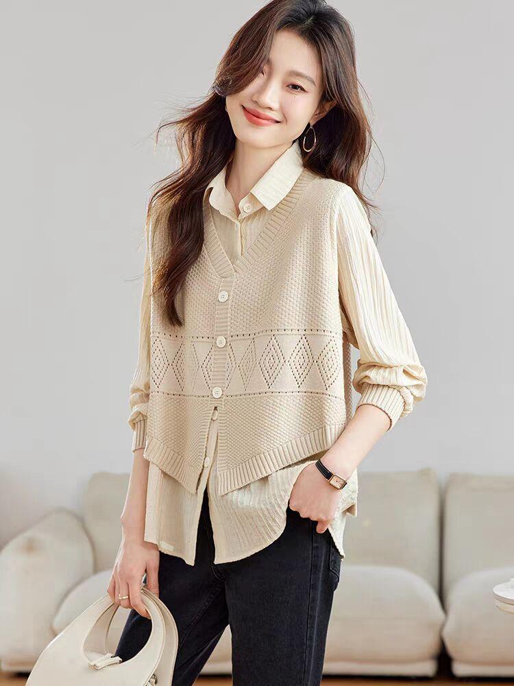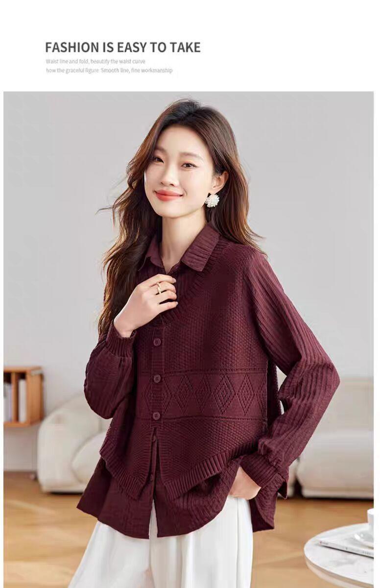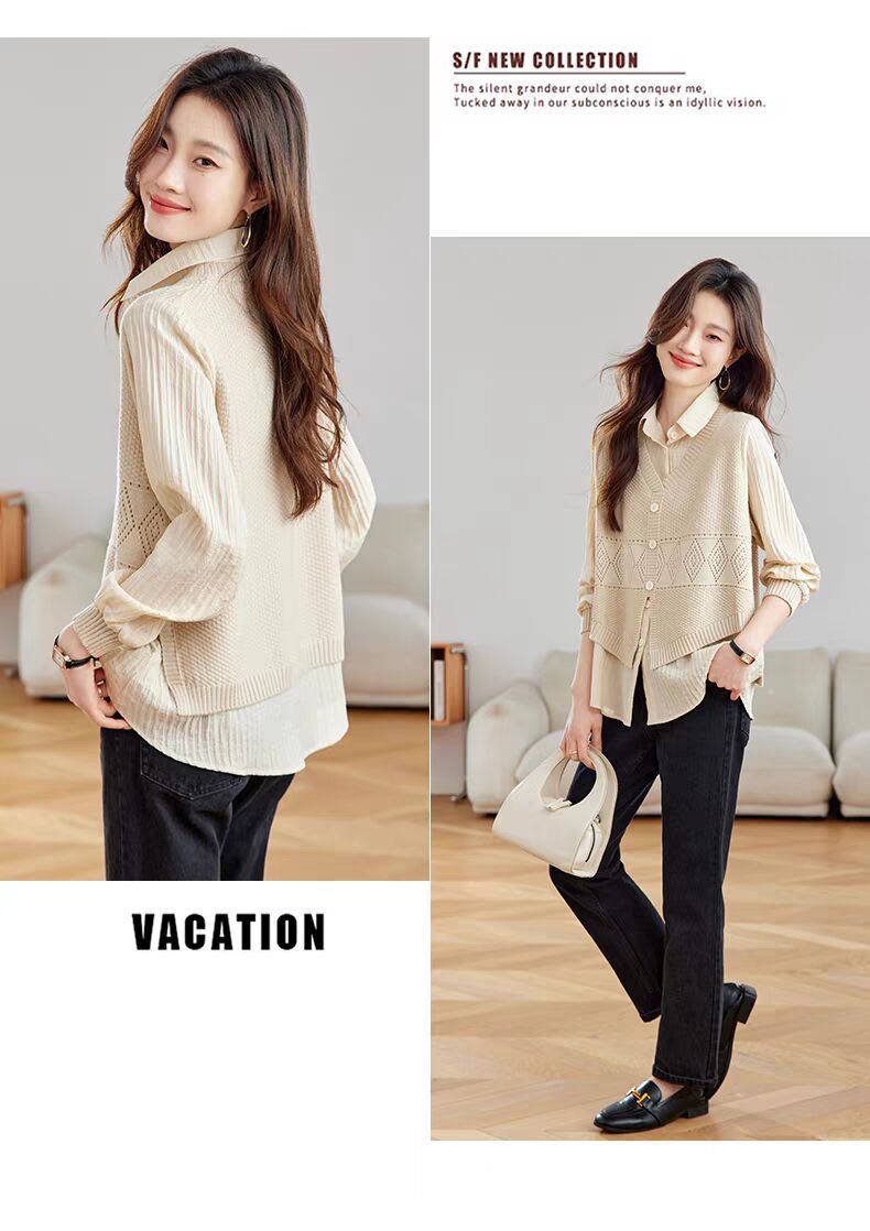Camiseta de punto de manga larga de dos piezas falsas para mujer, nueva de otoño, suéter holgado con parches, top versátil