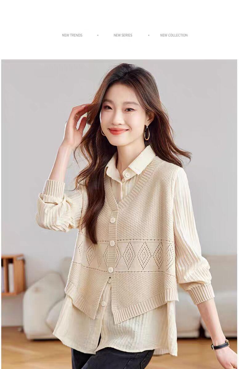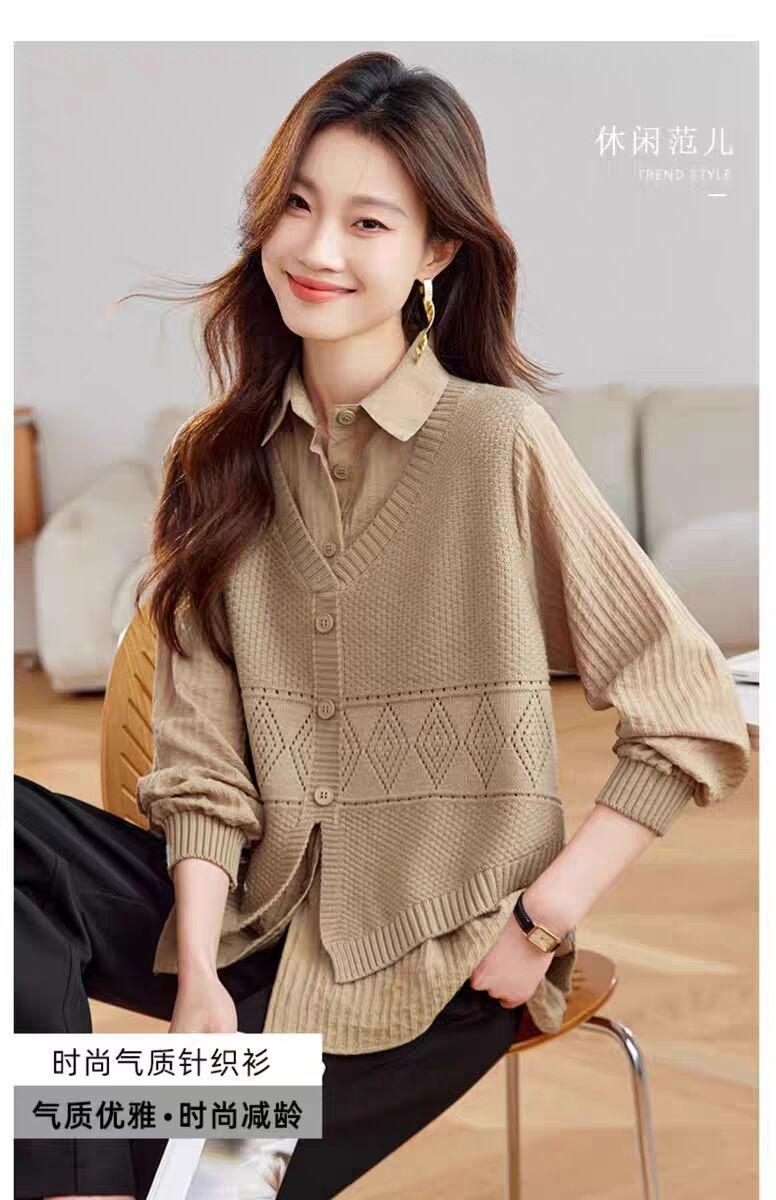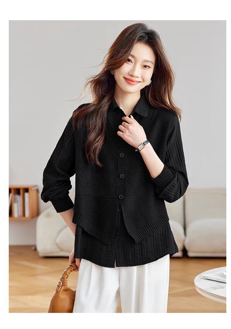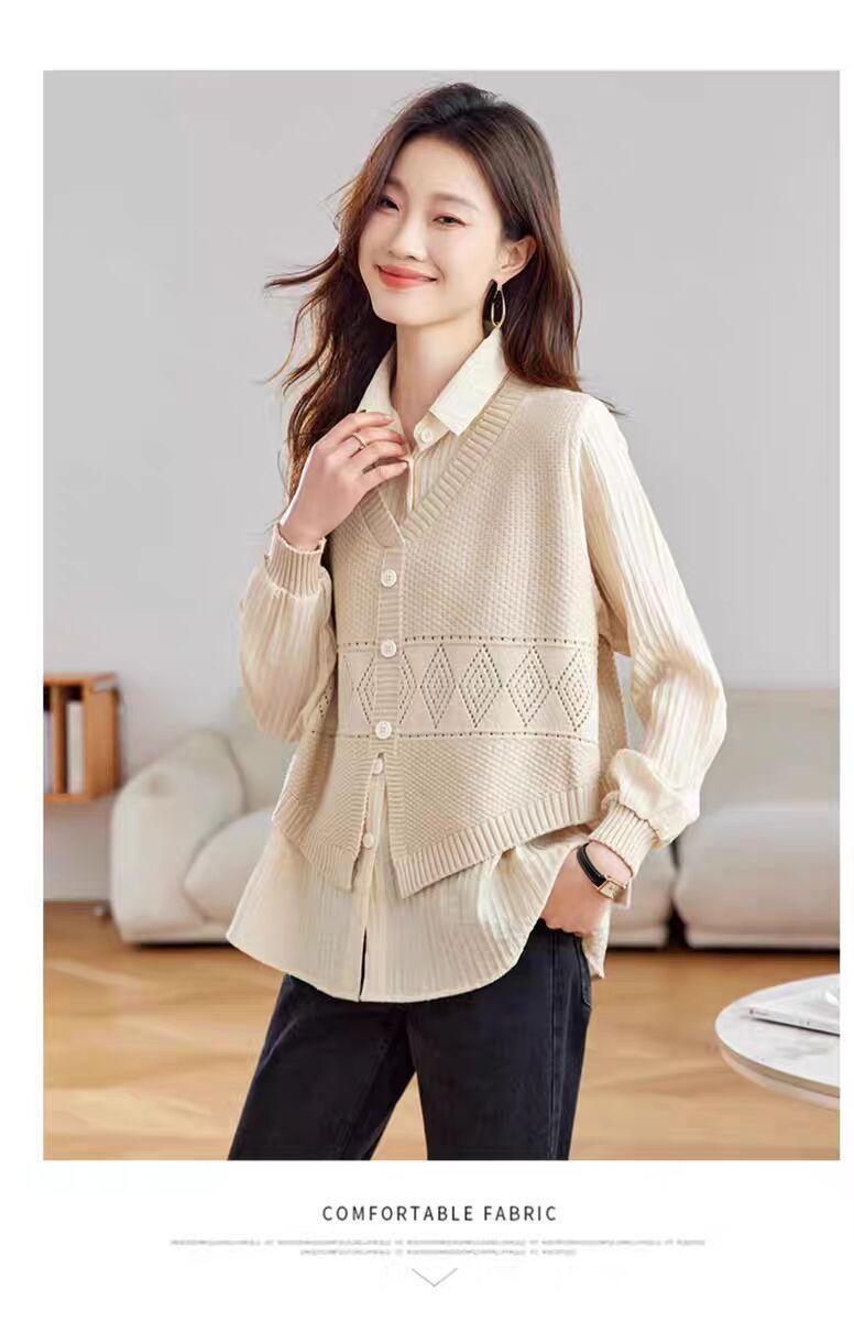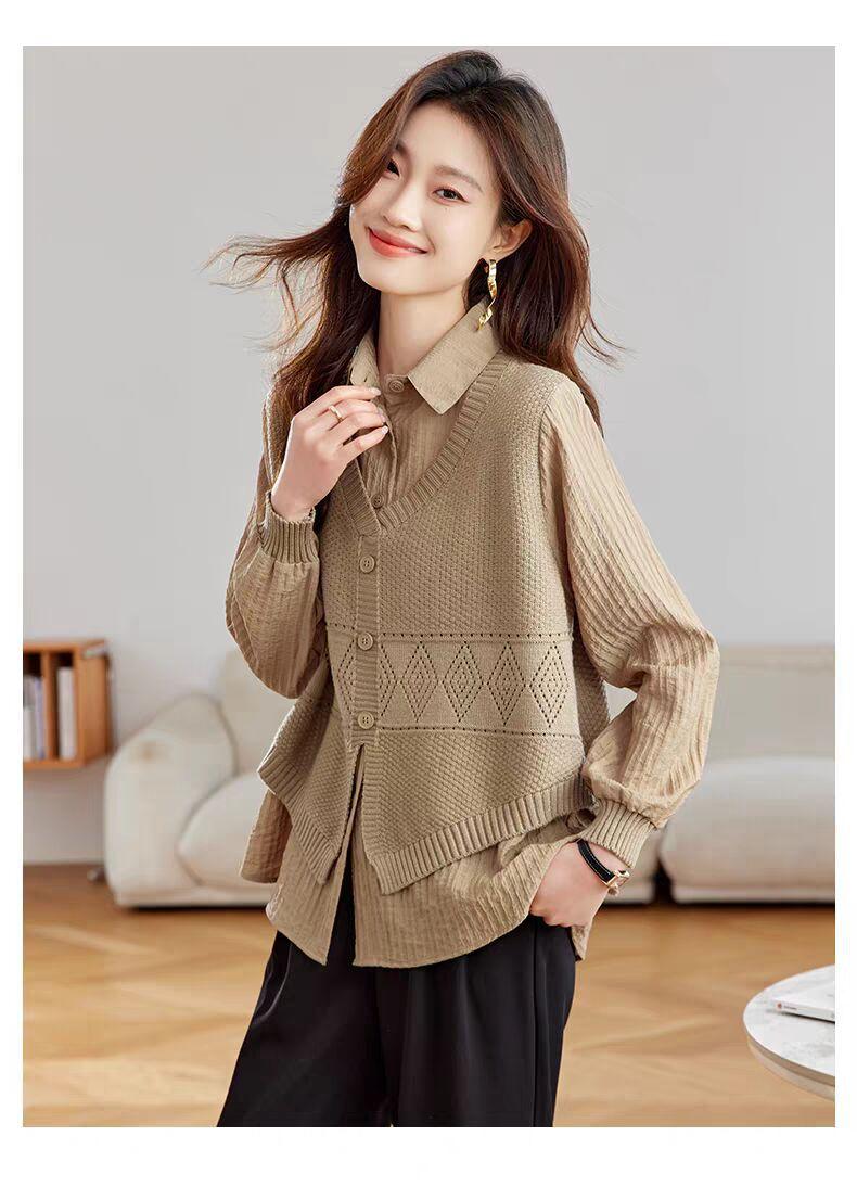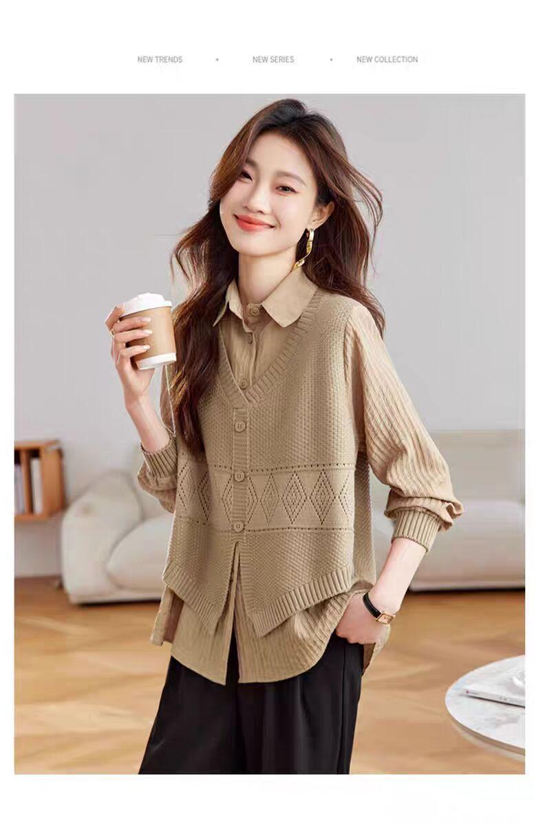 Camiseta de punto de manga larga de dos piezas falsas para mujer, nueva de otoño, suéter holgado con parches, top versátil