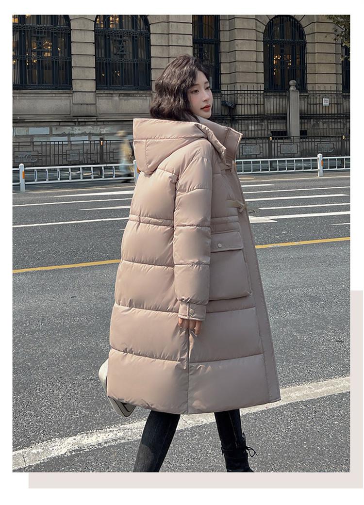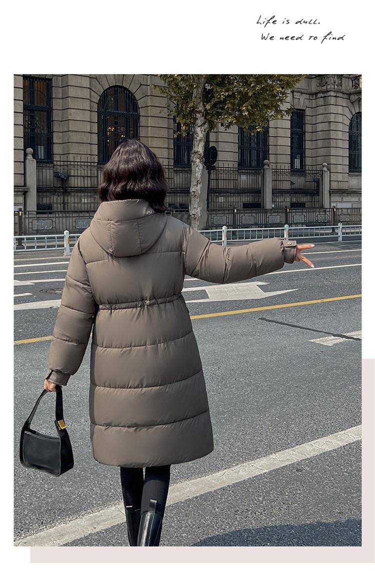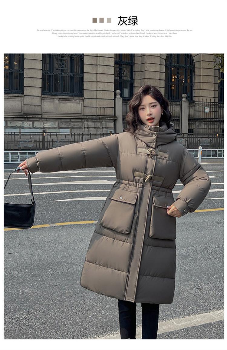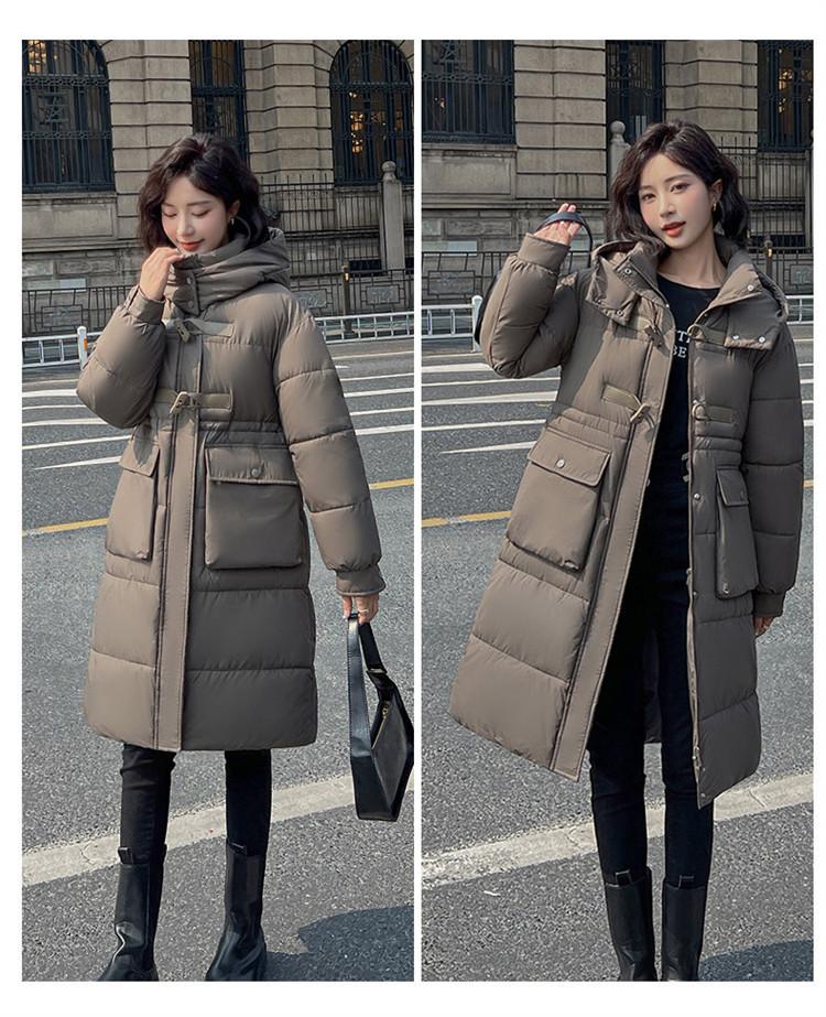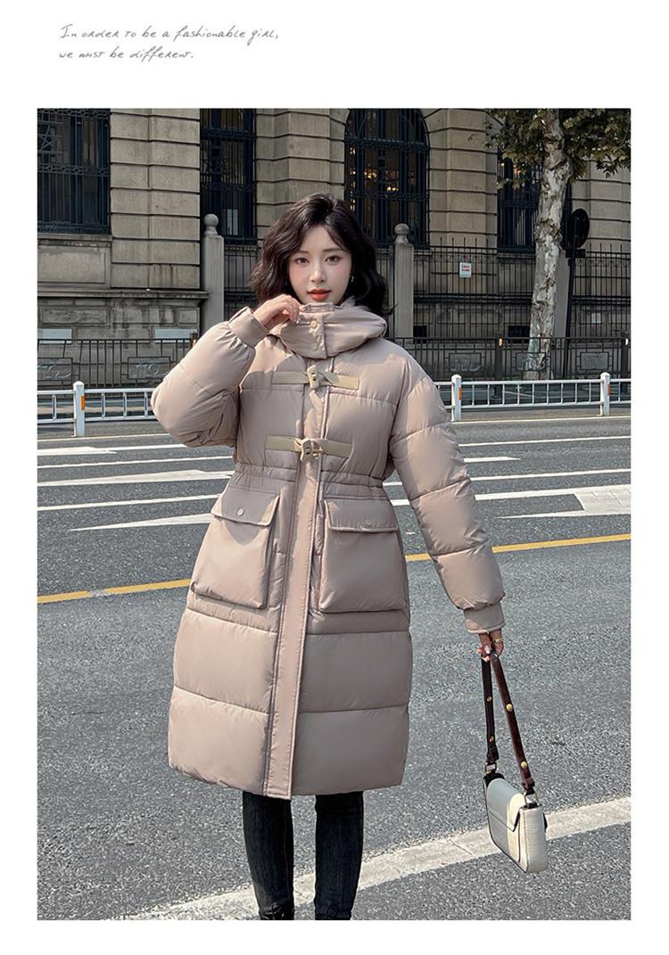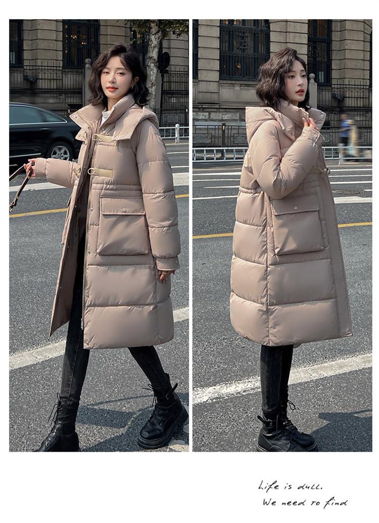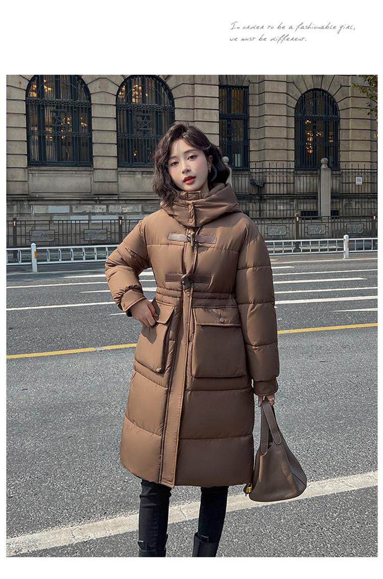 Invierno Nuevo Coreano Botón de Cuerno Adelgazante de Cintura Algodón Largo Medio para Mujer Nuevo Abrigo con Capucha por Encima de la Rodilla Acolchado de Algodón