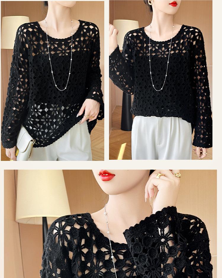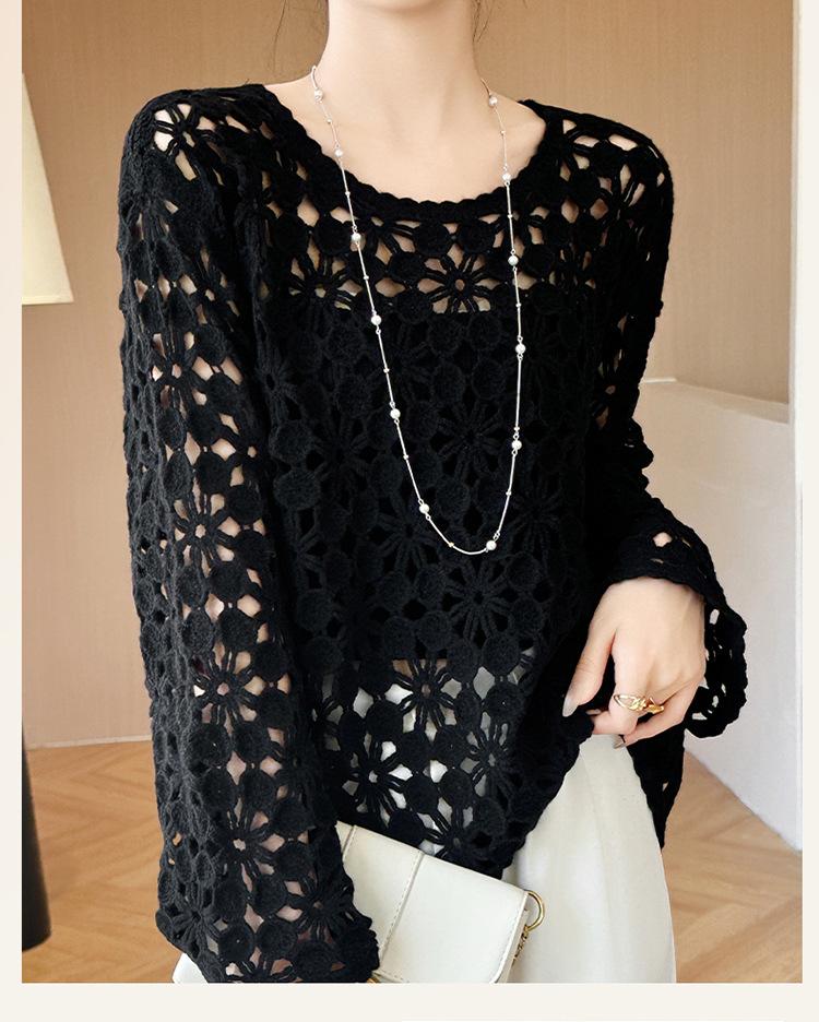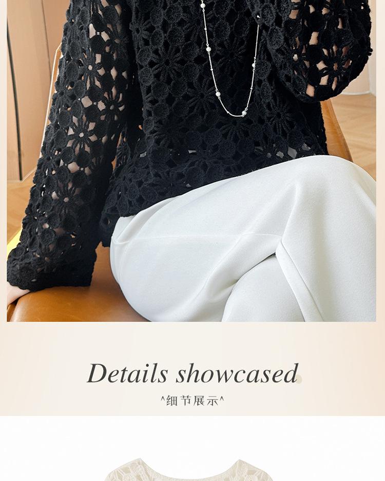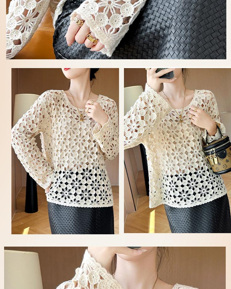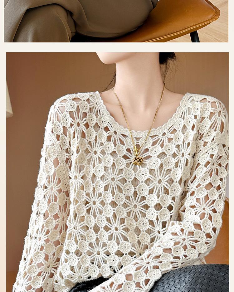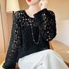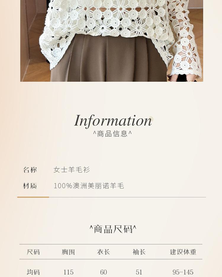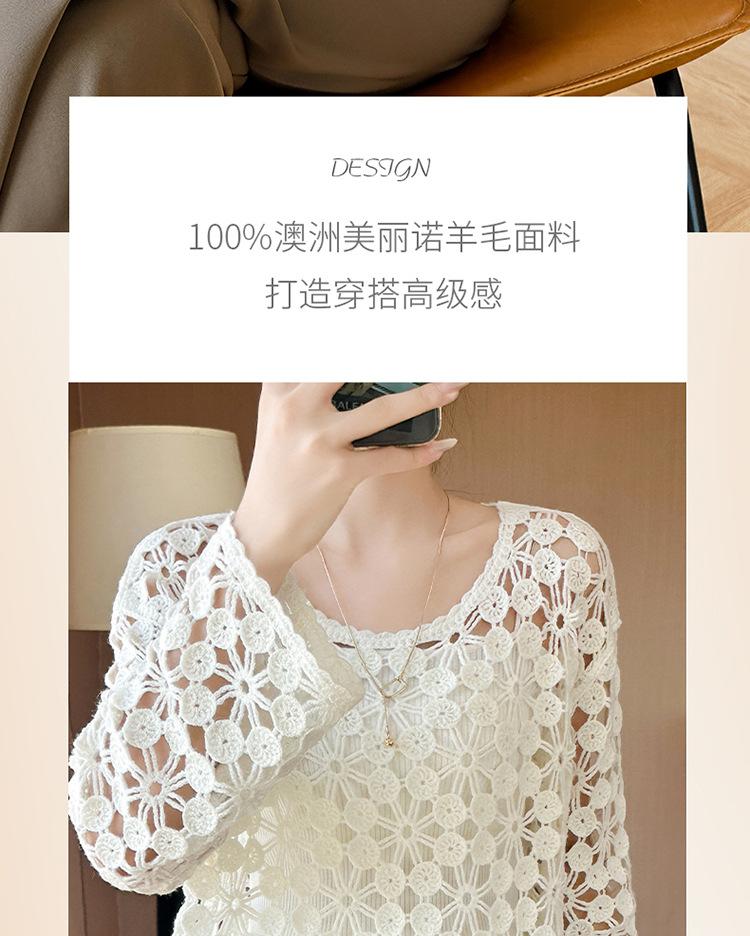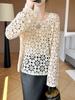 2025 Otoño/Invierno Nuevo Suéter Tejido de Cuello Redondo de Lana Pura Manga Larga Mujer Resistente Diseño Calado de Crochet Sentido de Capa Base