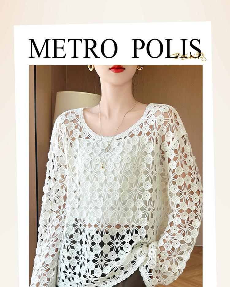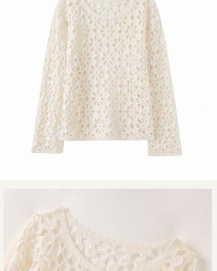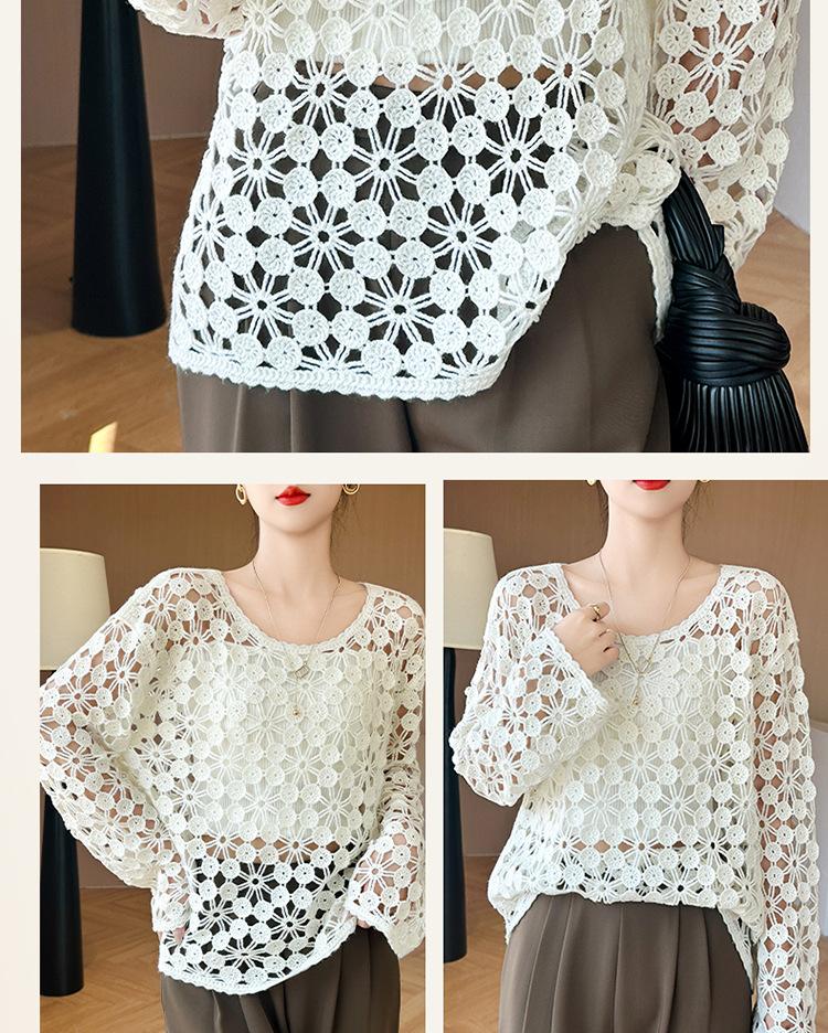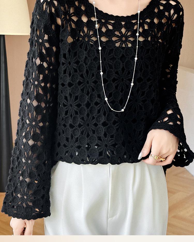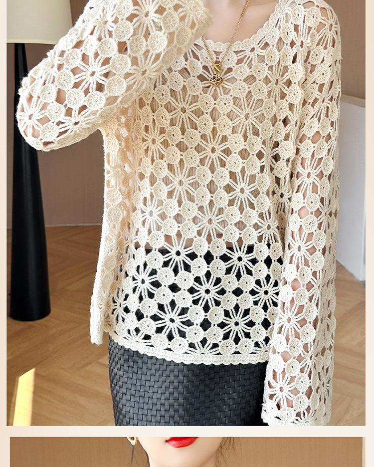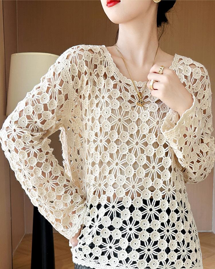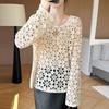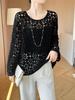 2025 Otoño/Invierno Nuevo Suéter Tejido de Cuello Redondo de Lana Pura Manga Larga Mujer Resistente Diseño Calado de Crochet Sentido de Capa Base