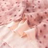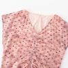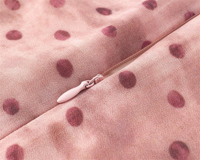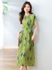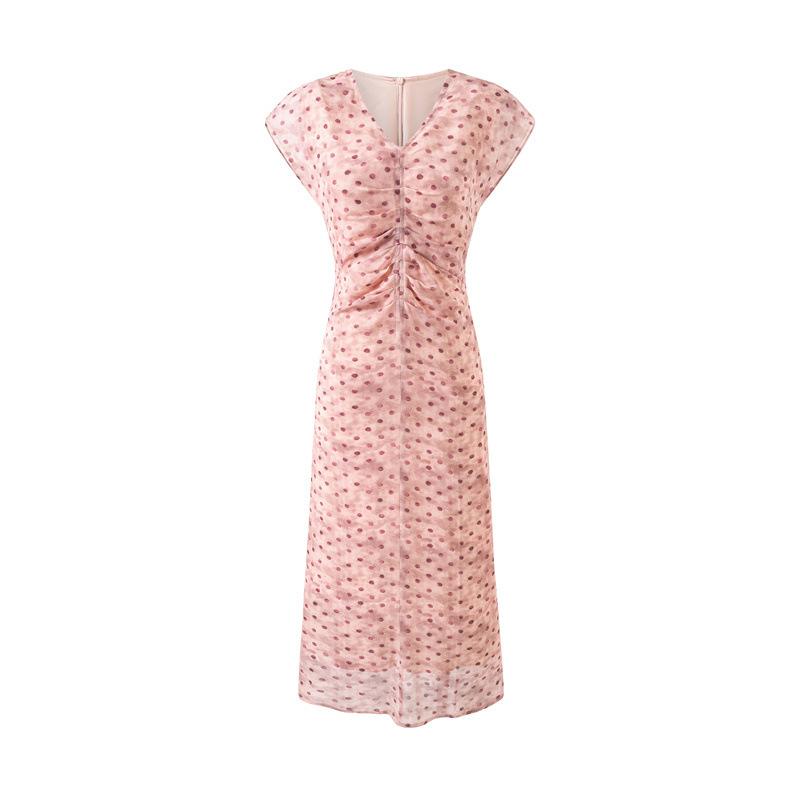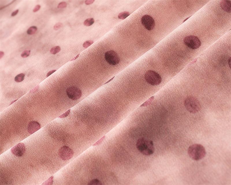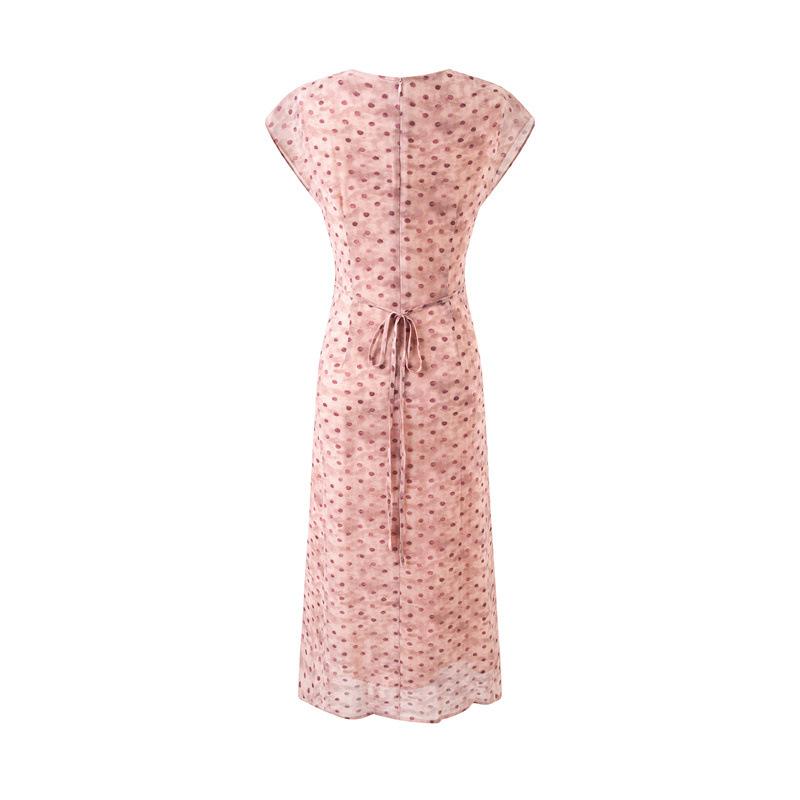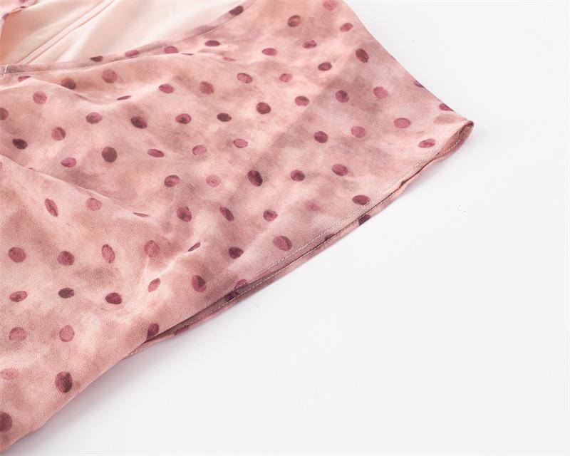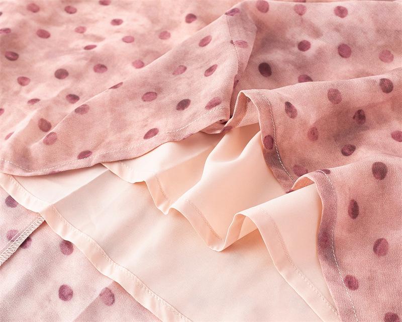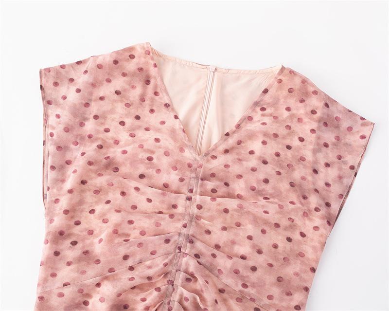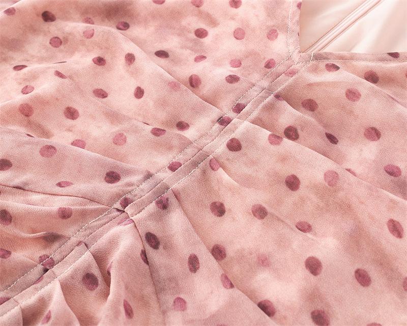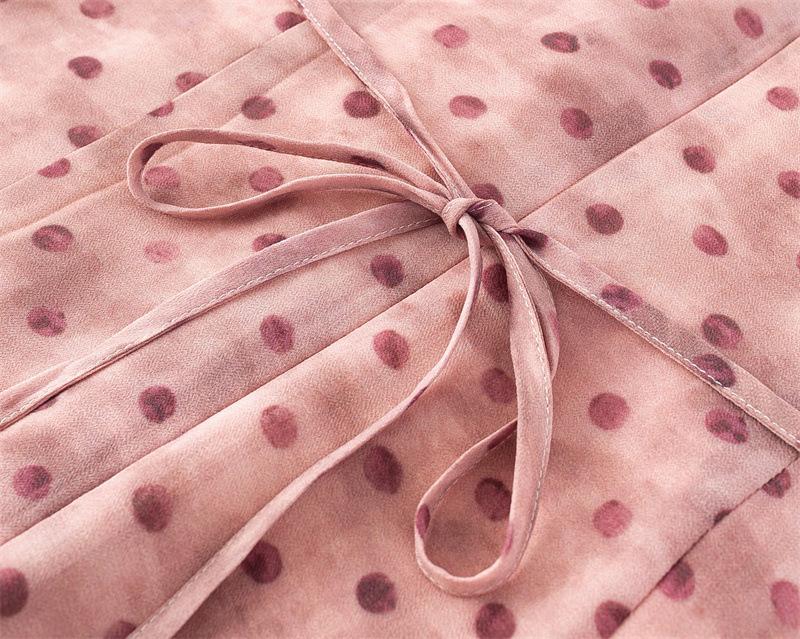 Vestido plisado de estilo europeo y americano con cuello en V y manga corta de lunares de verano con lazo en la cintura, corte slim, elegante, falda larga para mujer