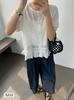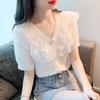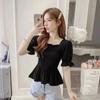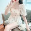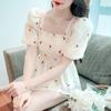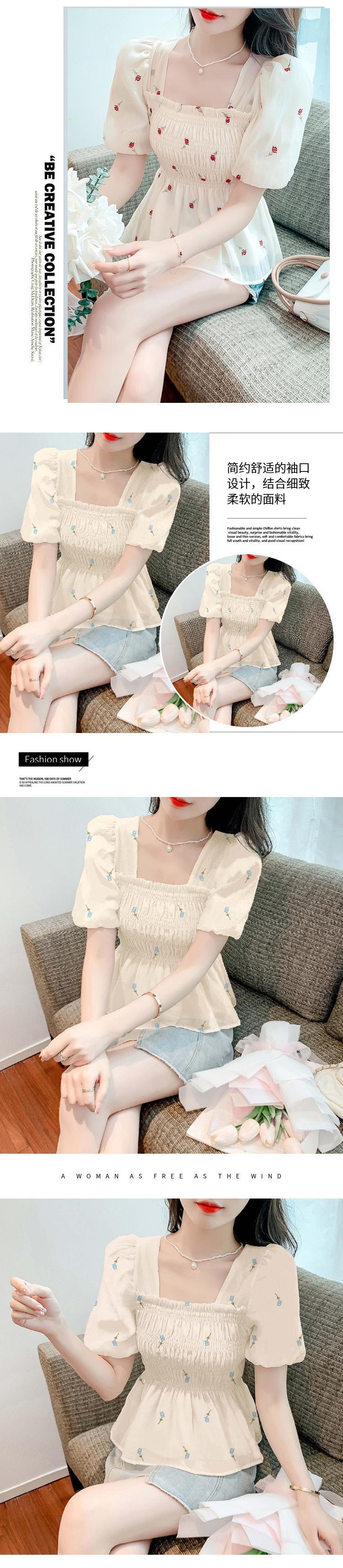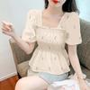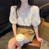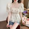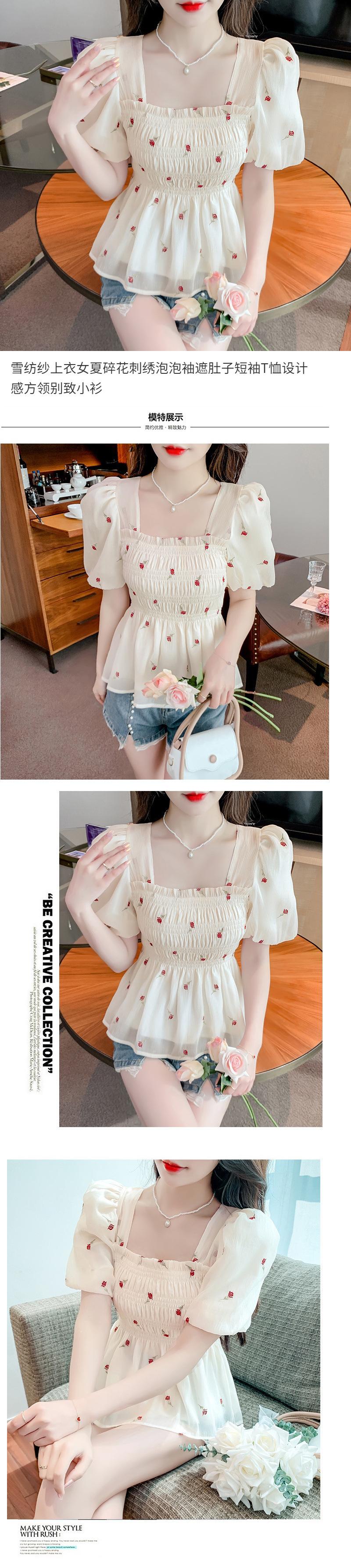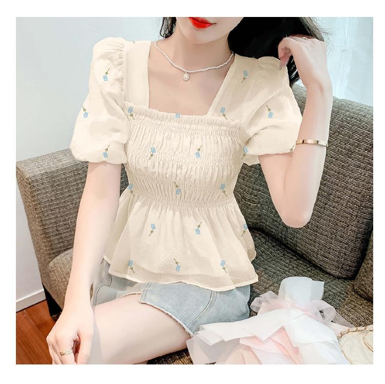 Blusa de gasa para mujer, verano bordada floral mangas abullonadas para cubrir el vientre, camiseta de manga corta, diseño cuello cuadrado, camisa chic