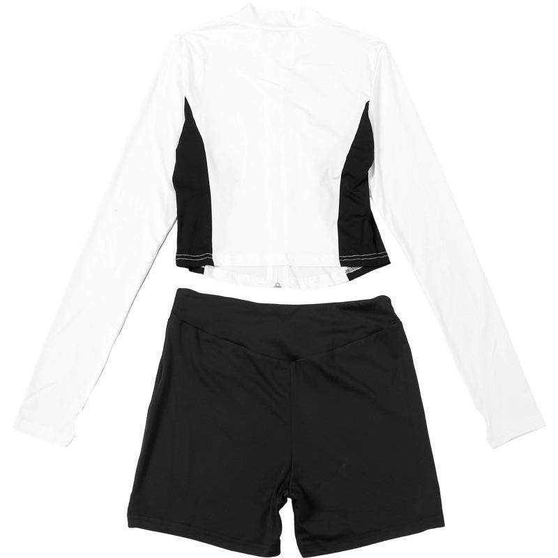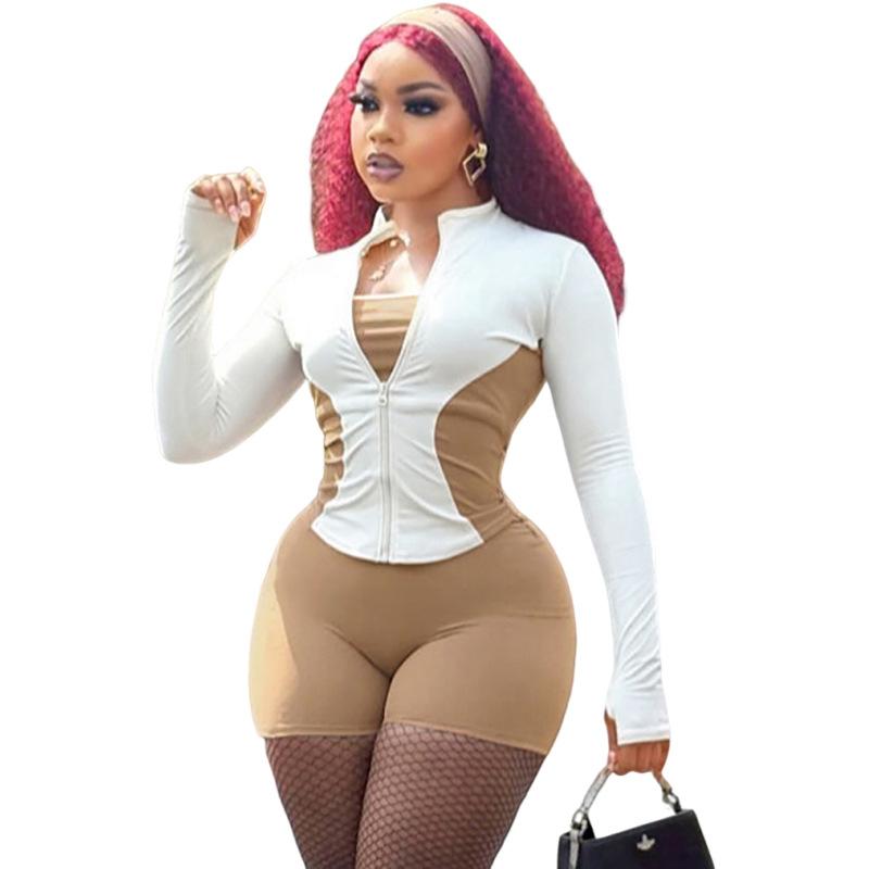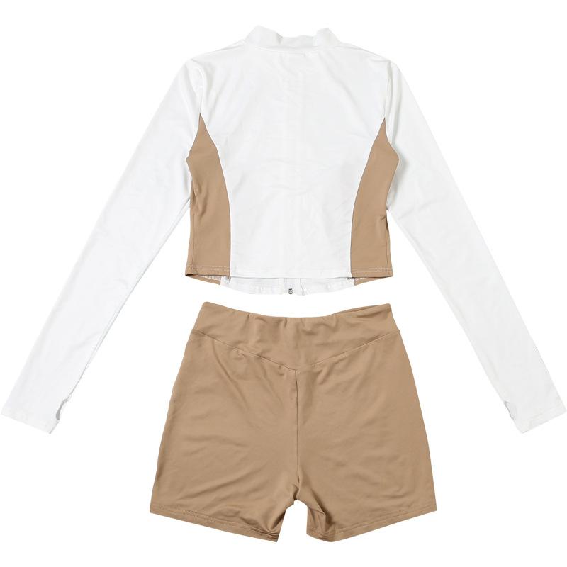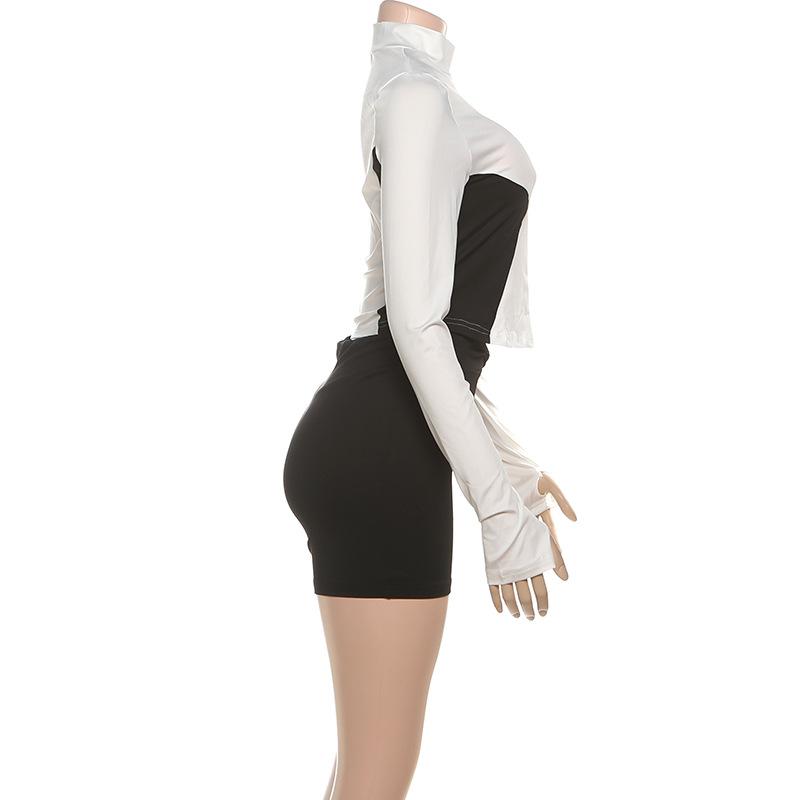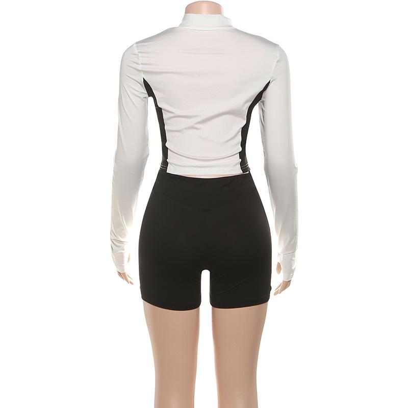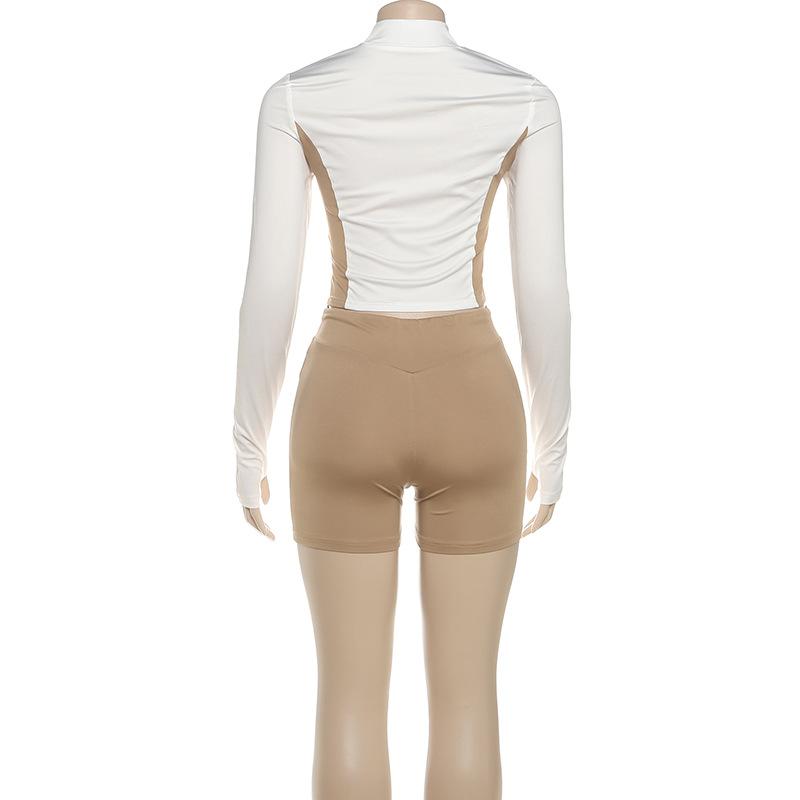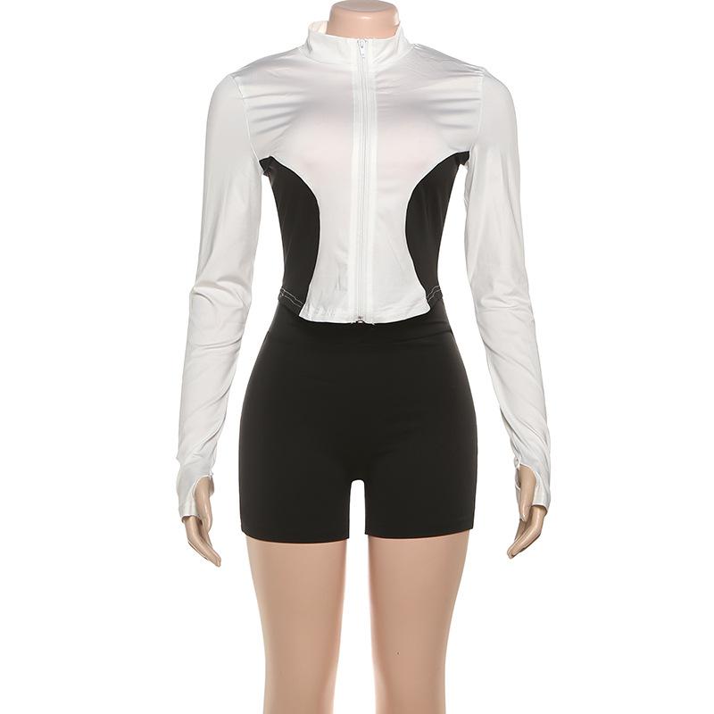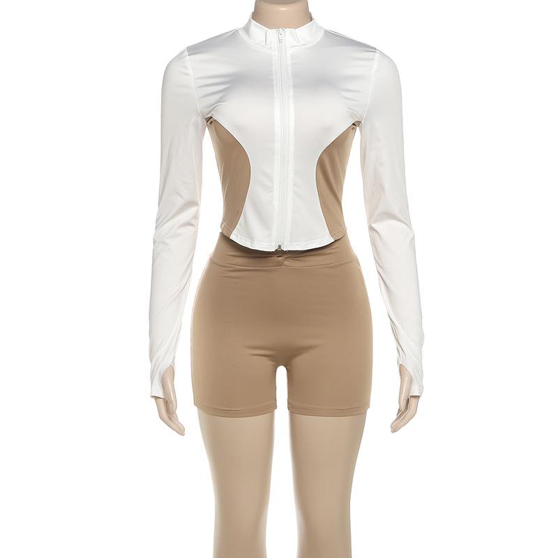 Comercio Exterior Europeo y Americano 2025 Nuevo Top de Mujer con Cuello Alto y Manga Set-in con Cremallera, Bloque de Color, Conjunto de Shorts Deportivos de Moda