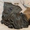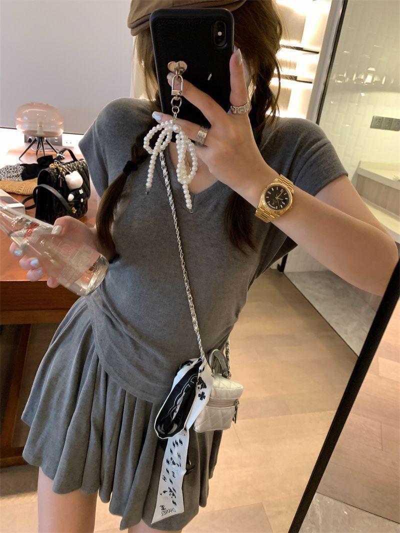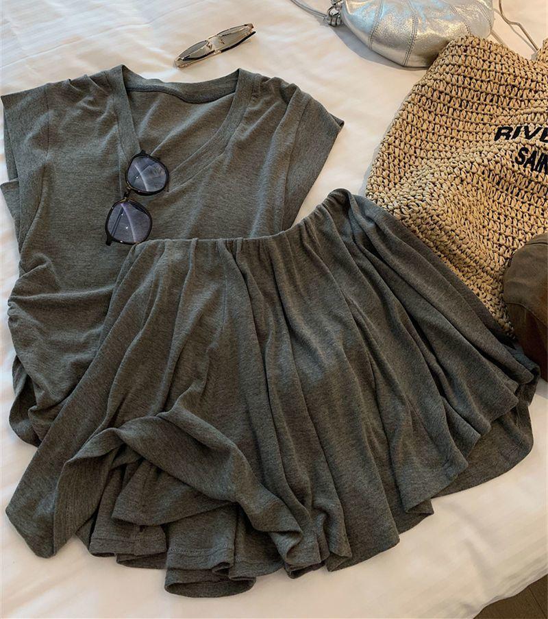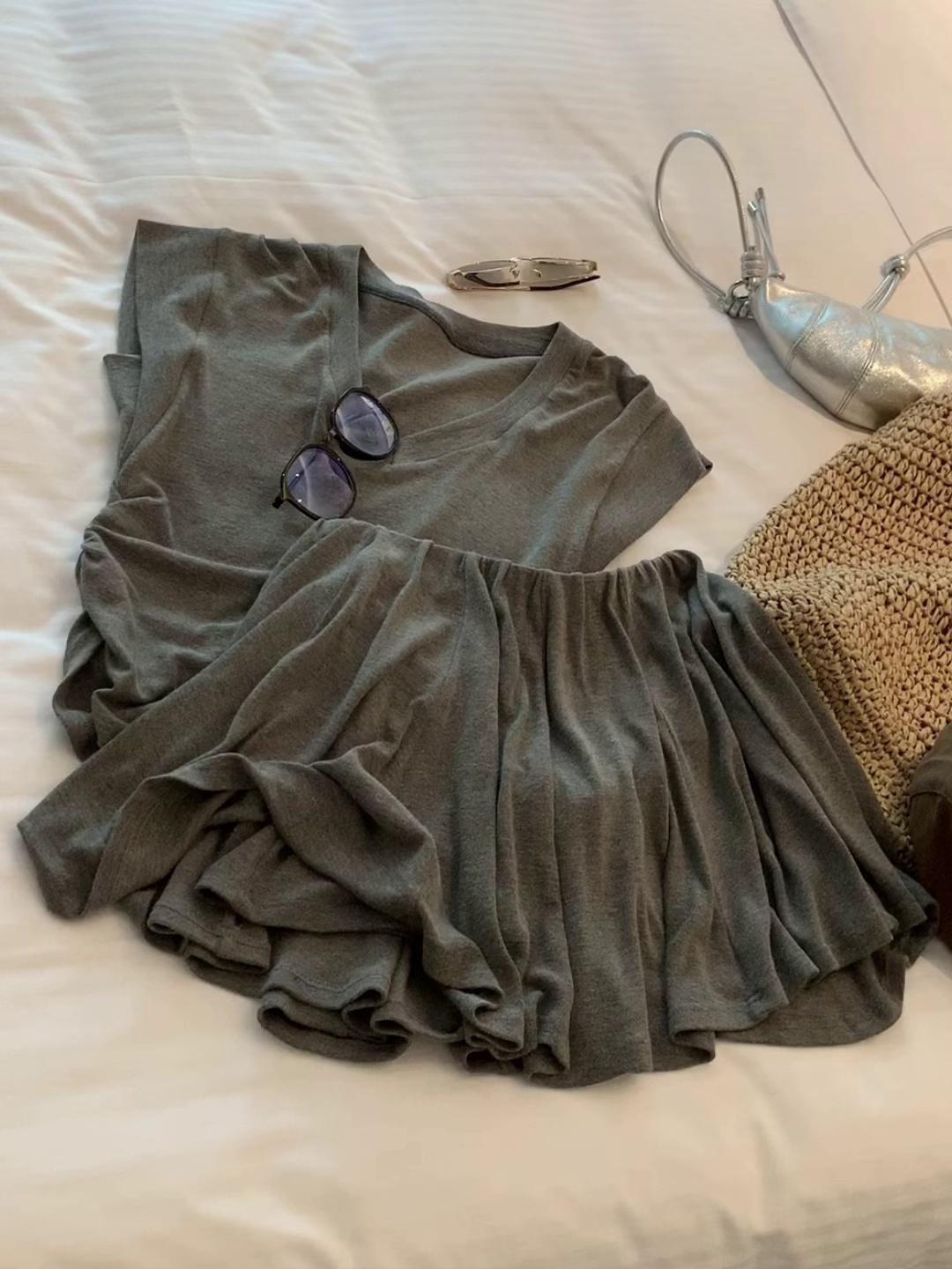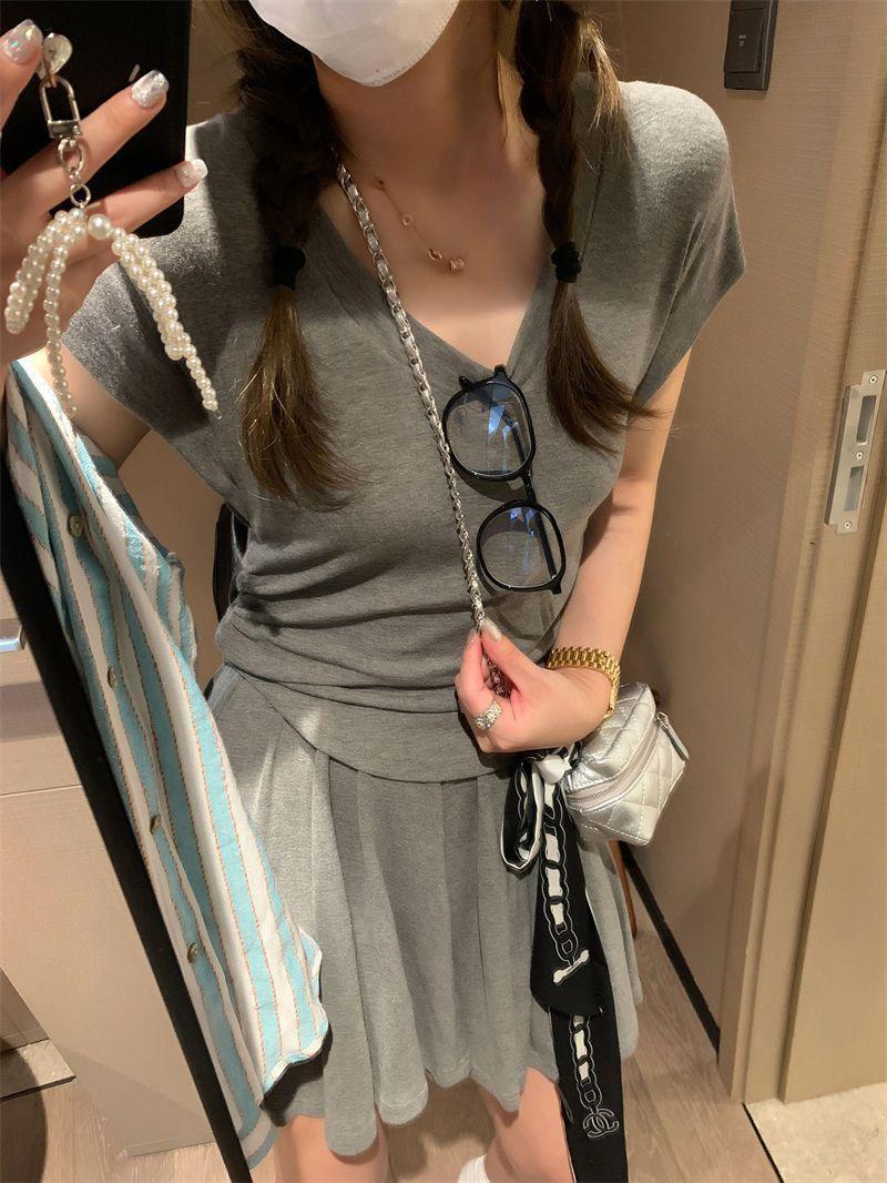 2025 Nuevo Estilo de Verano Color Puro Estilo Coreano Estilo Holgazán Casual Traje de Dos Piezas Tops de Manga Corta Faldas Plisadas Moderno