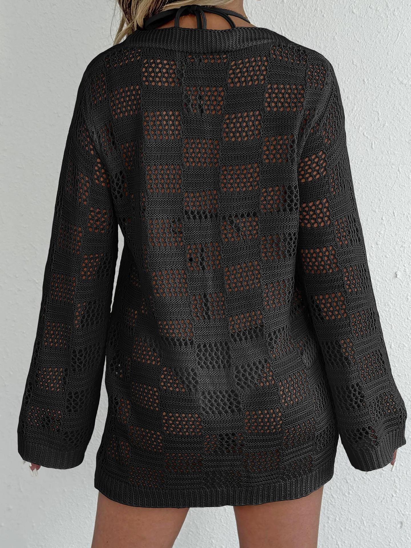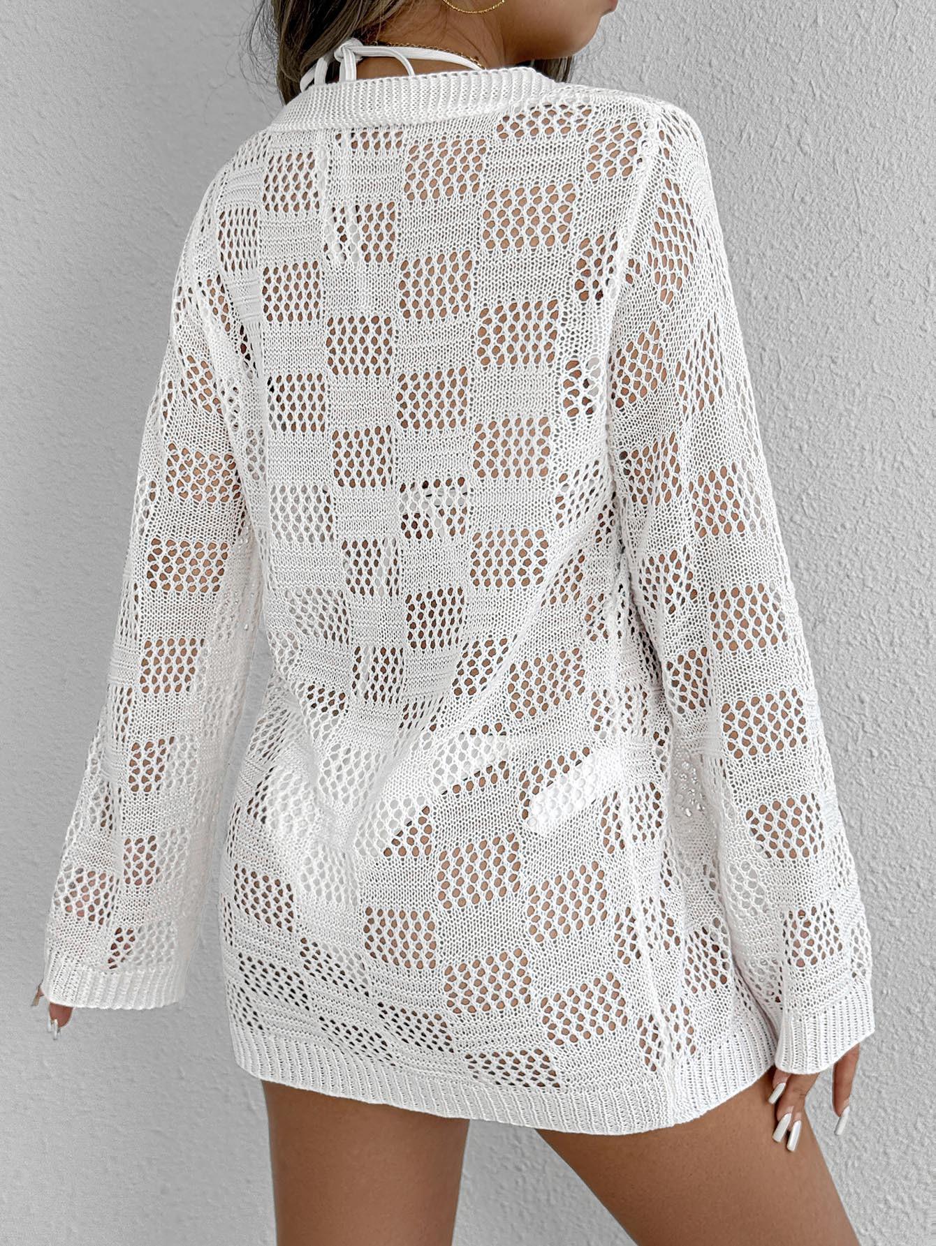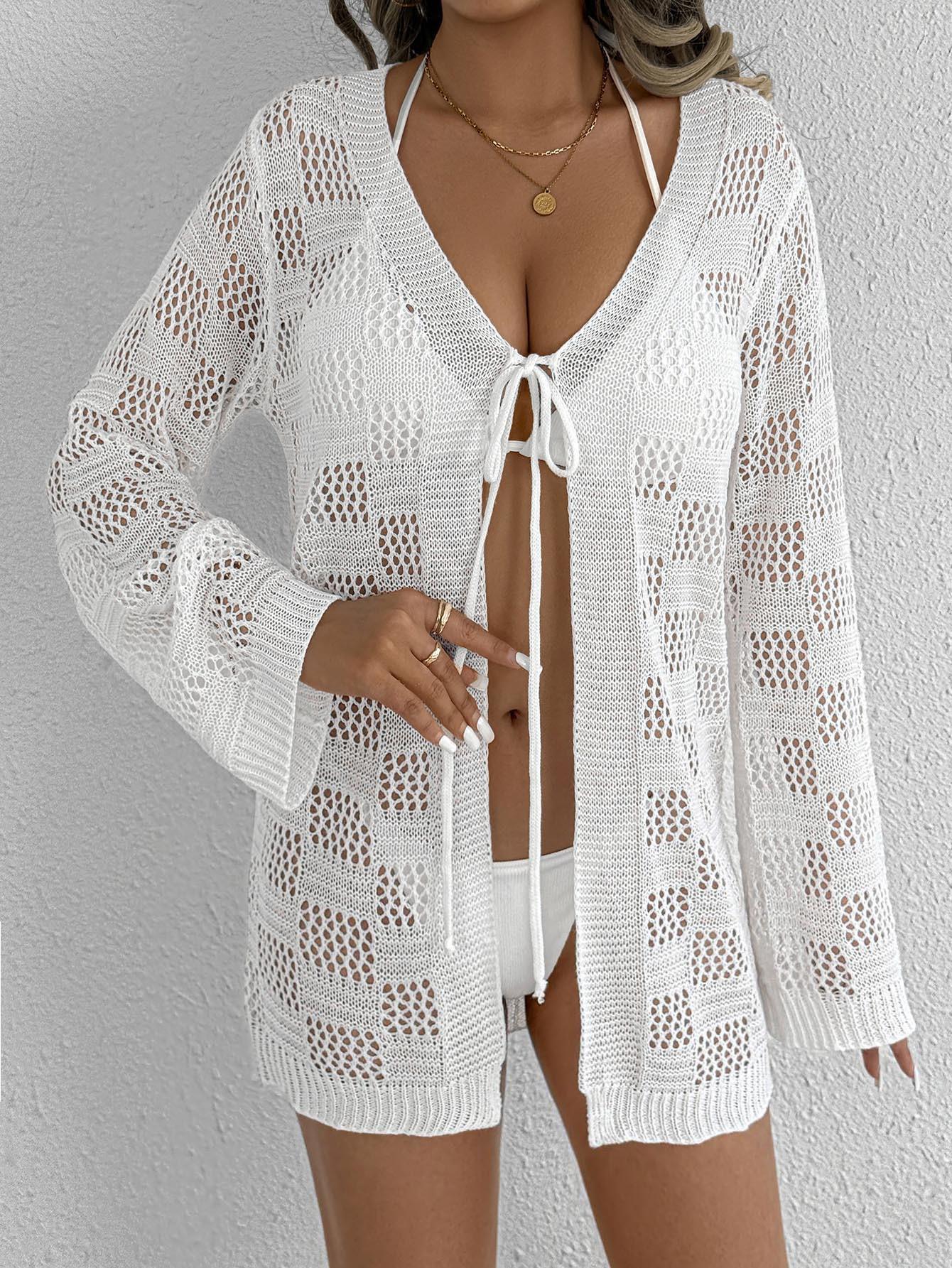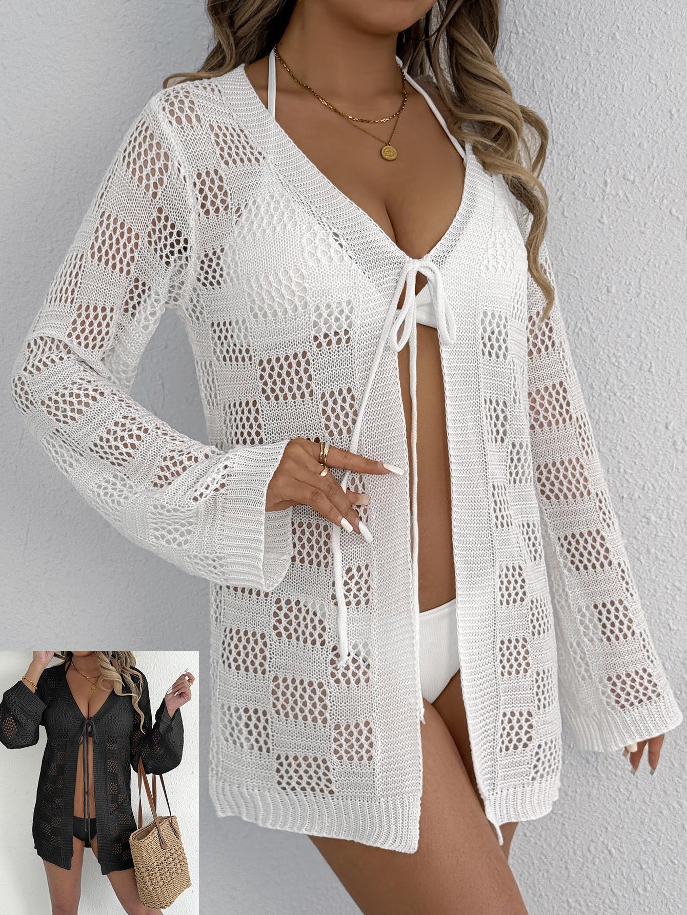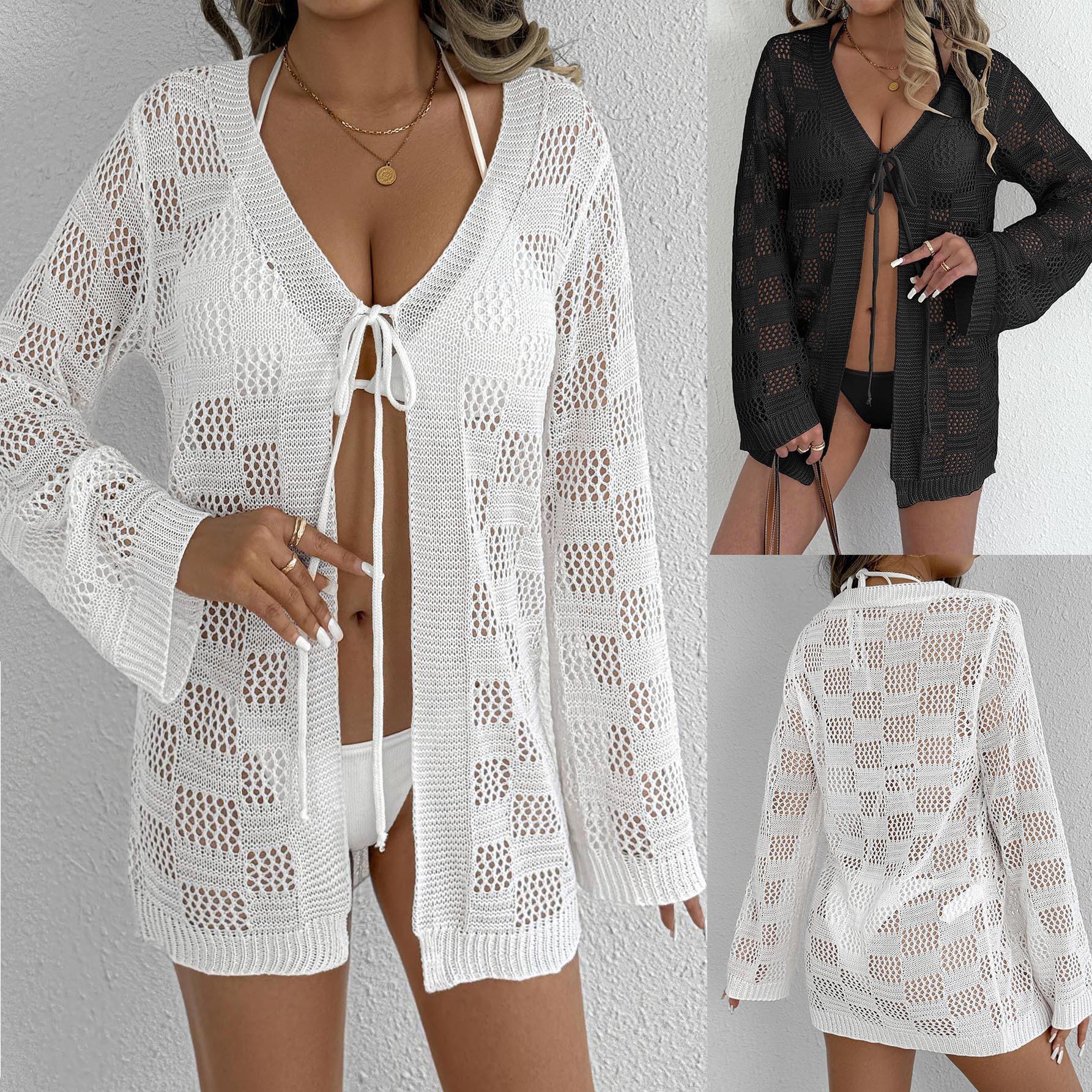 Cárdigan para mujer Transfronterizo Europeo y Americano Camisa Tejida para Mujer Hueca Manga Larga Protector Solar Blusa Bikini de Tirantes Chaqueta de Playa