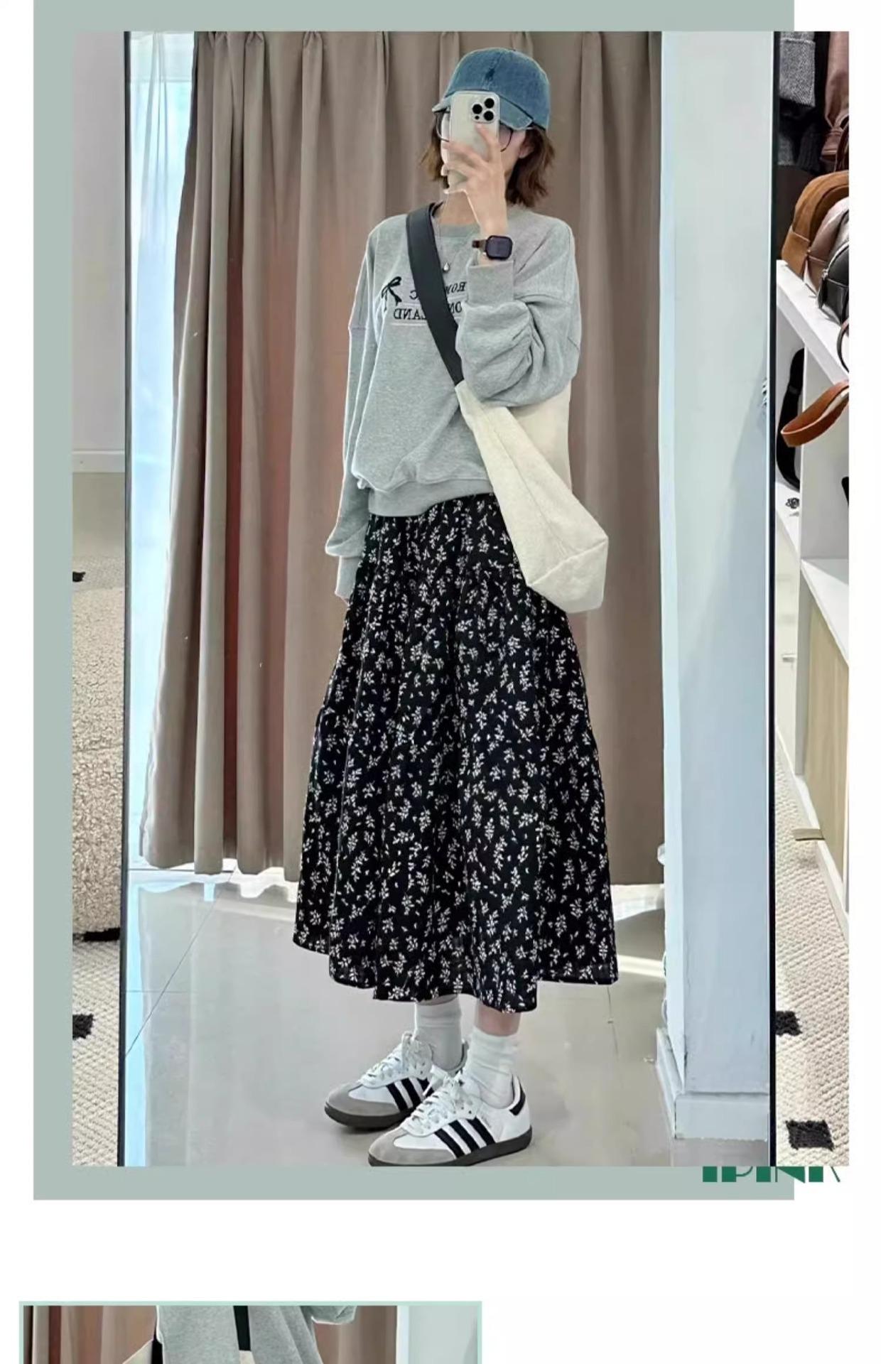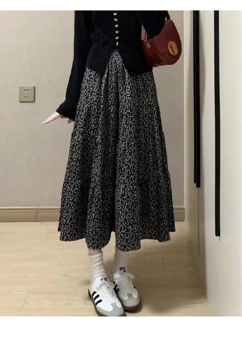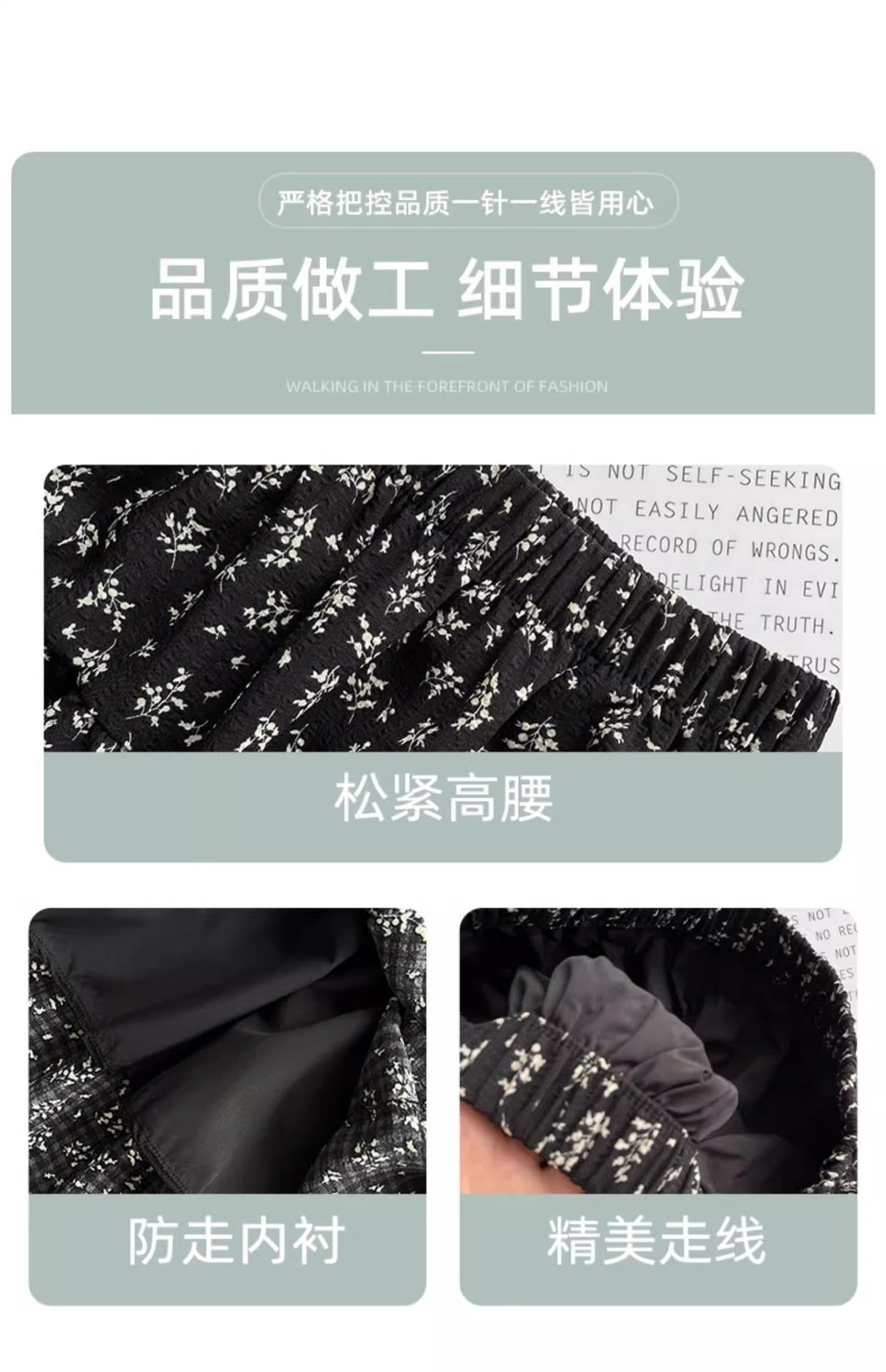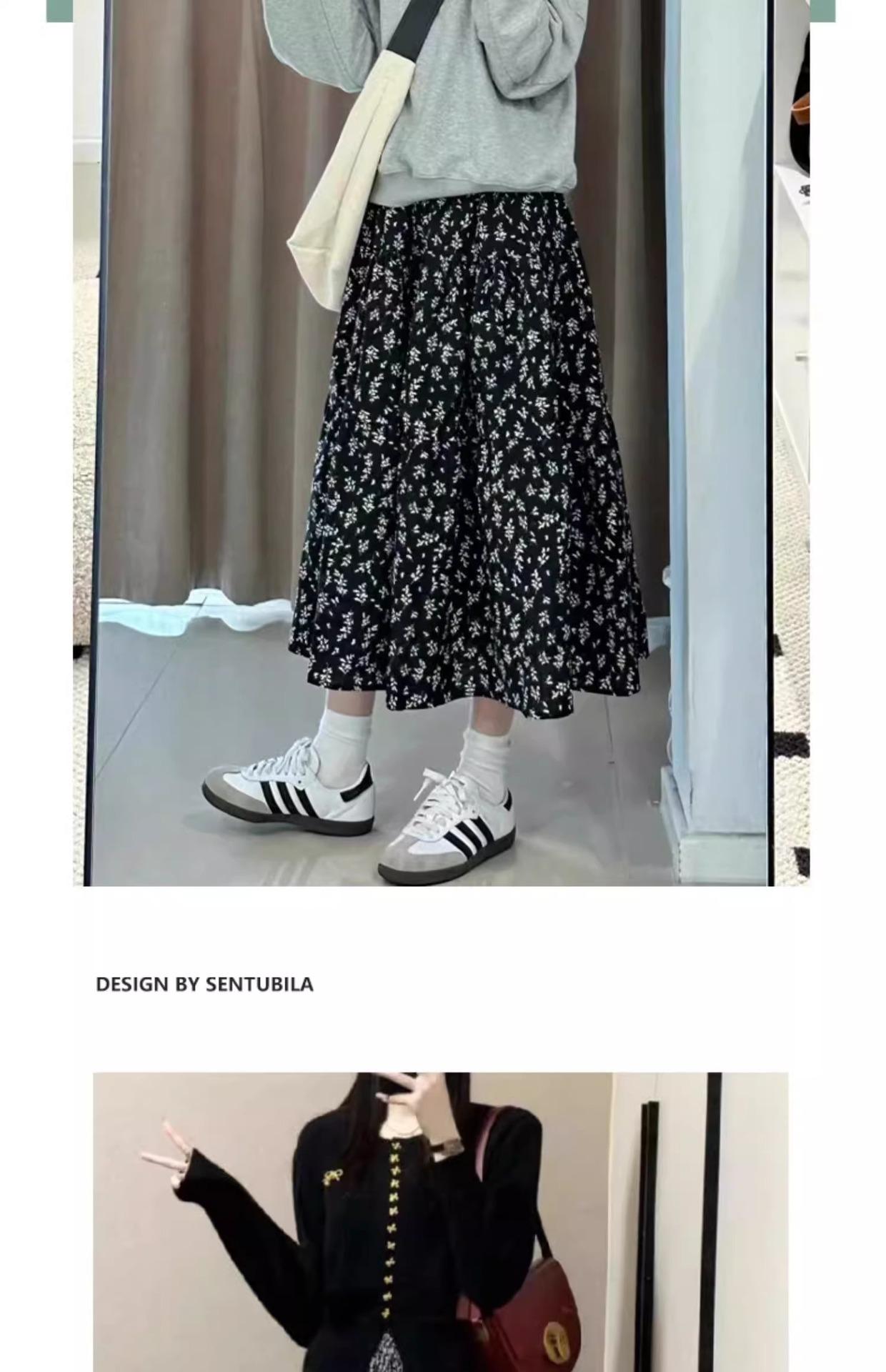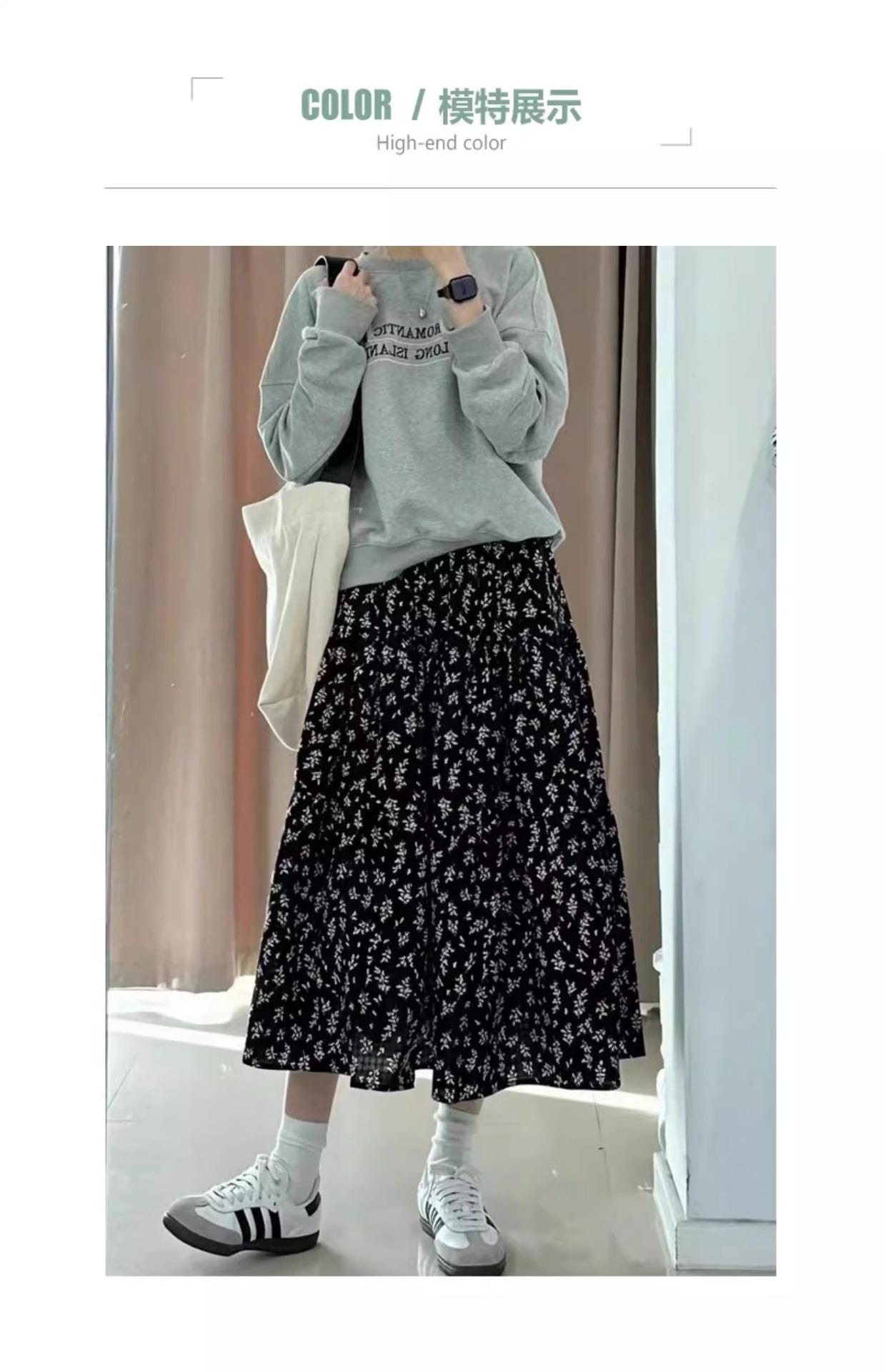 Falda Floral Negra para Mujer 2025 Verano Nueva Cintura Alta Adelgazante Cubre Caderas Falda Línea A Versátil Falda Midi