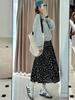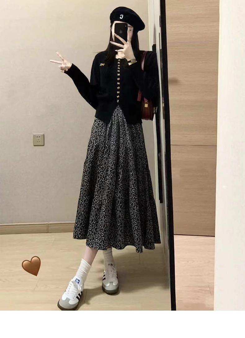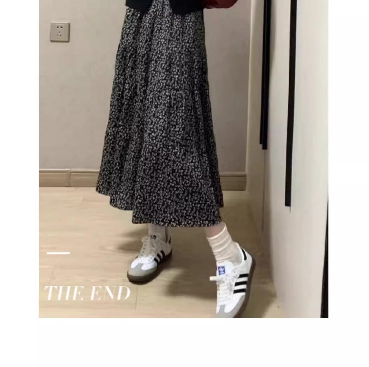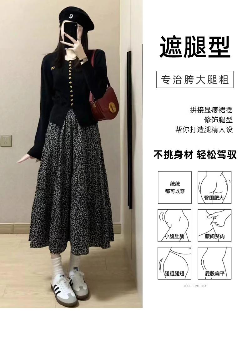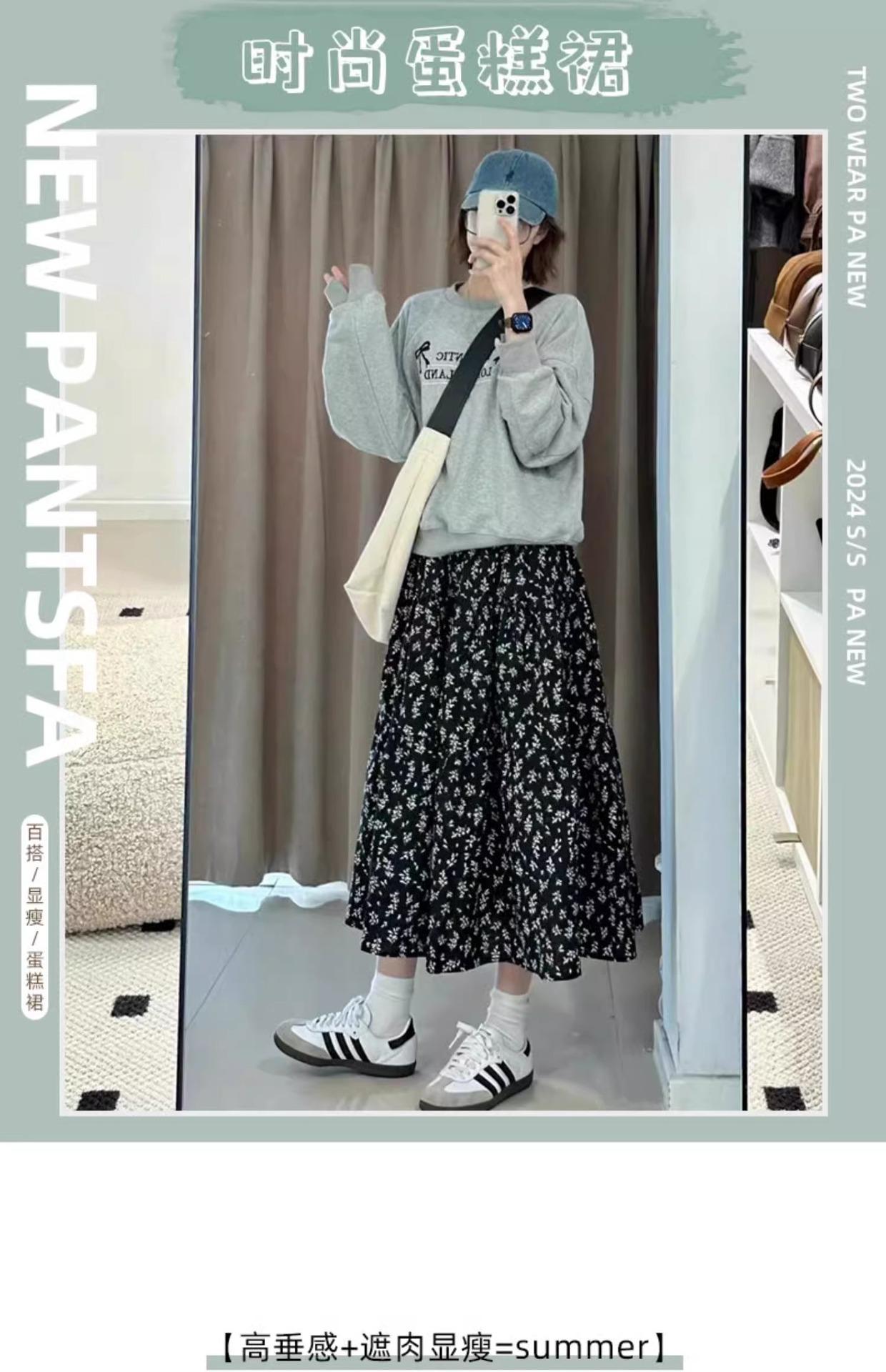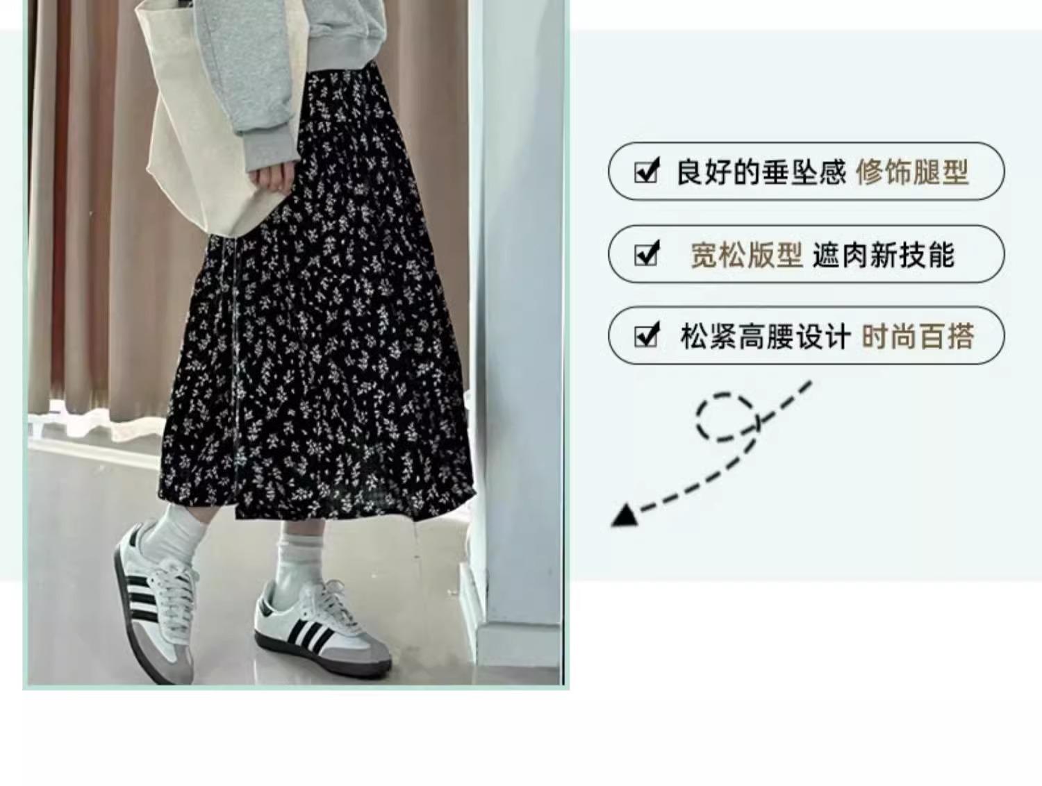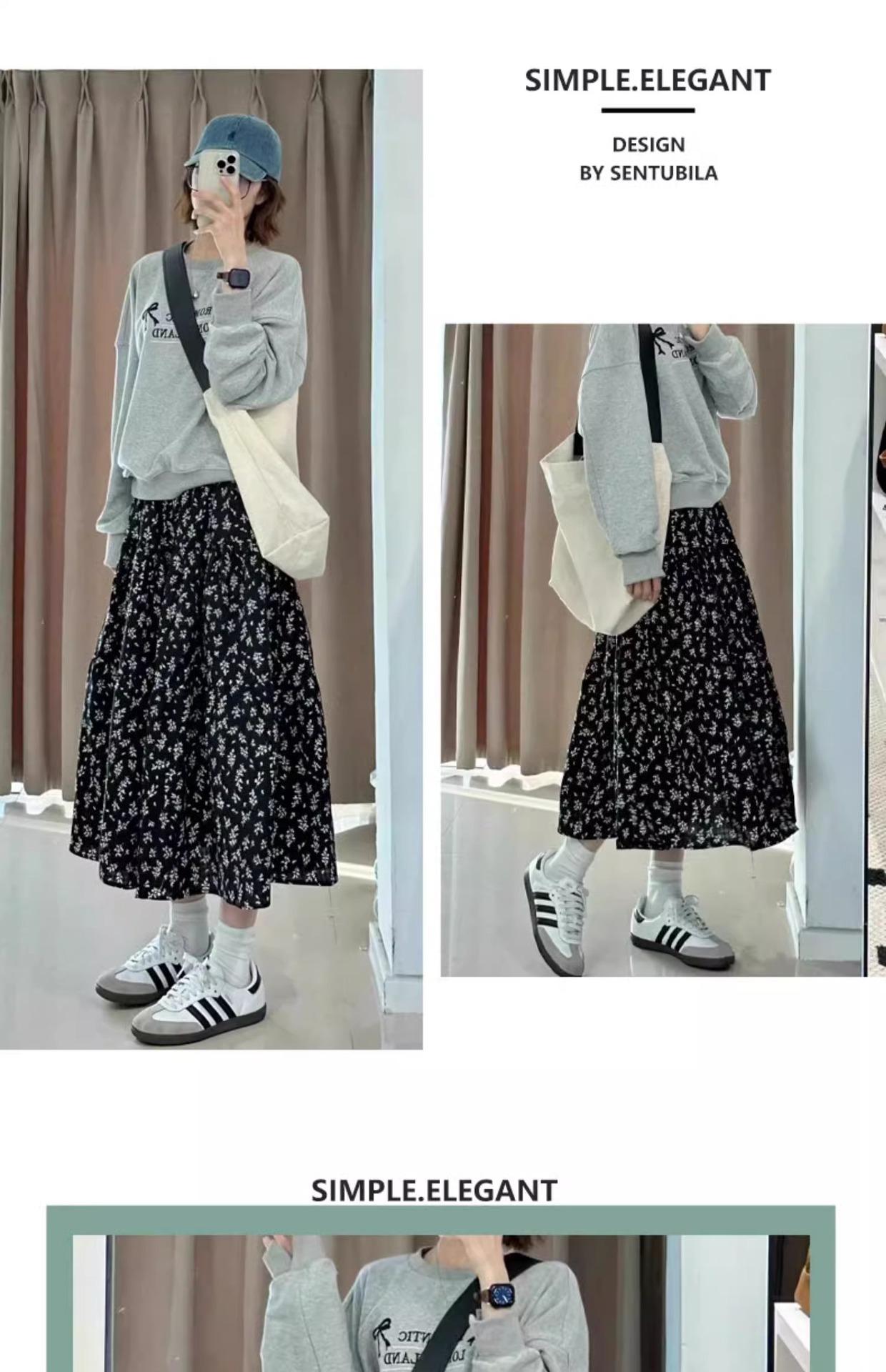 Falda Floral Negra para Mujer 2025 Verano Nueva Cintura Alta Adelgazante Cubre Caderas Falda Línea A Versátil Falda Midi