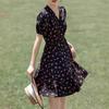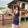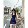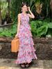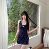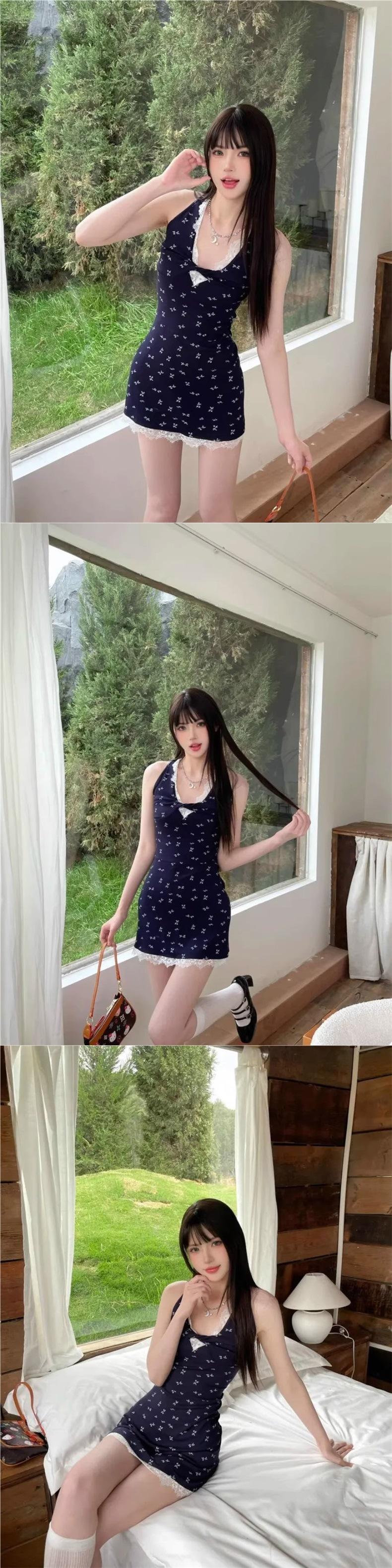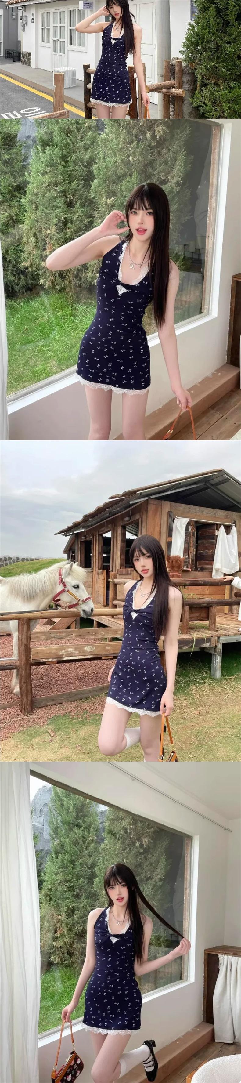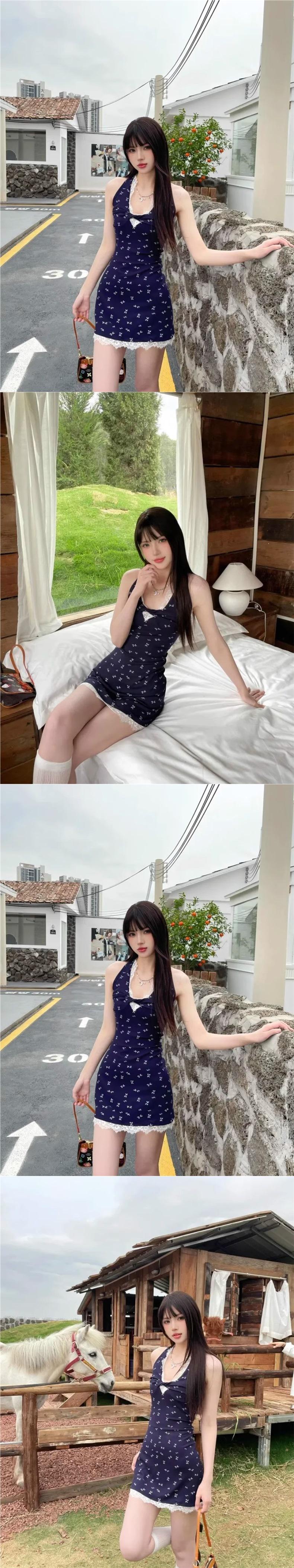 Vestido halter de temperamento de encaje floral patchwork francés 2025 verano nuevo vestido corto adelgazante de alta gama de cintura alta