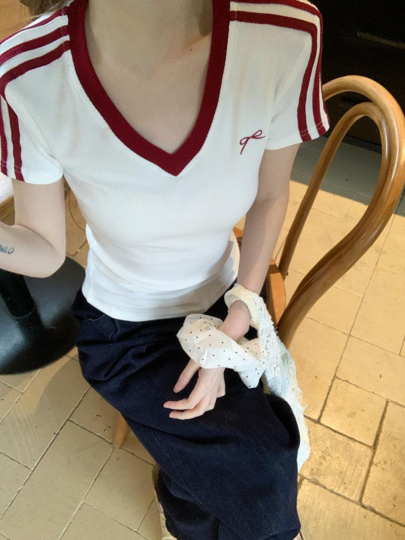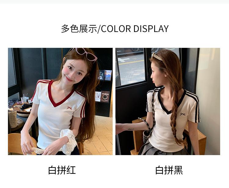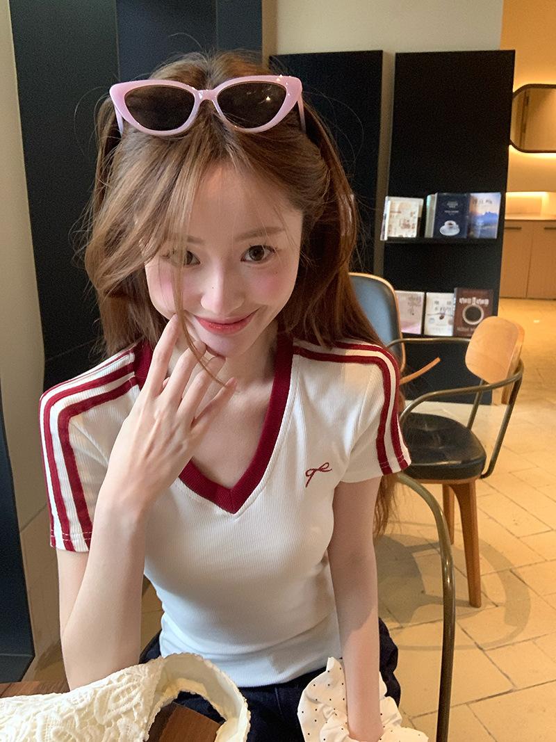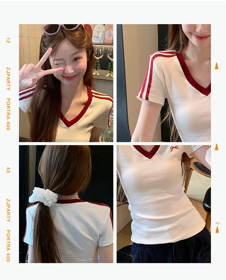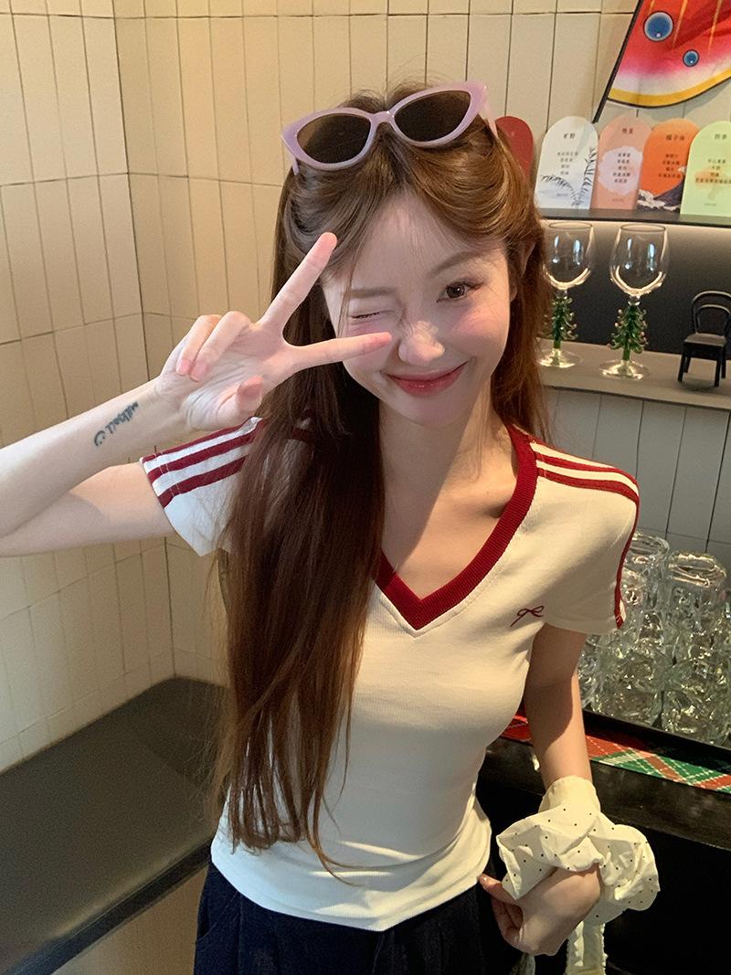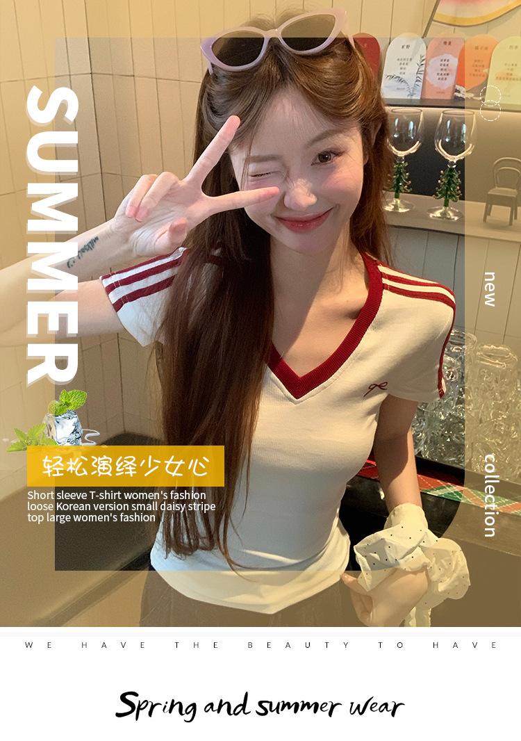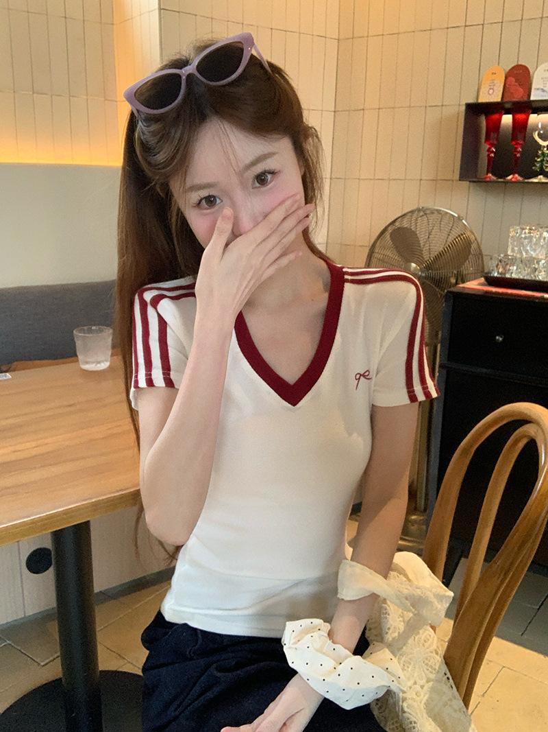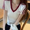 Camiseta Americana de Chica Sexy con Cuello en V y Manga Corta de Tres Rayas para Mujer Verano 2025 Nuevo Estilo Europeo Slim Corta Hombro Derecho Top Trendy