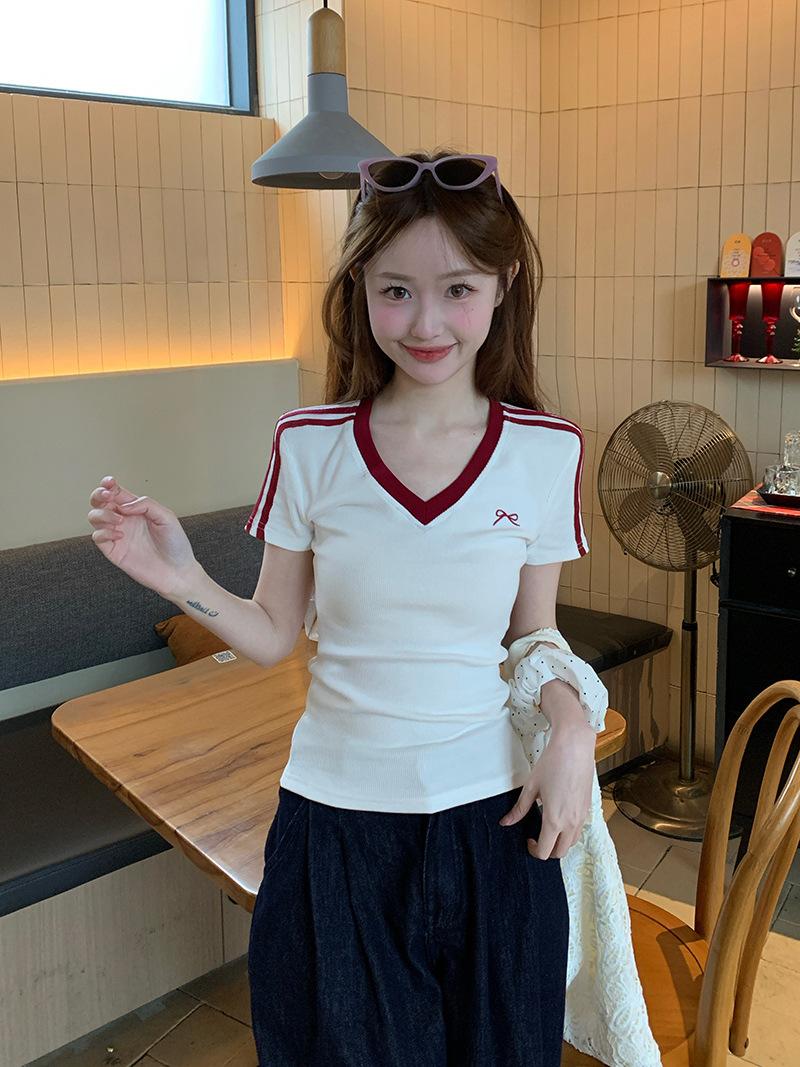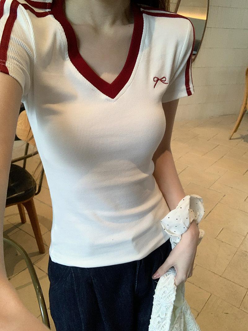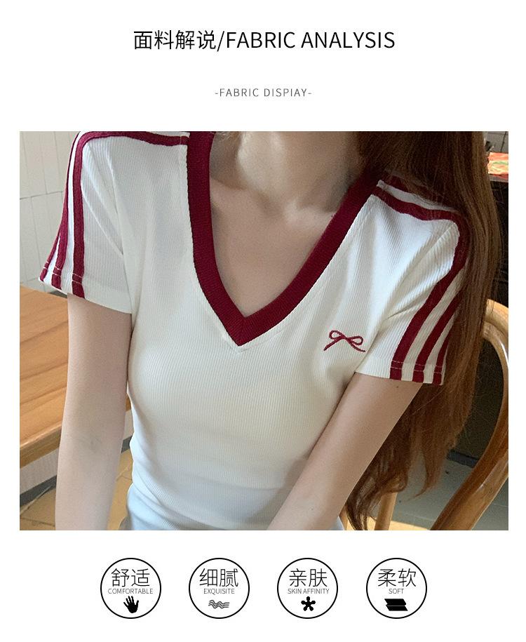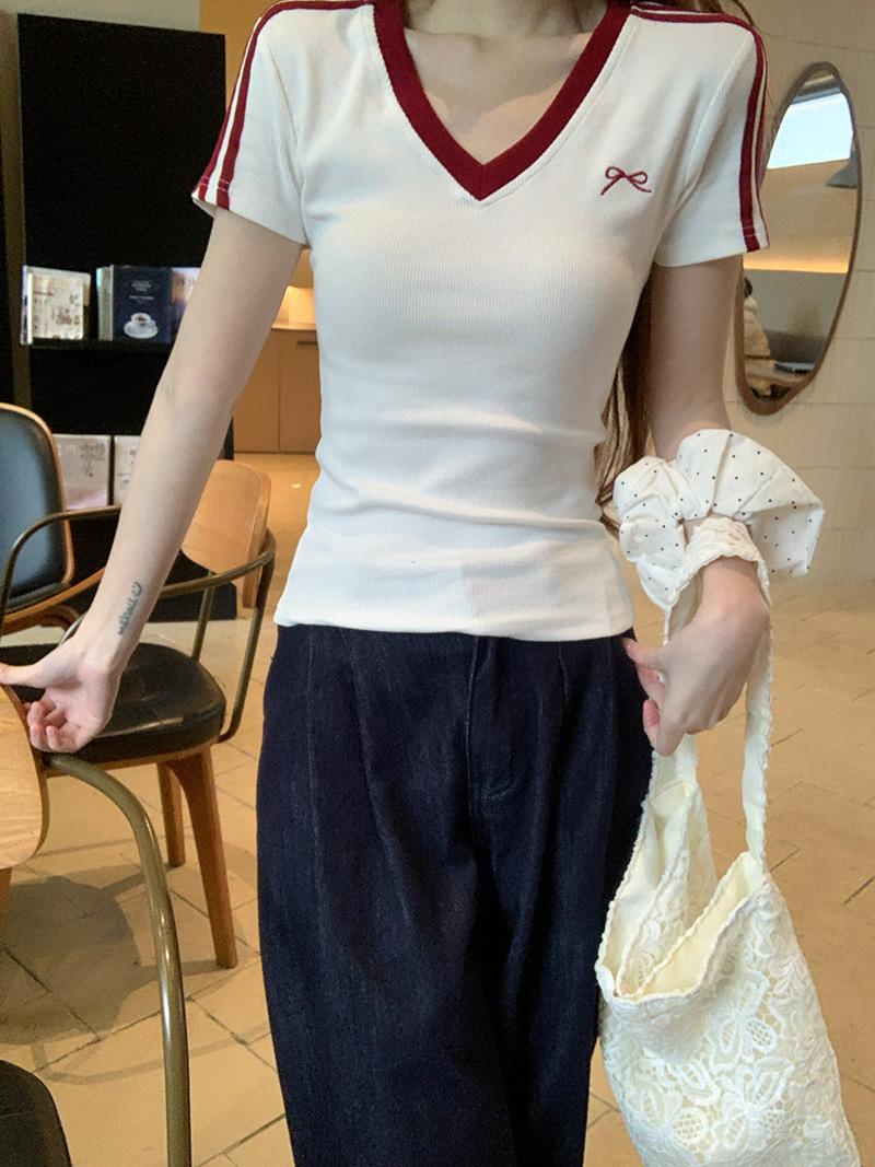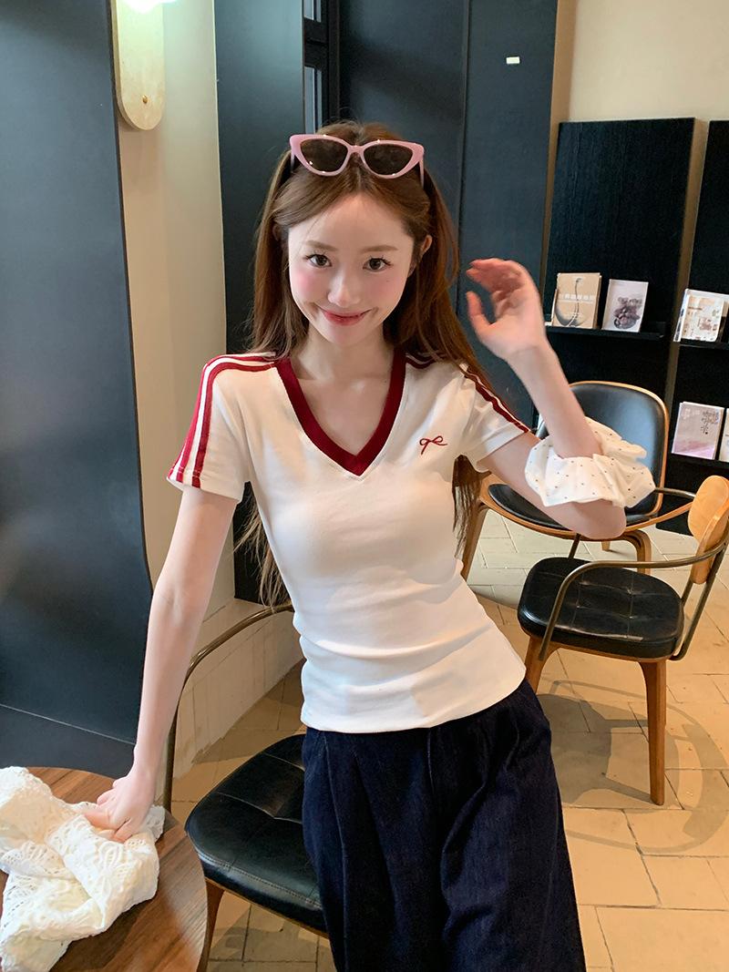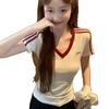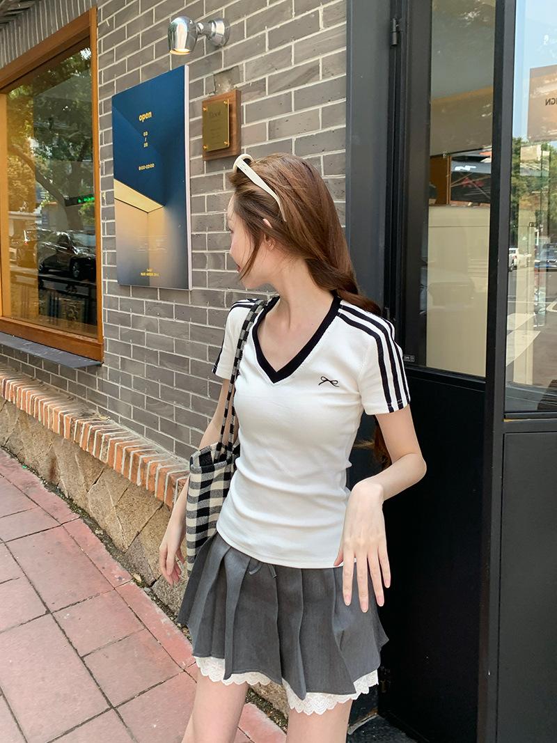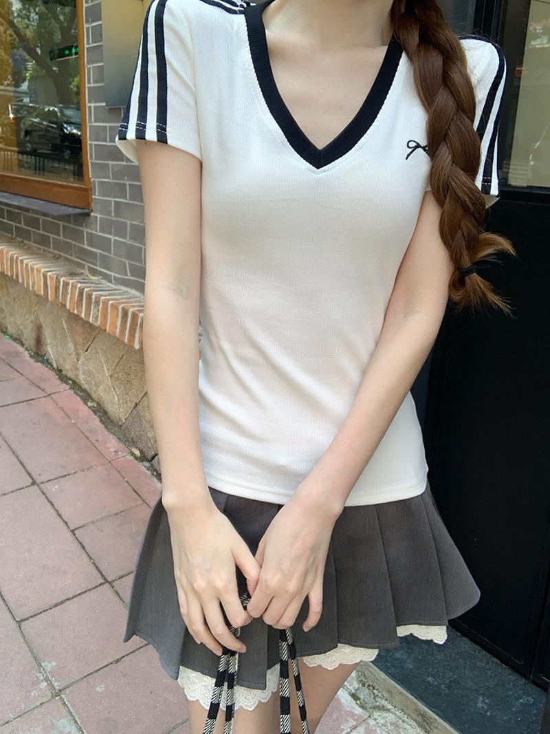 Camiseta Americana de Chica Sexy con Cuello en V y Manga Corta de Tres Rayas para Mujer Verano 2025 Nuevo Estilo Europeo Slim Corta Hombro Derecho Top Trendy