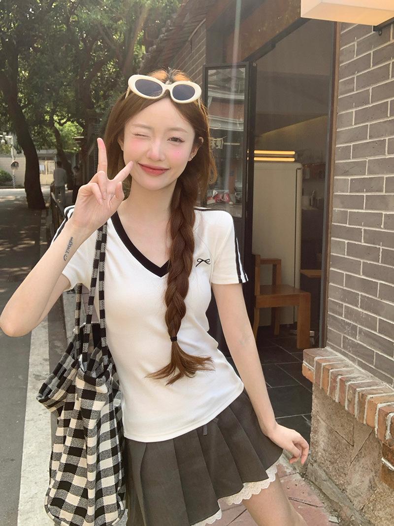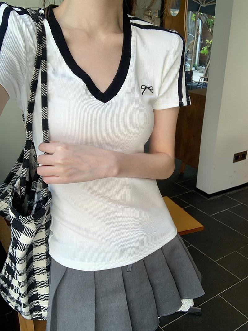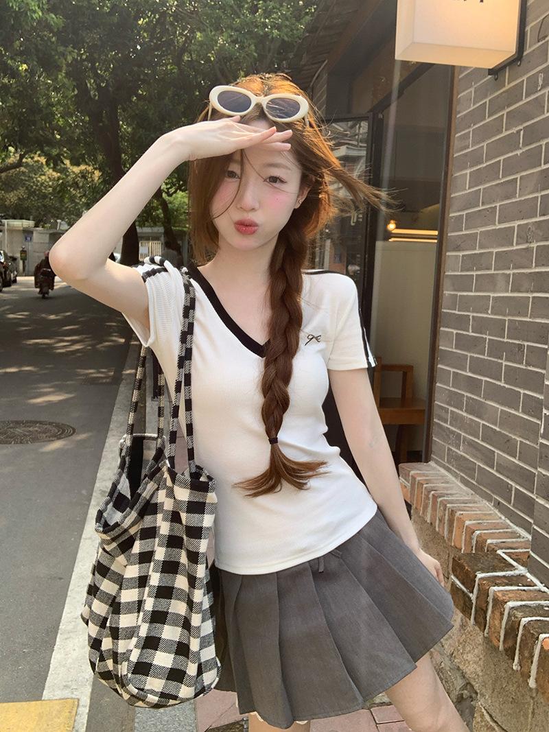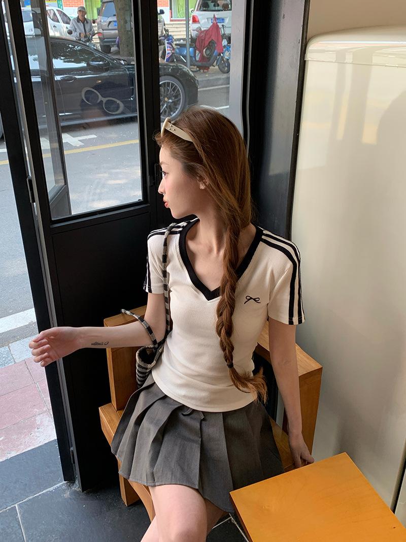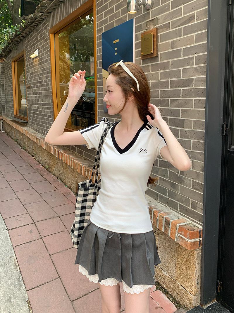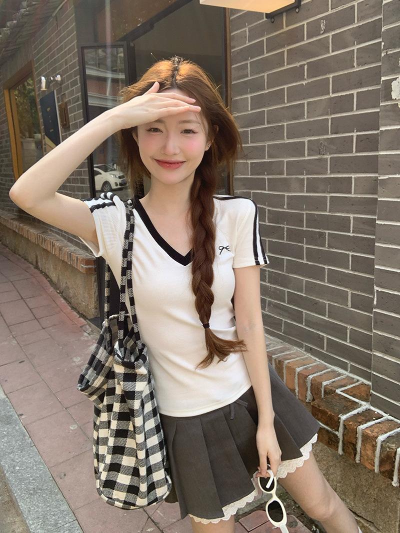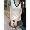 Camiseta Americana de Chica Sexy con Cuello en V y Manga Corta de Tres Rayas para Mujer Verano 2025 Nuevo Estilo Europeo Slim Corta Hombro Derecho Top Trendy