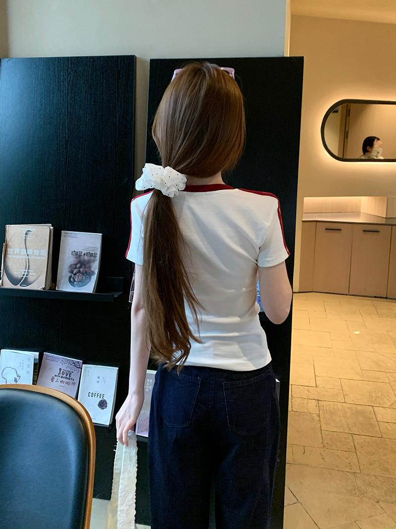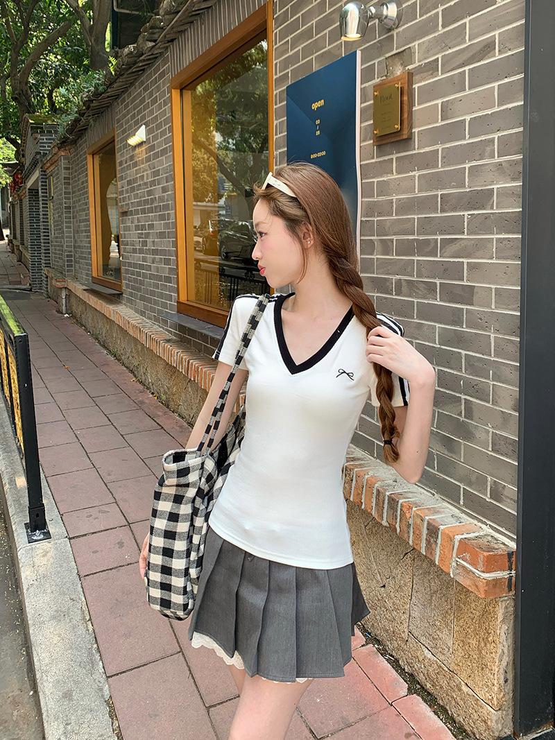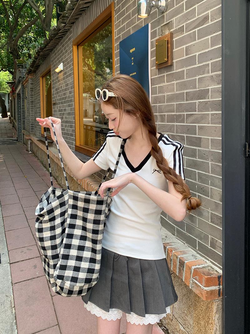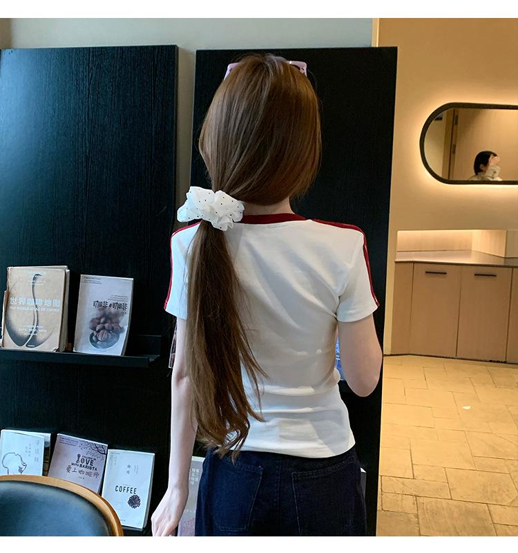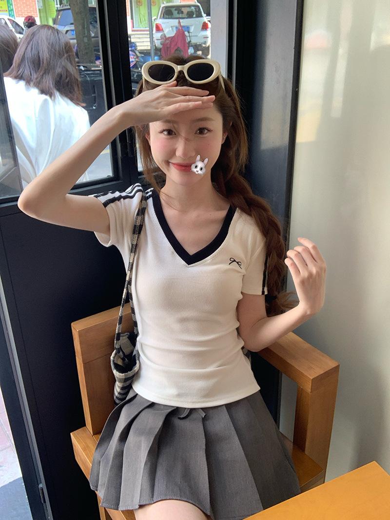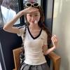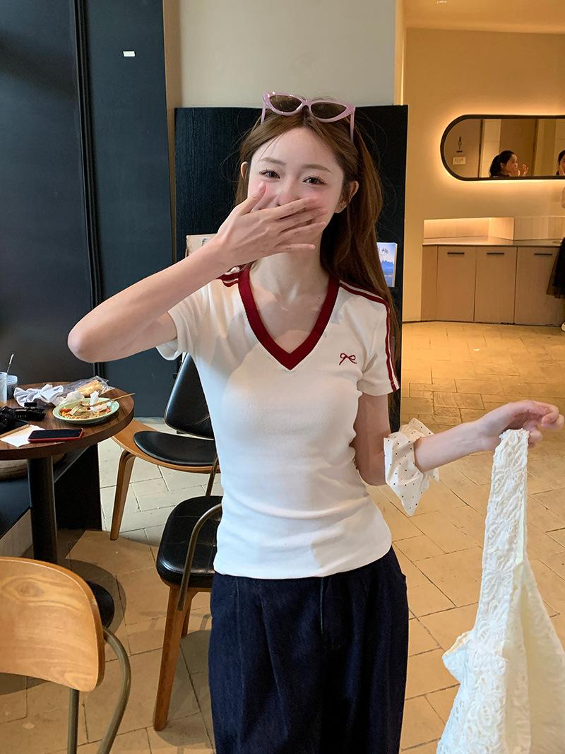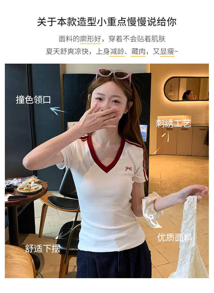 Camiseta Americana de Chica Sexy con Cuello en V y Manga Corta de Tres Rayas para Mujer Verano 2025 Nuevo Estilo Europeo Slim Corta Hombro Derecho Top Trendy