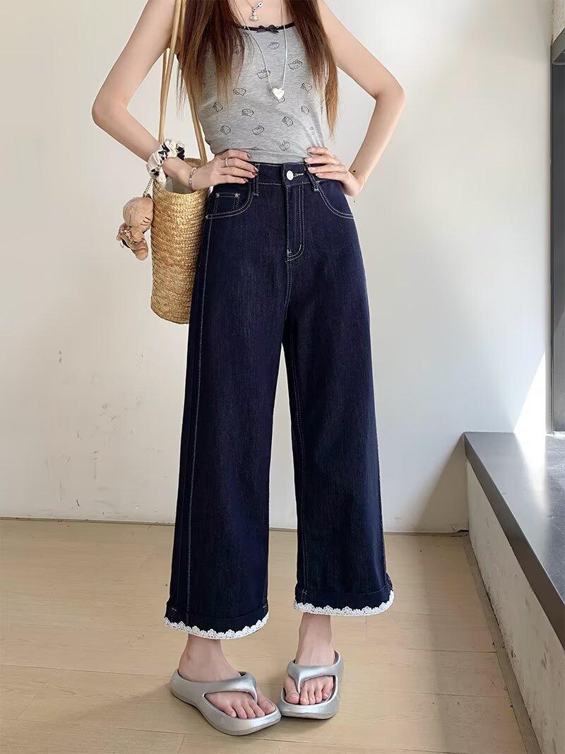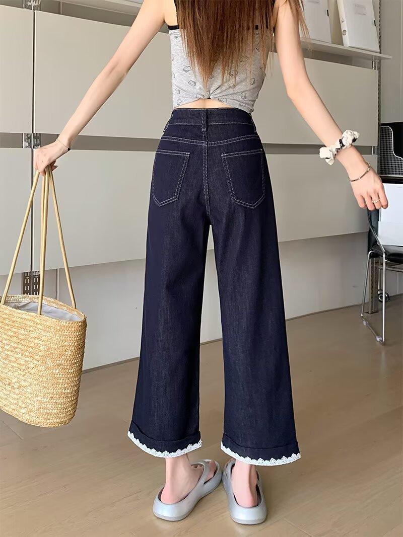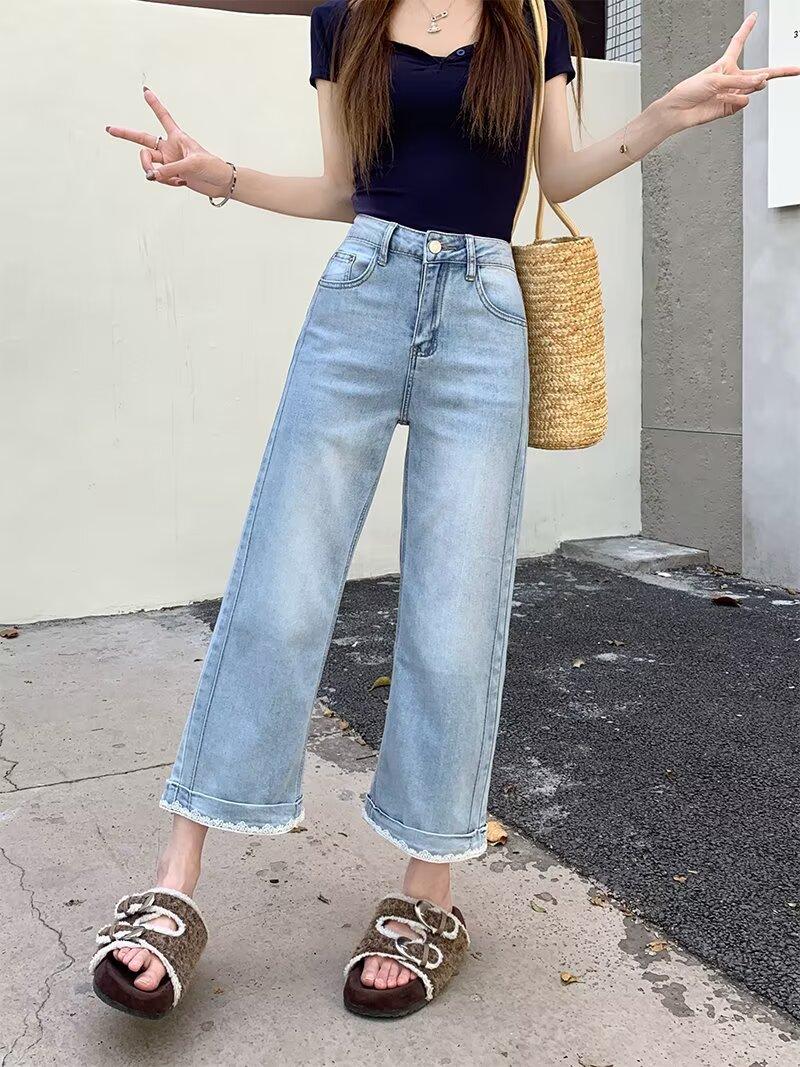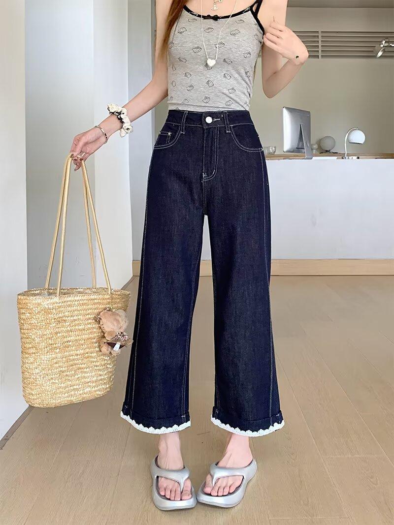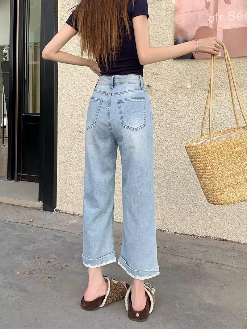 Jeans Recortados de Pierna Ancha en Color Claro para Mujer 2025 Nuevo Primavera y Verano Talla Extra Cintura Alta Adelgazantes Encaje Pantalones Rectos