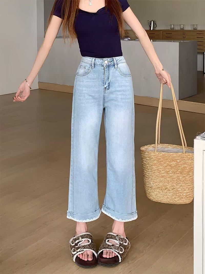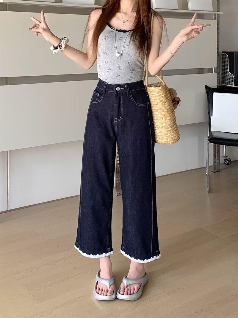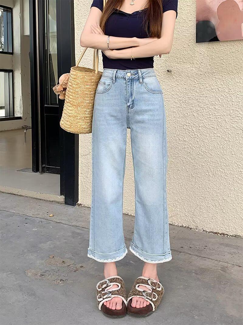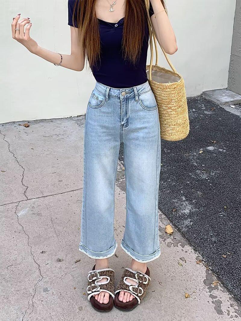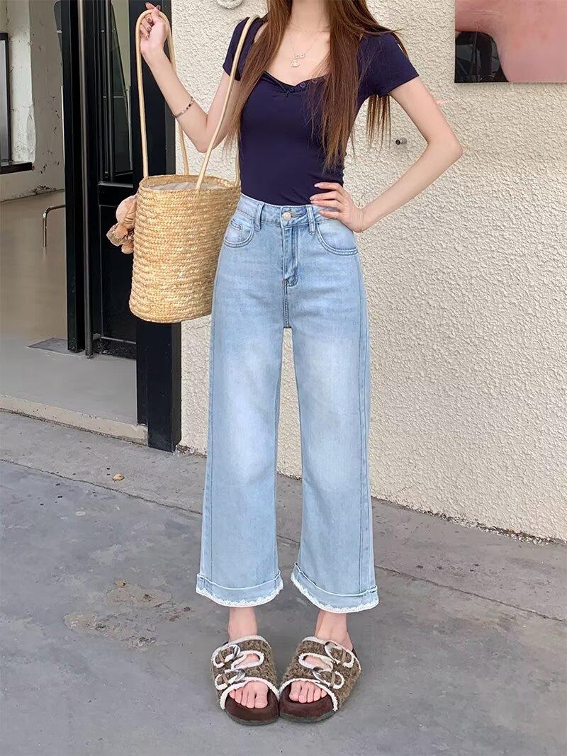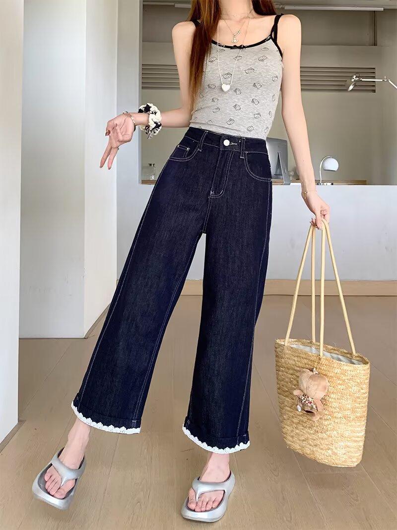 Jeans Recortados de Pierna Ancha en Color Claro para Mujer 2025 Nuevo Primavera y Verano Talla Extra Cintura Alta Adelgazantes Encaje Pantalones Rectos
