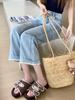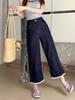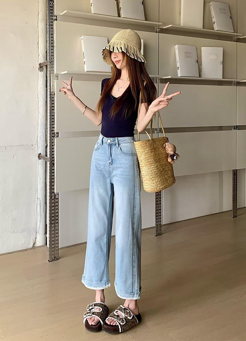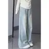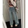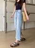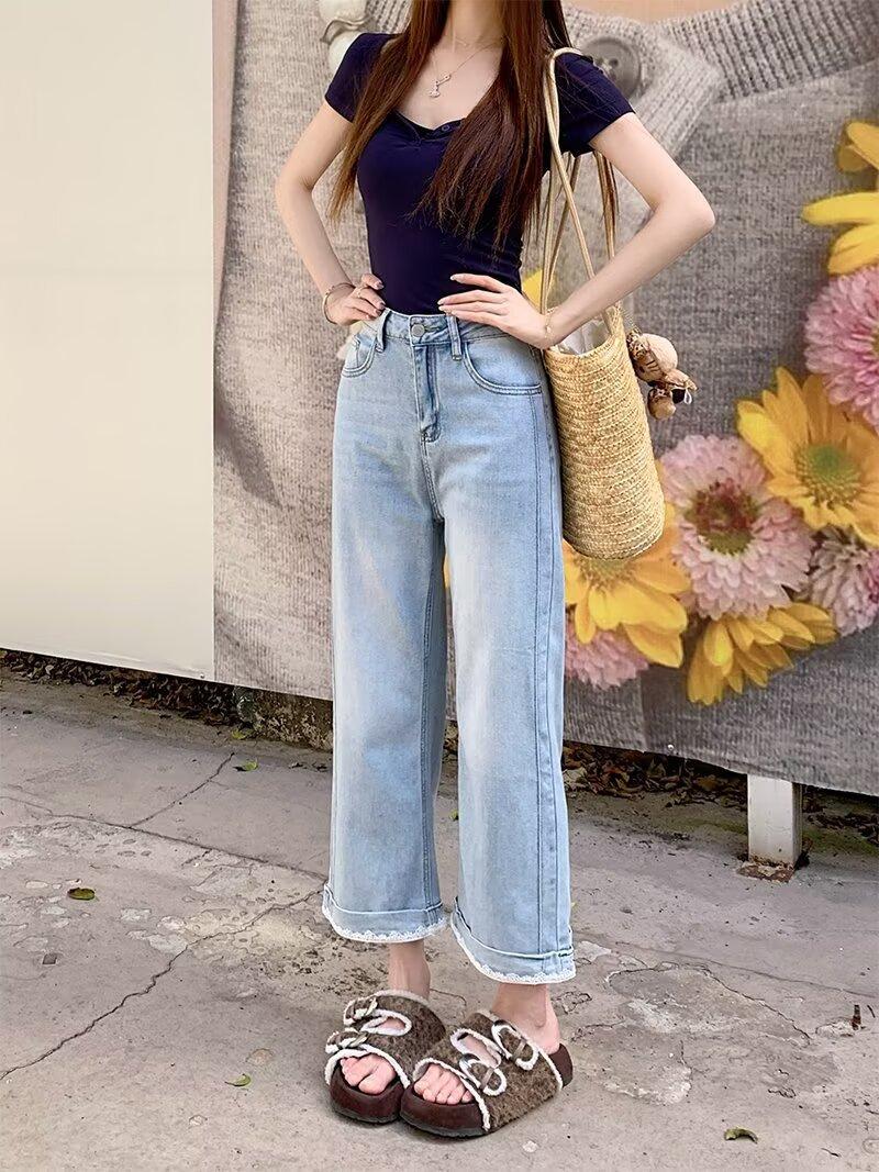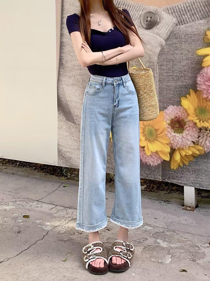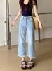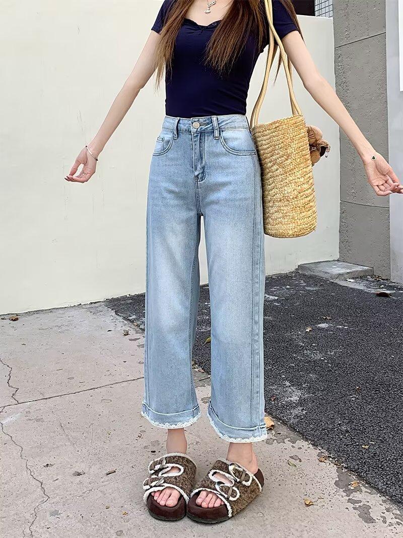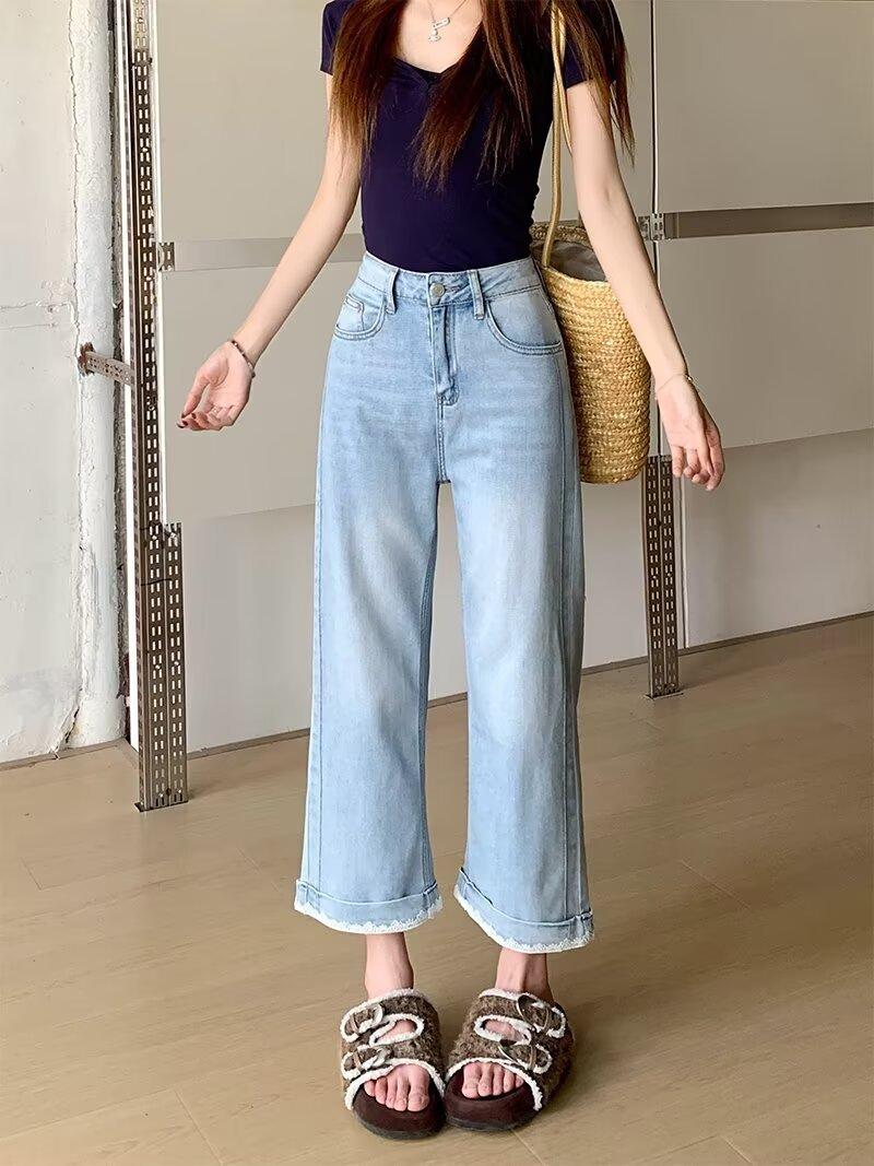 Jeans Recortados de Pierna Ancha en Color Claro para Mujer 2025 Nuevo Primavera y Verano Talla Extra Cintura Alta Adelgazantes Encaje Pantalones Rectos