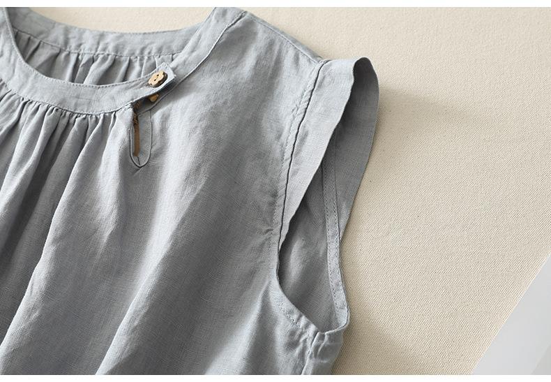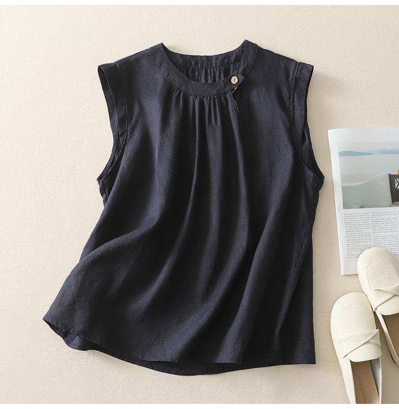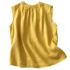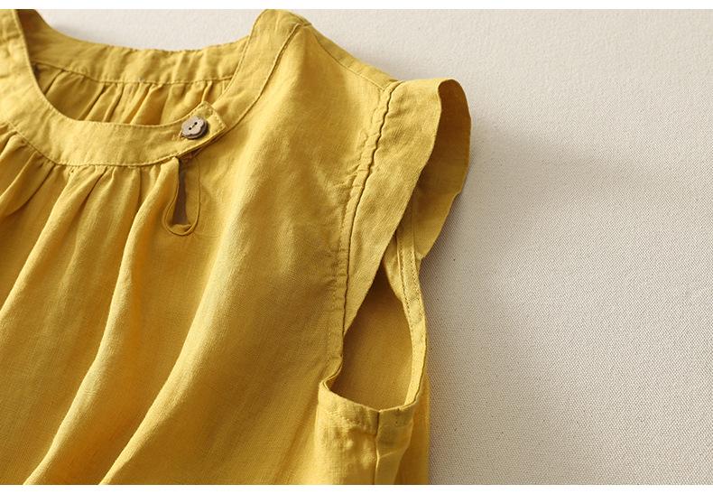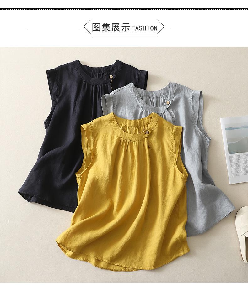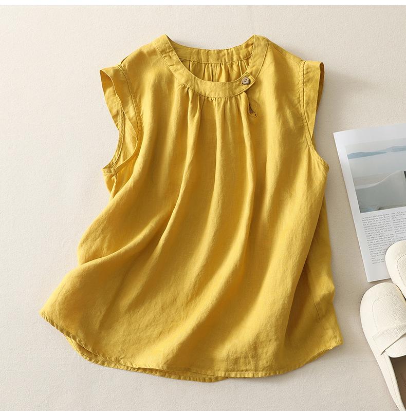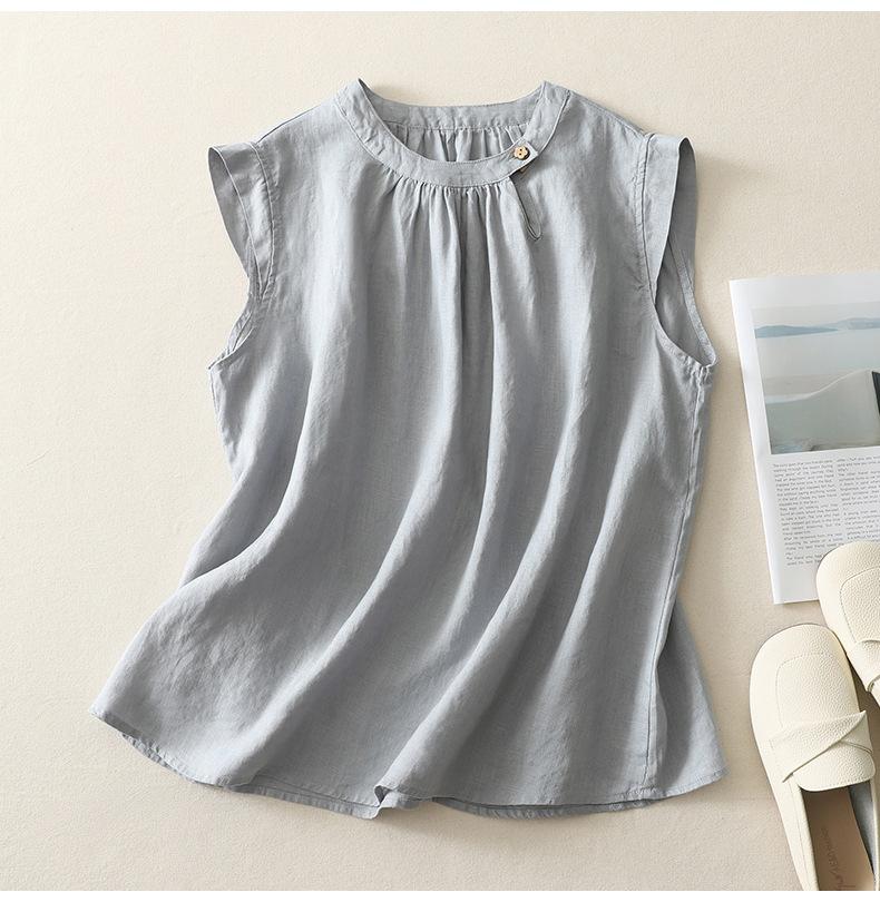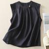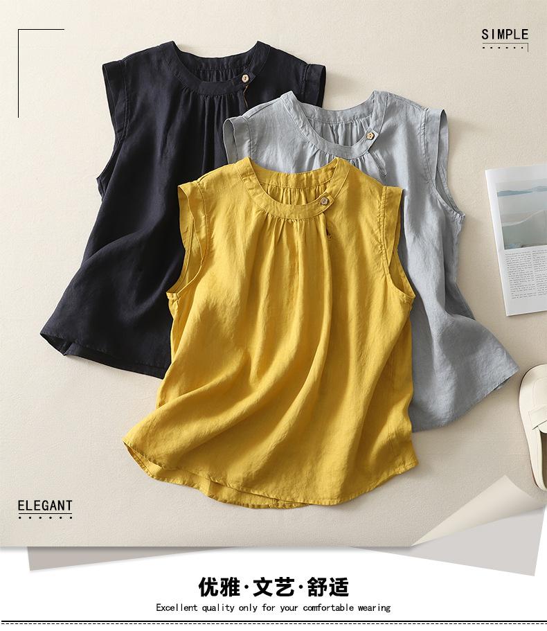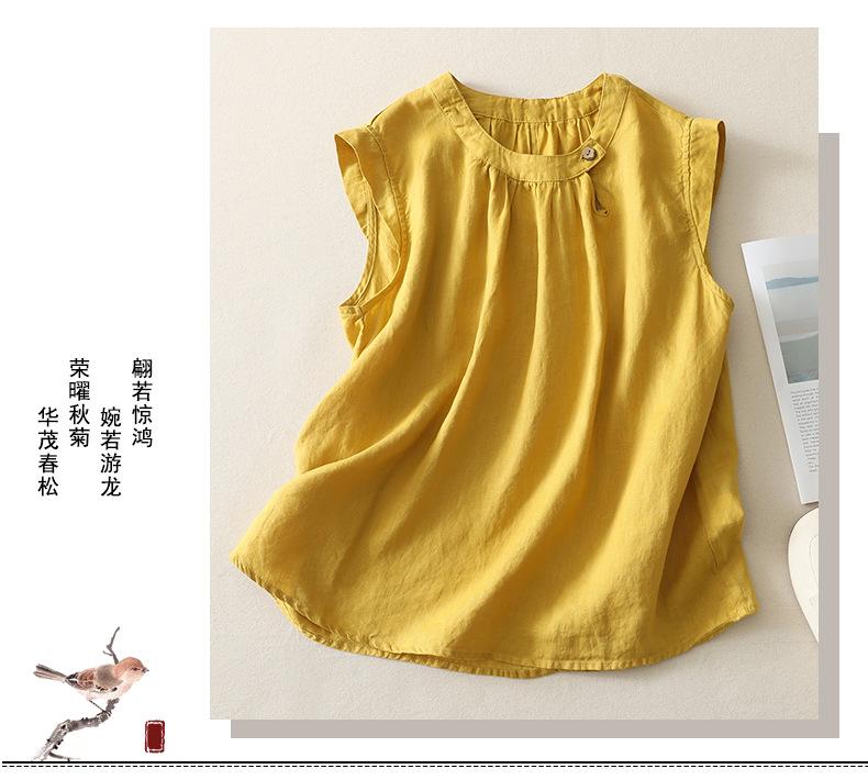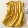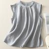 Foto real en stock verano 2025 nuevo diseño sentido cuello redondo algodón y lino camisa sin mangas mujer versátil top de manga abullonada pequeña mujer