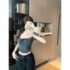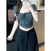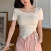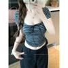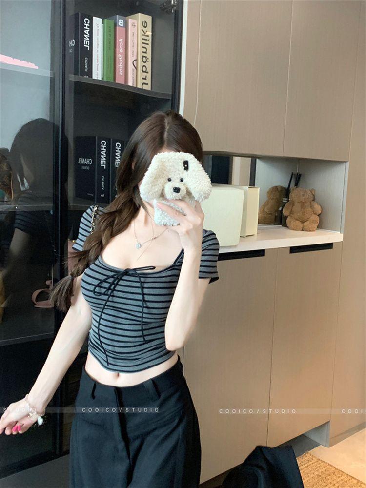 Diseño nicho sentido hombro recto cuello cuadrado camiseta de manga corta a rayas mujer verano chica caliente corto ajuste ceñido adelgazante top deseo puro
