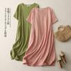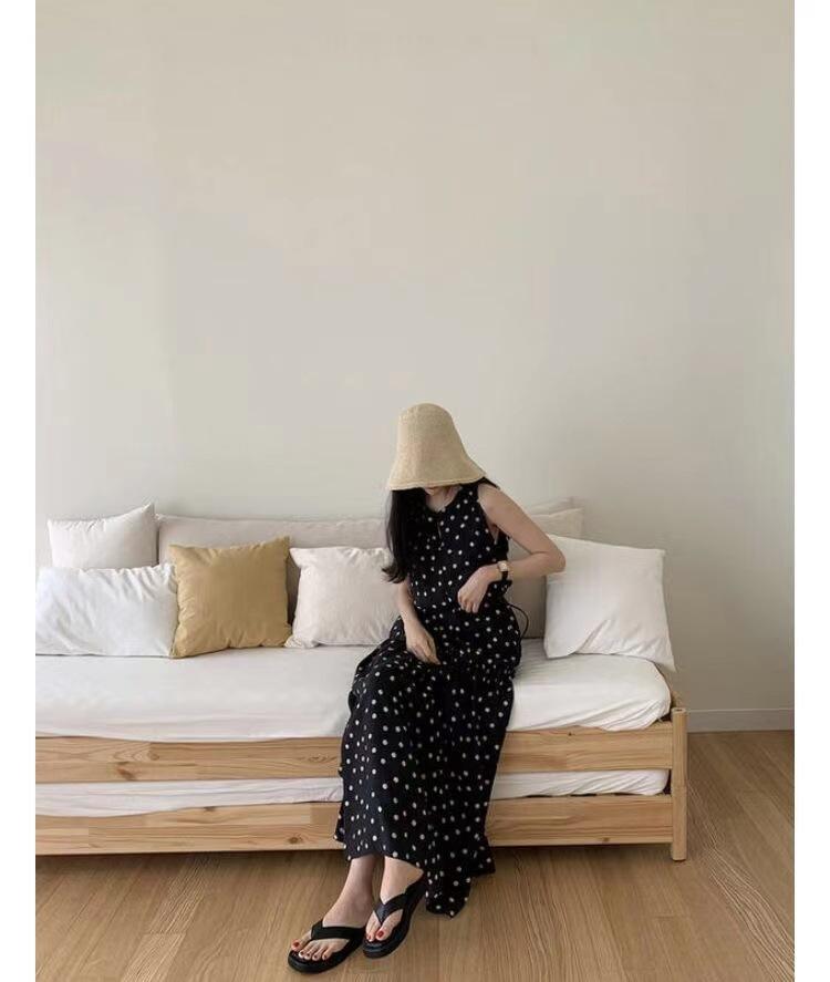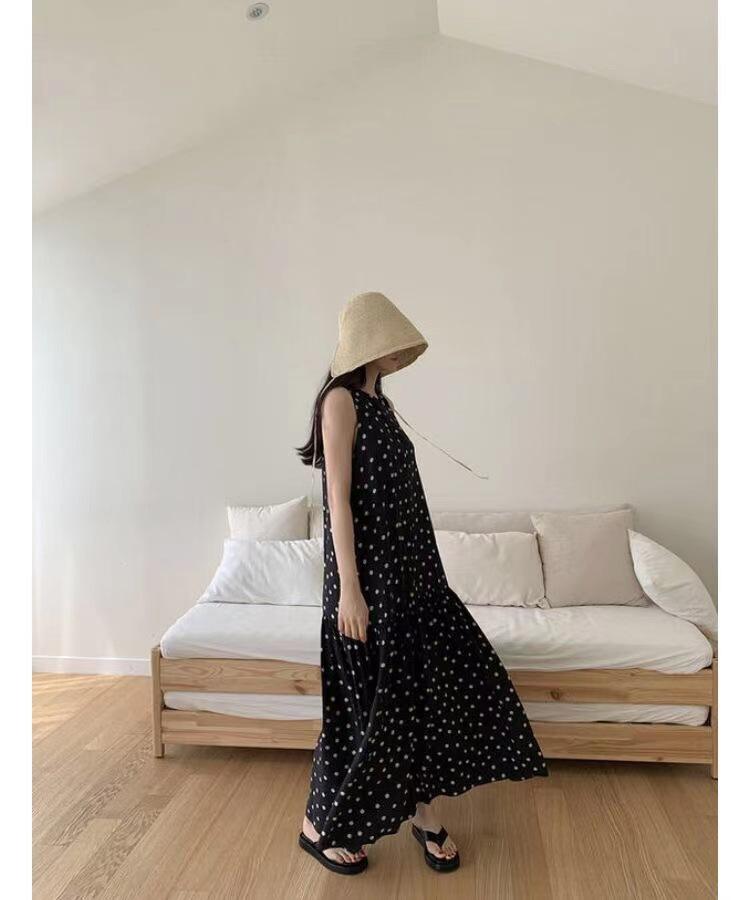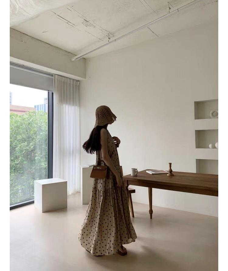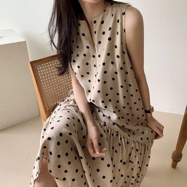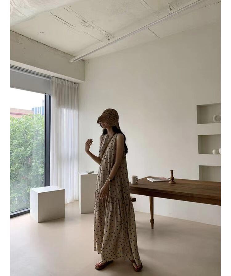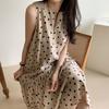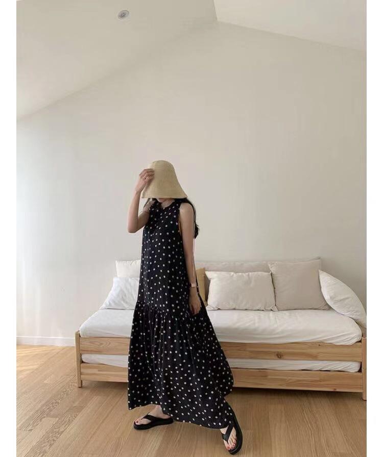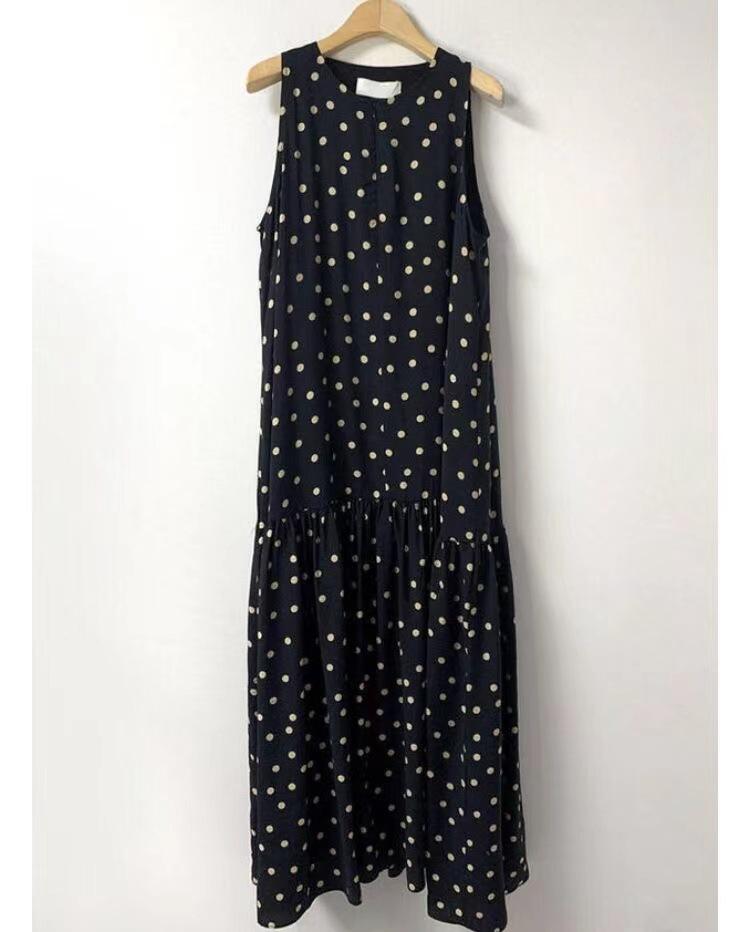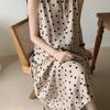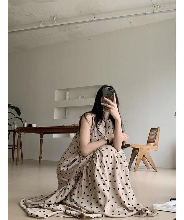 Vestido Coreano Chic de Verano Elegante Cuello Redondo Diseño de Cremallera Suelto Casual Largo Dobladillo Grande Lunares para Mujer