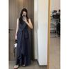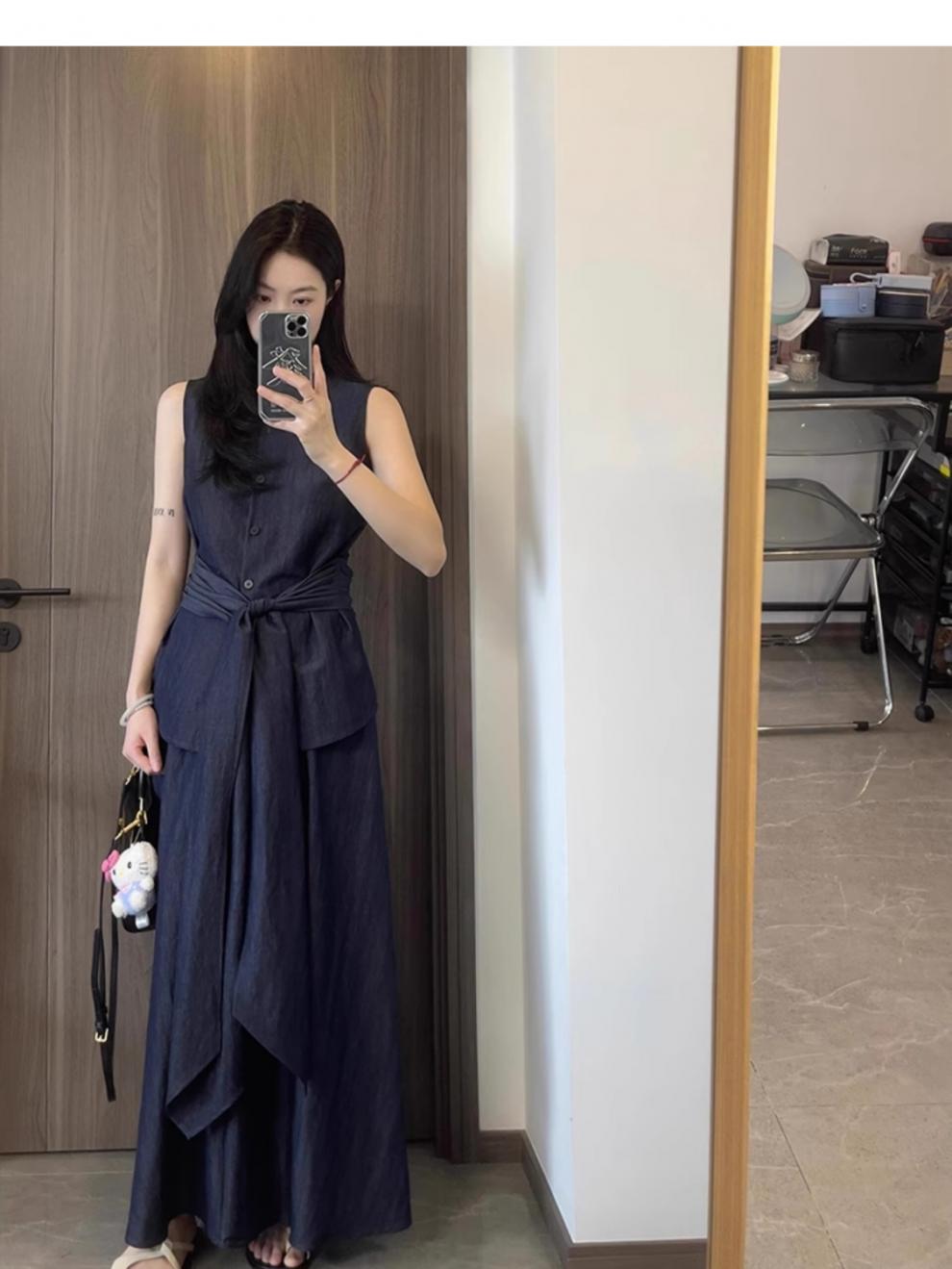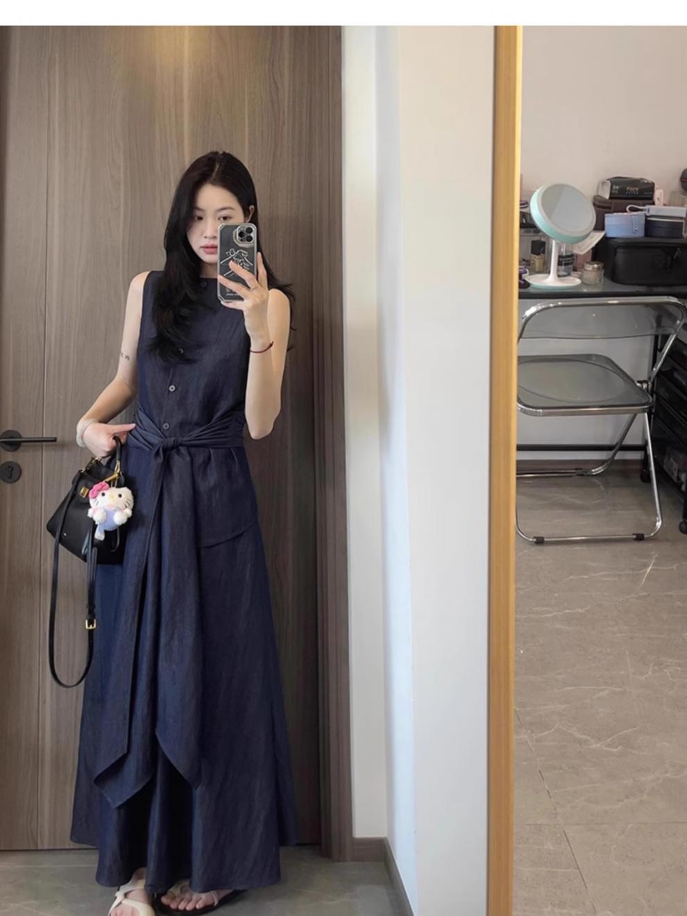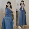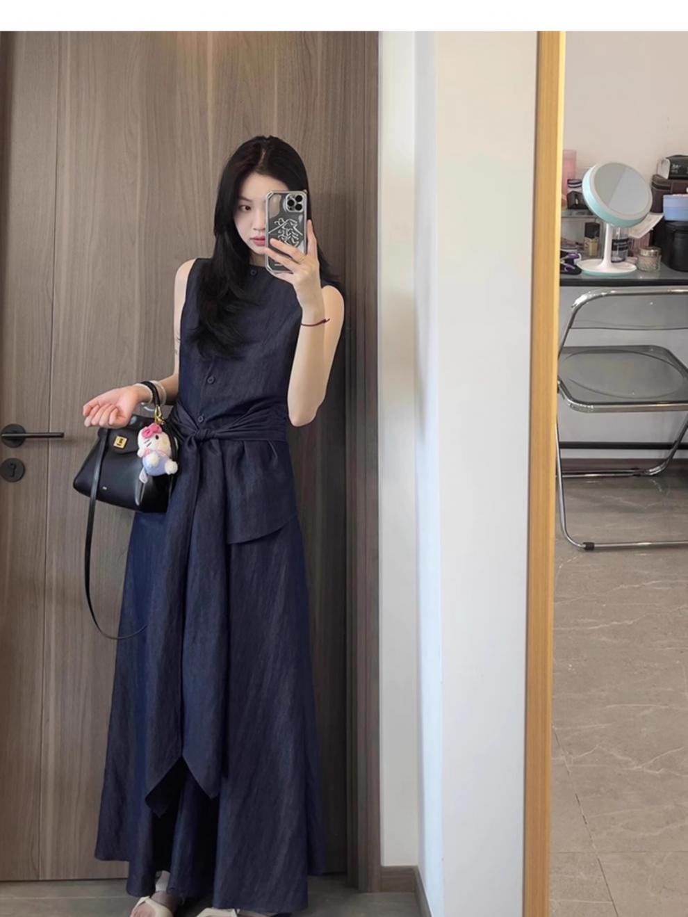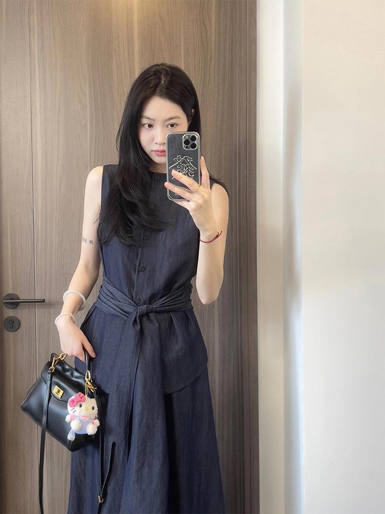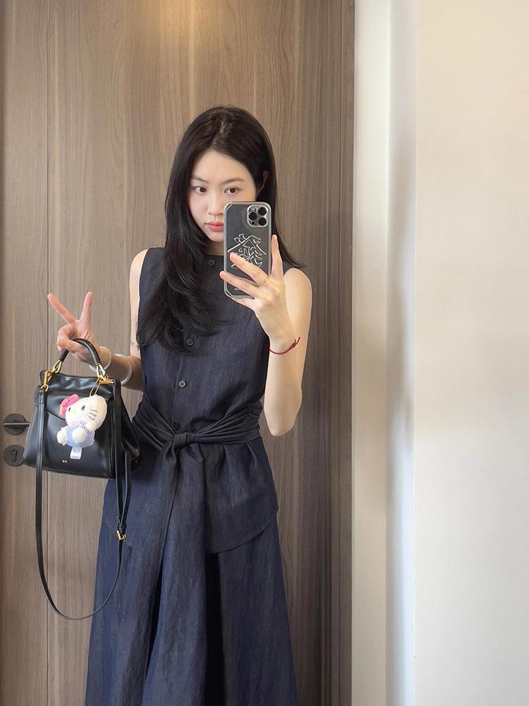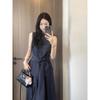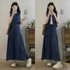 Top Azul sin Mangas Estilo Hepburn Estilo Francés + Falda Traje de Temperamento de Verano Nuevo para Mujer