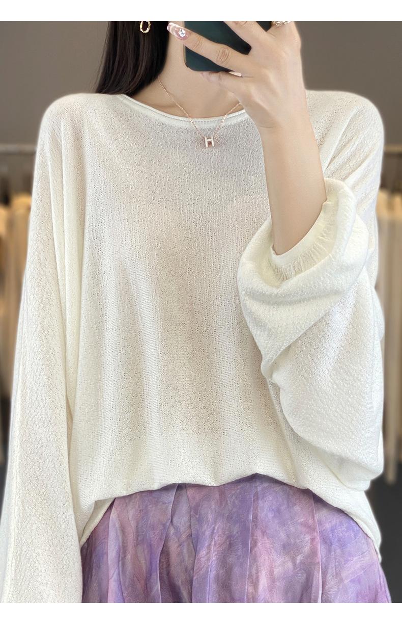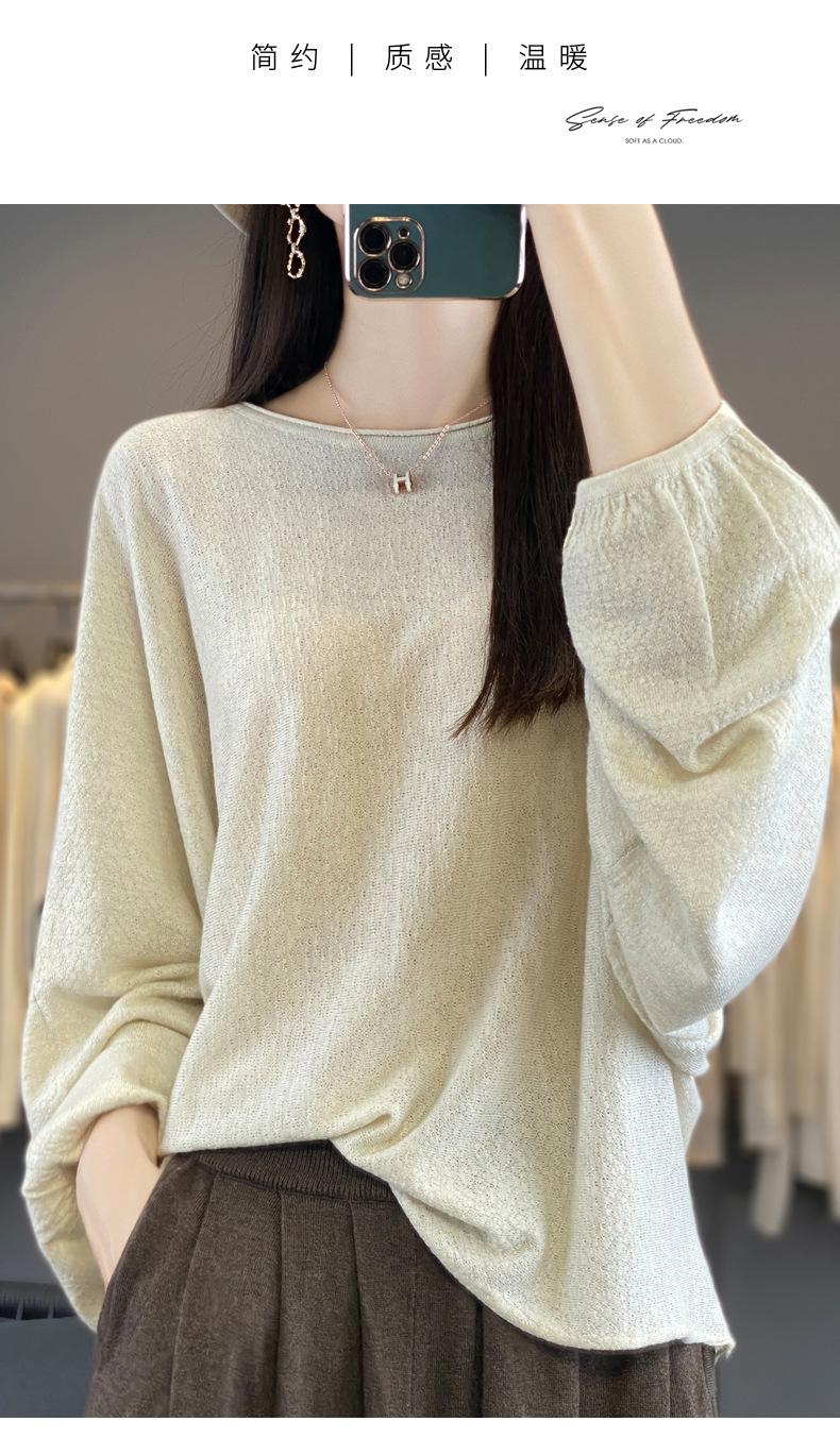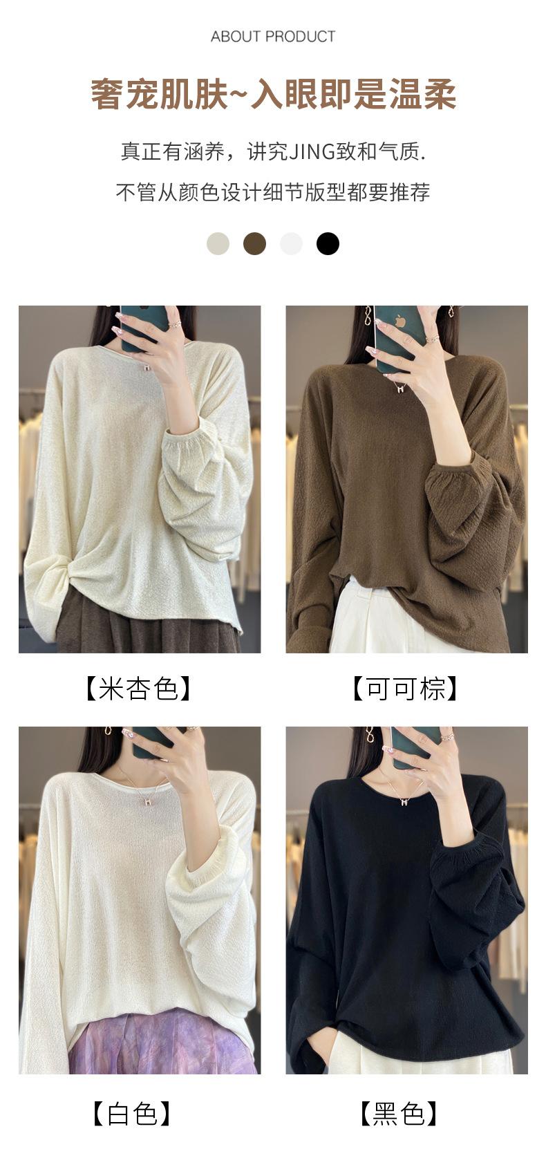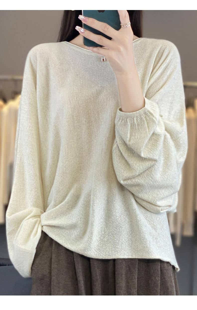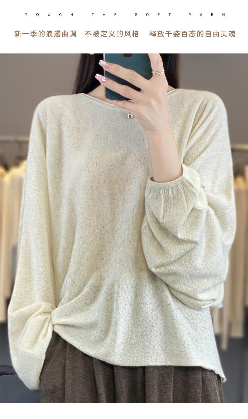 2025 primavera y verano nuevo suéter de lana peinada de viento perezoso, cuello redondo, manga larga de murciélago, color sólido, camisa base delgada