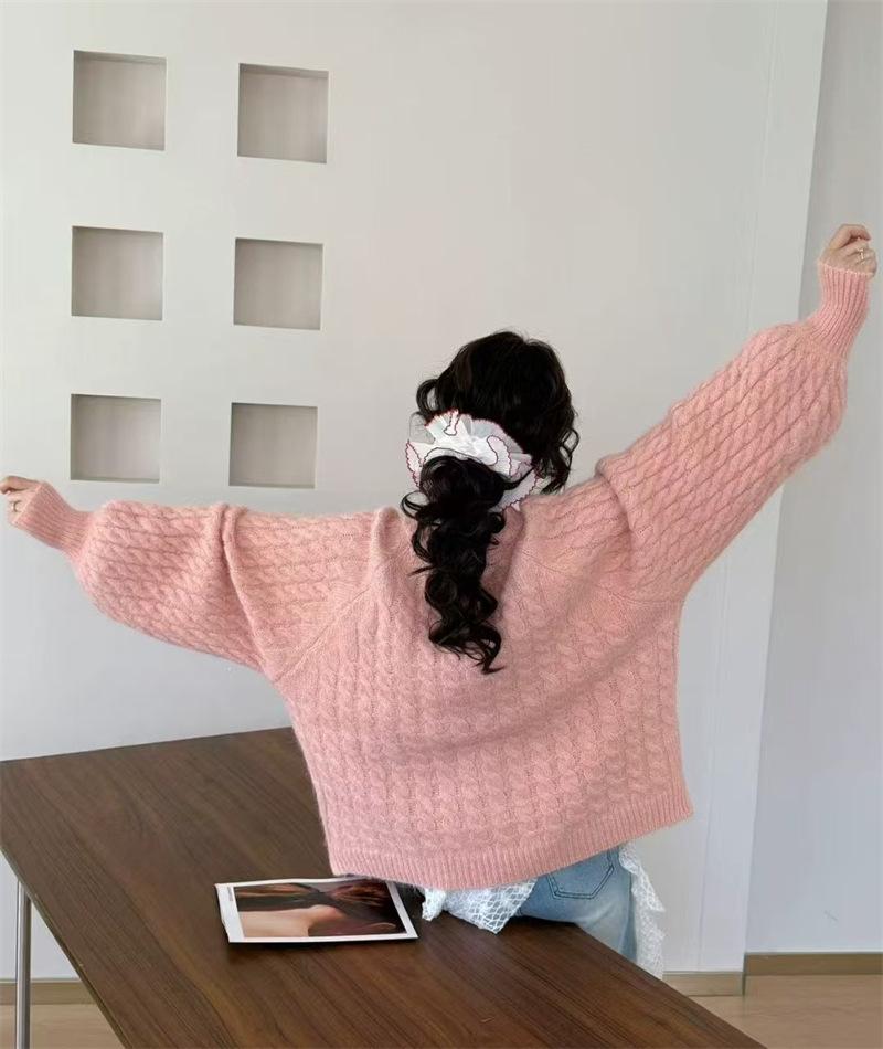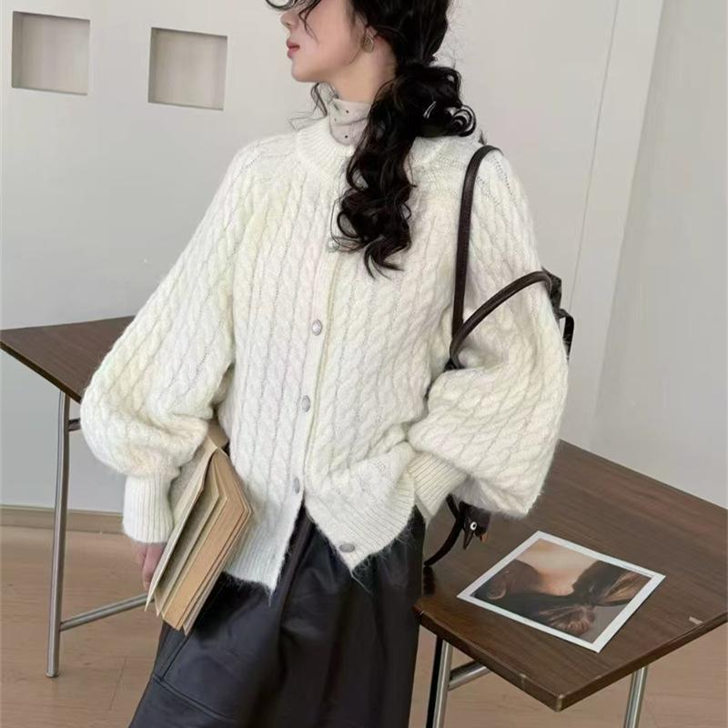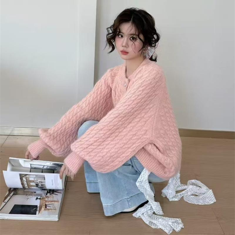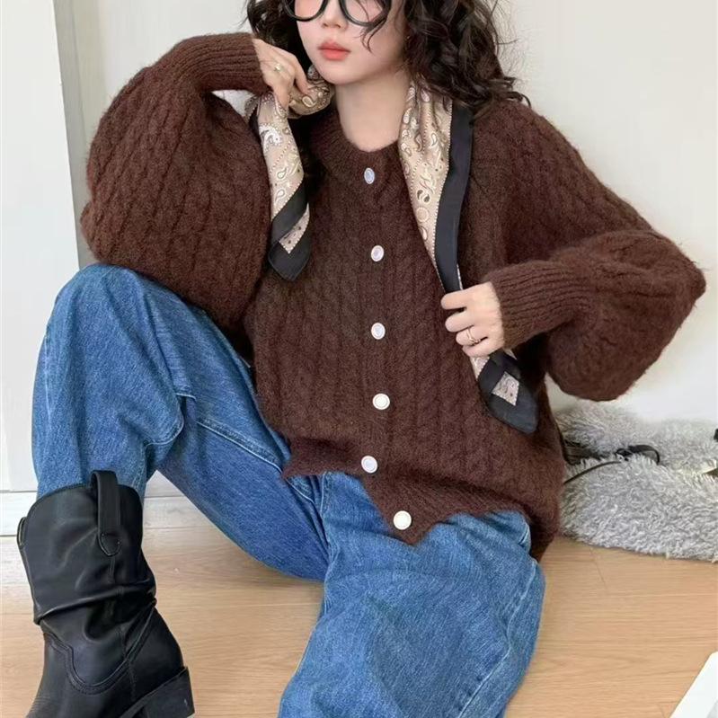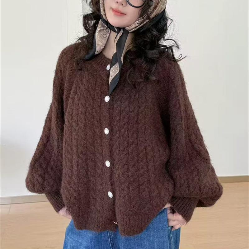 Suéter de Punto Trenzado de Otoño/Invierno para Mujer 2025 Moda Coreana Diseño Holgado Cuello Redondo Manga Murciélago Cárdigan