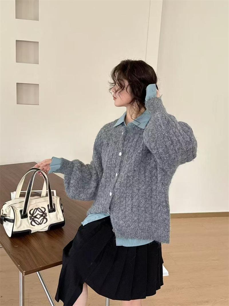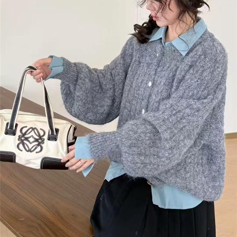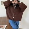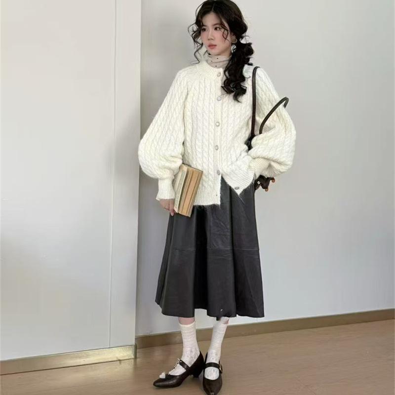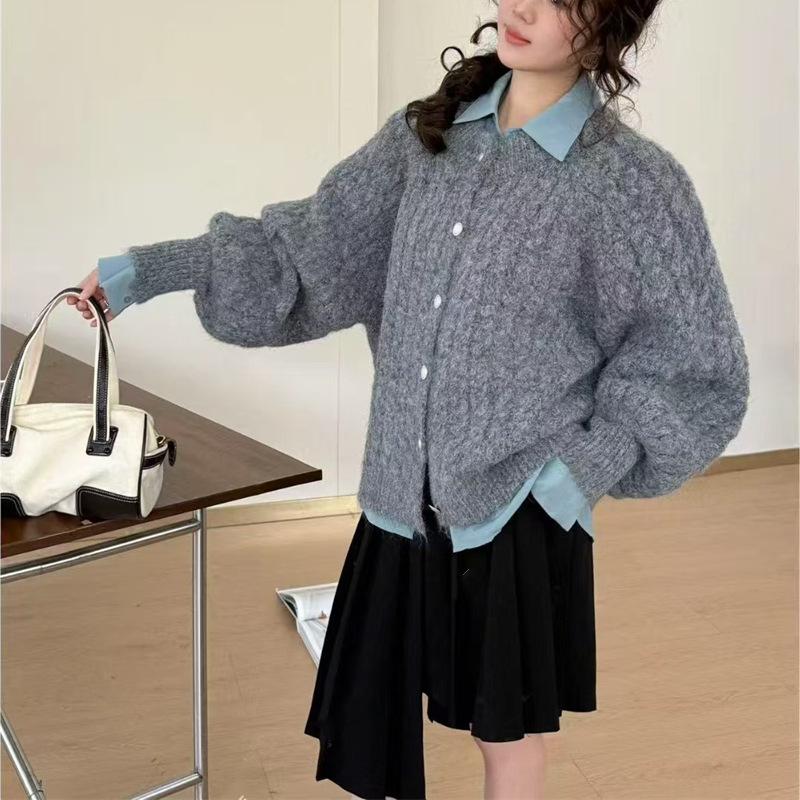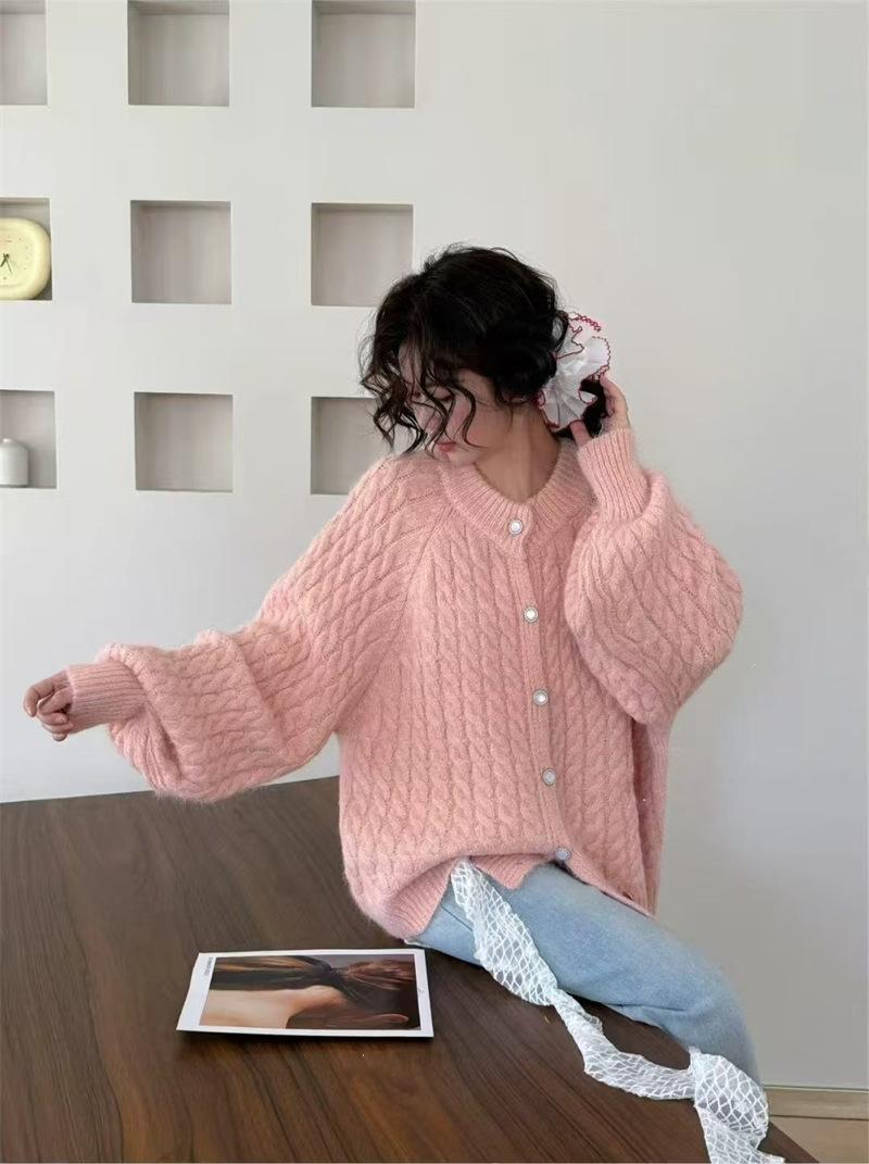 Suéter de Punto Trenzado de Otoño/Invierno para Mujer 2025 Moda Coreana Diseño Holgado Cuello Redondo Manga Murciélago Cárdigan
