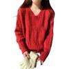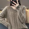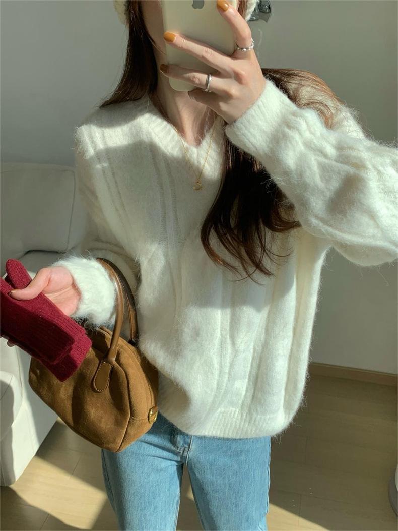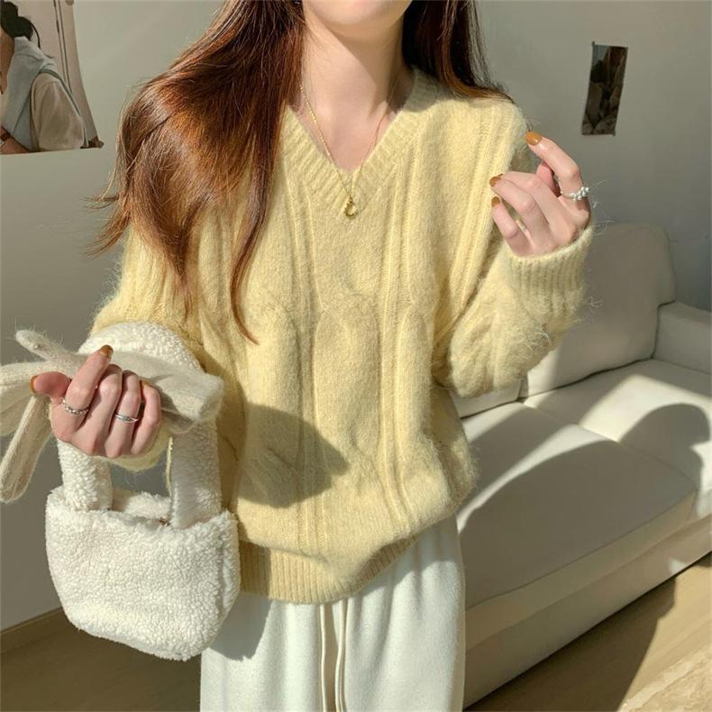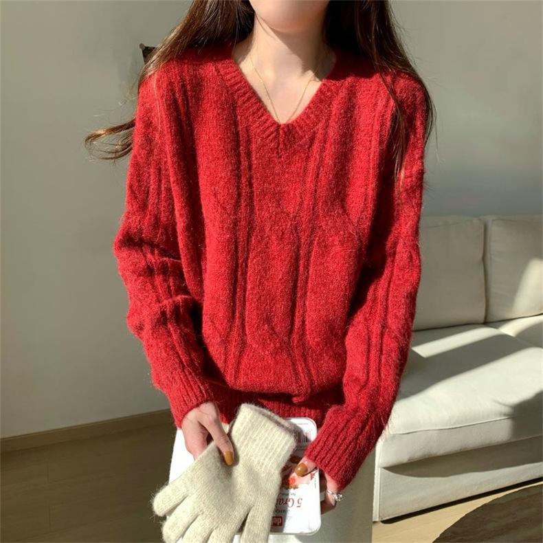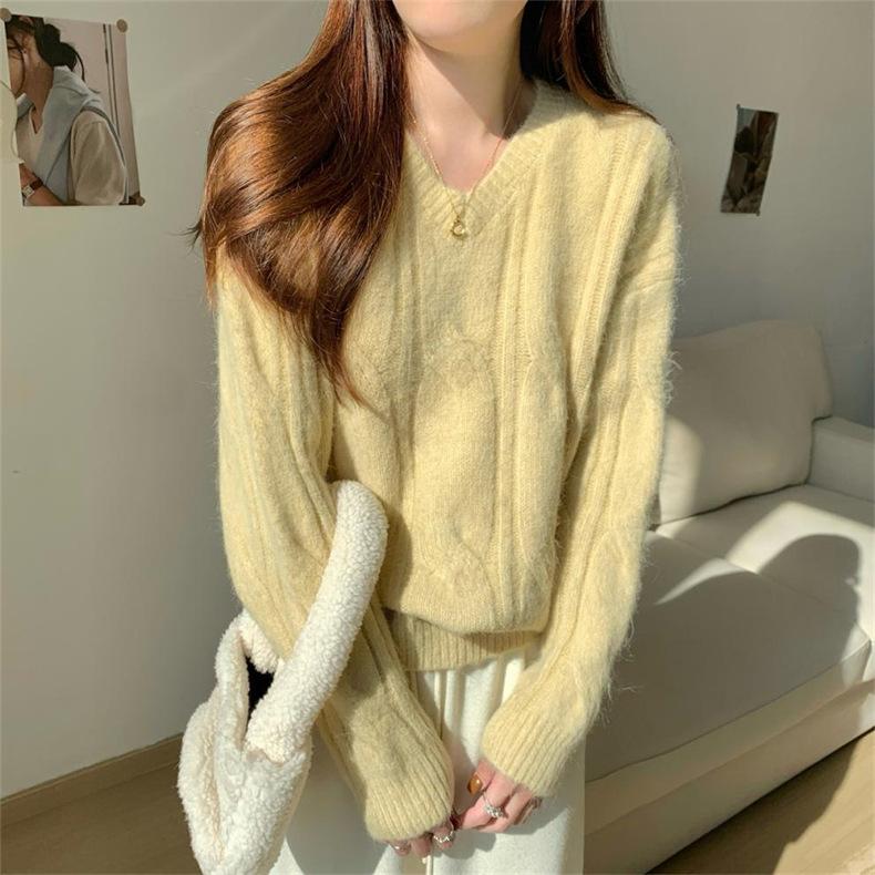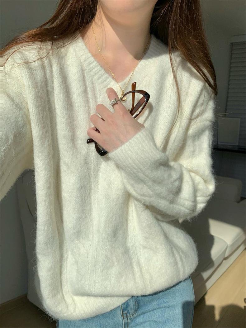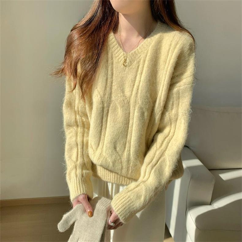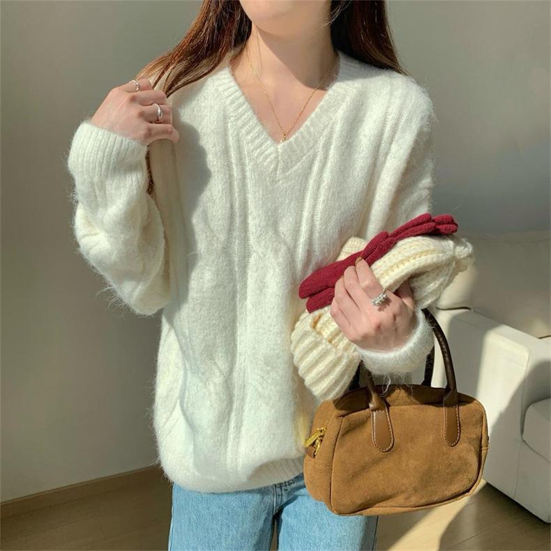 Suéter de Punto de Color Puro con Cuello en V para Mujer Otoño e Invierno 2025 Nuevo Grueso Suelto de Gama Alta Estilo Lazy Top