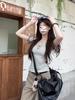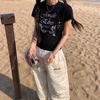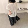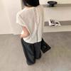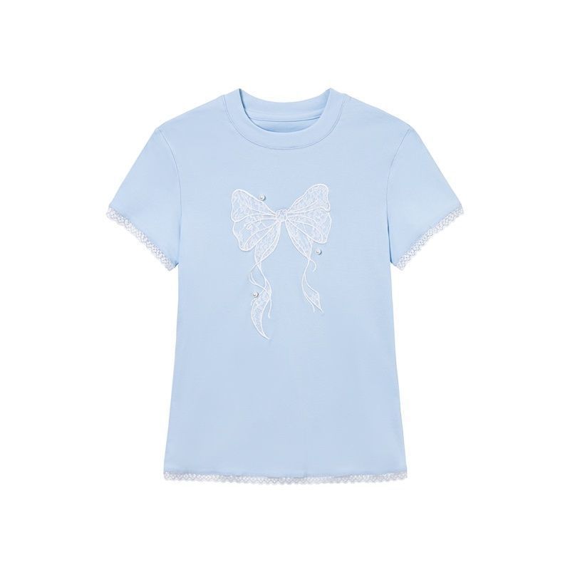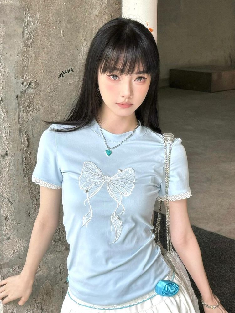Camiseta de Verano para Mujer de Manga Corta con Lazo y Encaje Estilo Americano de Hombro Derecho para Adelgazar Diseño de Mujer Estilo Sexy Top Ins