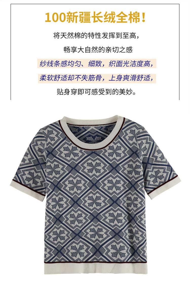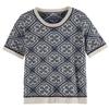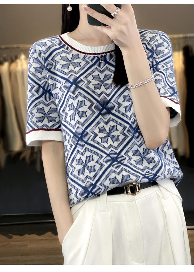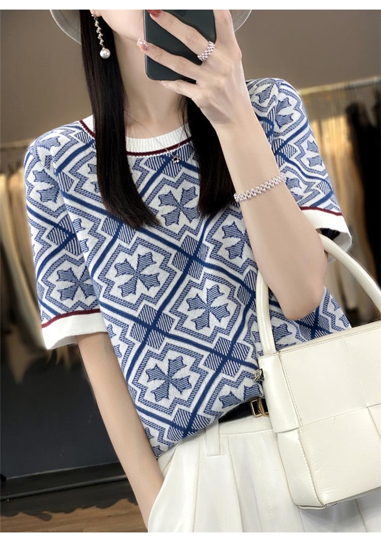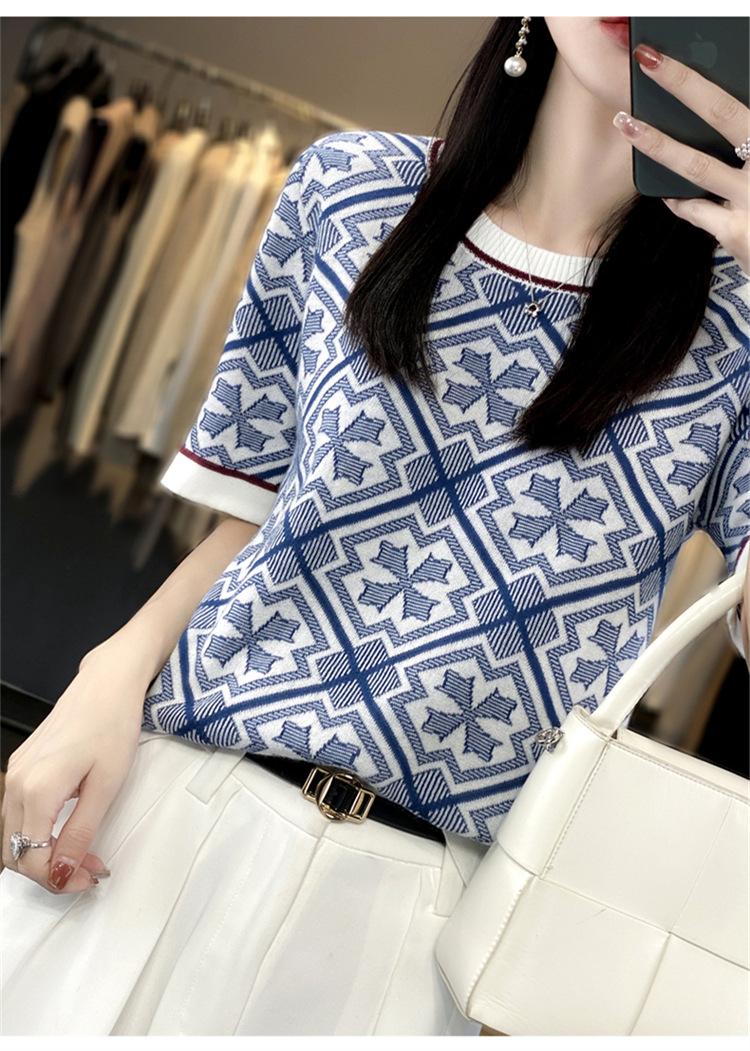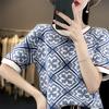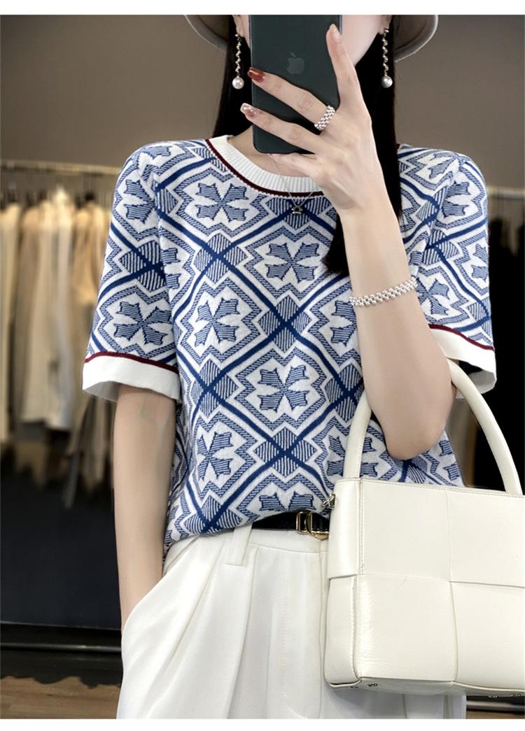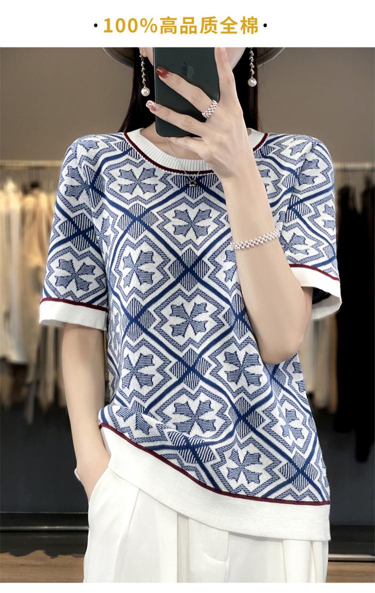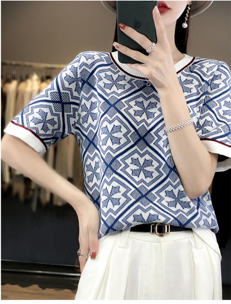 24 Verano Nuevo Algodón Azul y Blanco Porcelana Jacquard Camiseta de Punto para Mujer Manga Corta Cuello Redondo Jersey Camiseta Básica de Punto