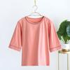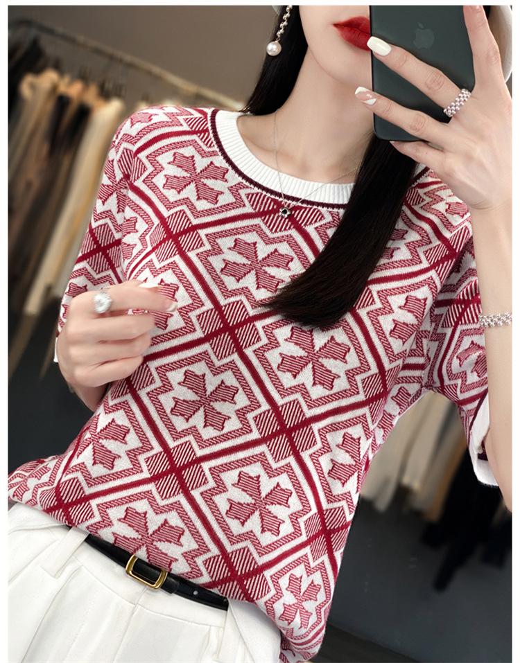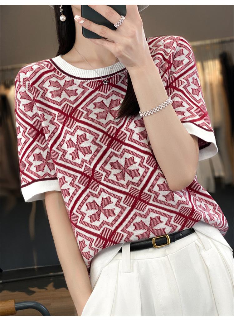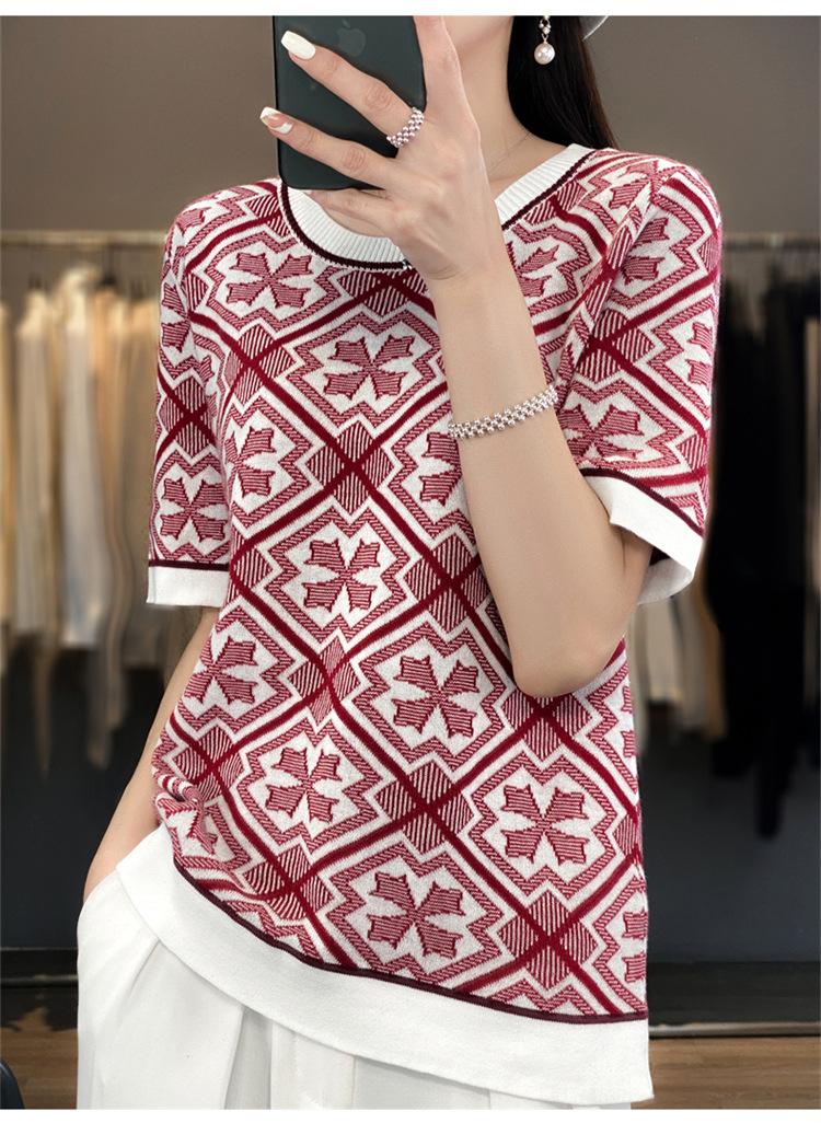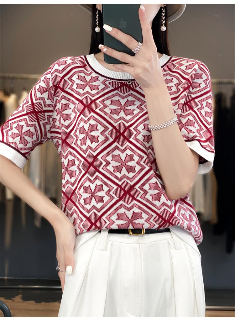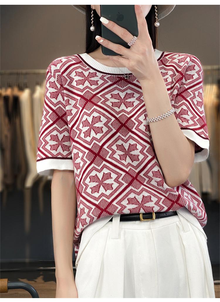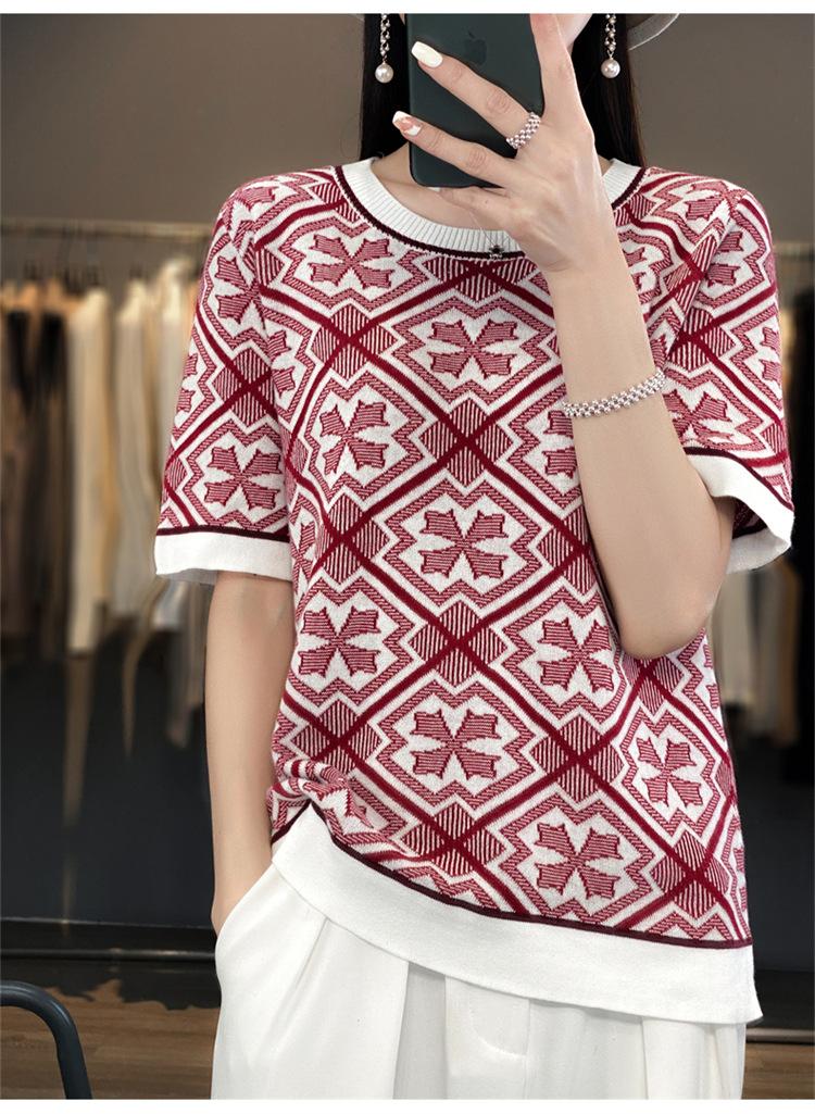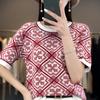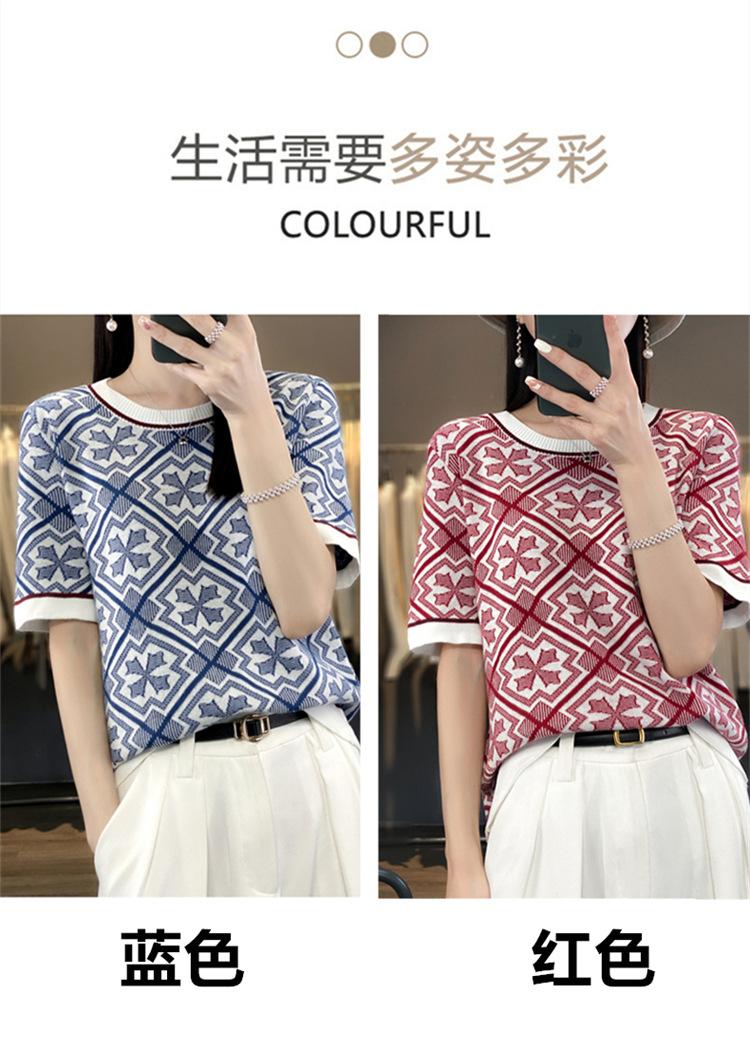 24 Verano Nuevo Algodón Azul y Blanco Porcelana Jacquard Camiseta de Punto para Mujer Manga Corta Cuello Redondo Jersey Camiseta Básica de Punto