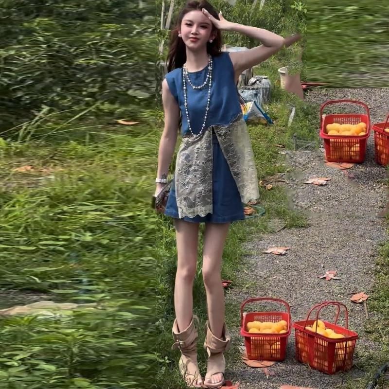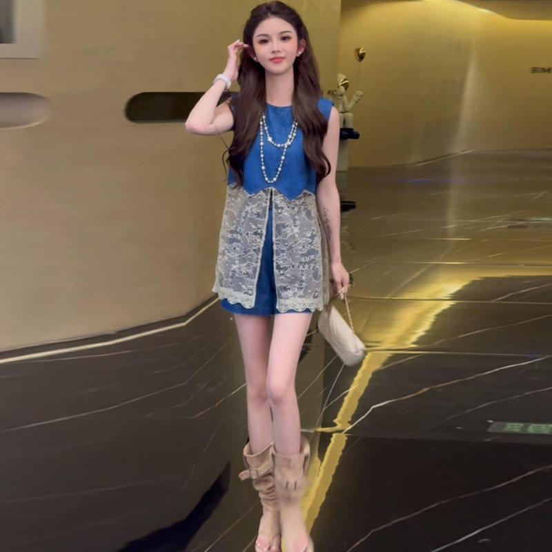 Traje de Moda para Mujer 2025 Verano Nuevo Estilo Adelgazante Encaje Empalmado Top sin Mangas Shorts Conjunto de Dos Piezas Trendy